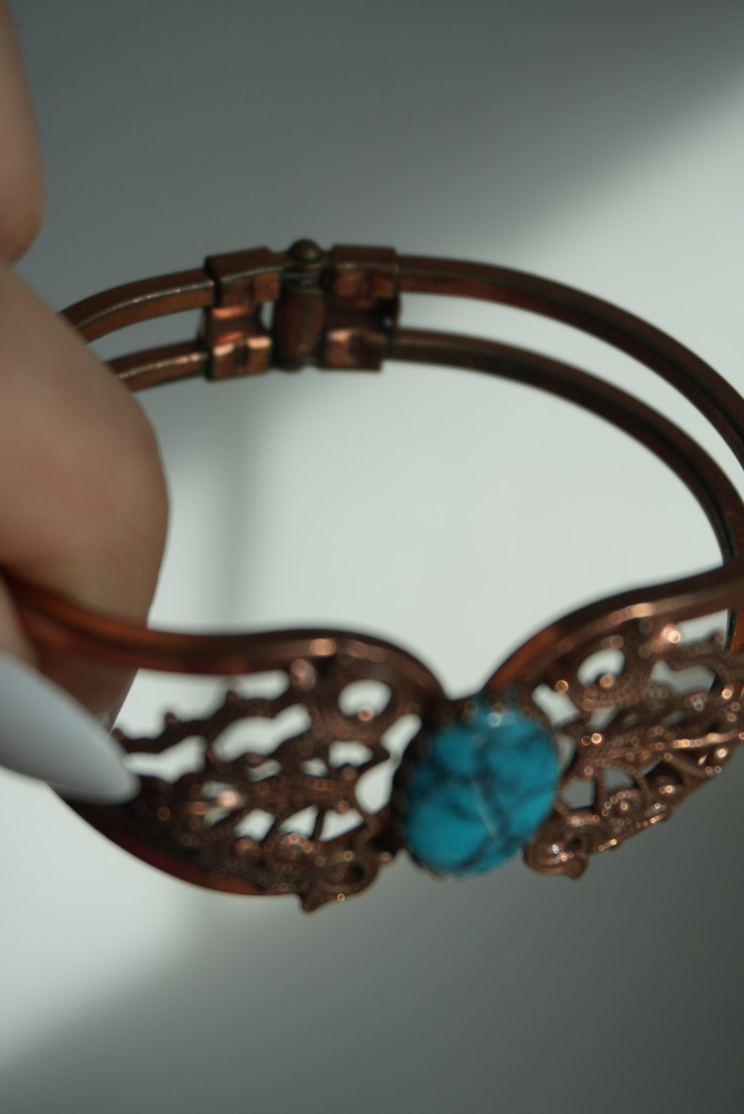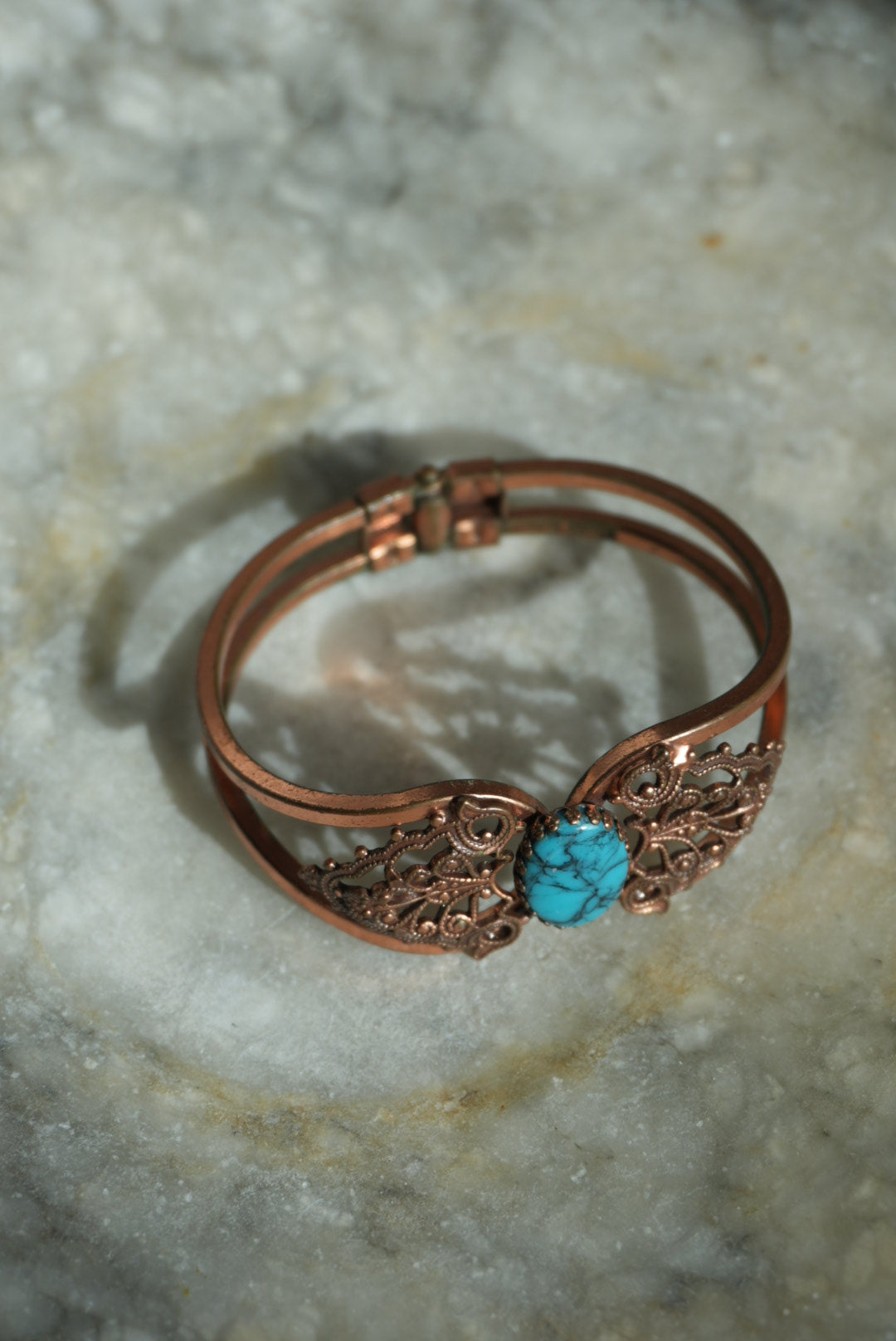 Solid Copper bangle with turquoise stone and hinge opening 2.25 inch diameter