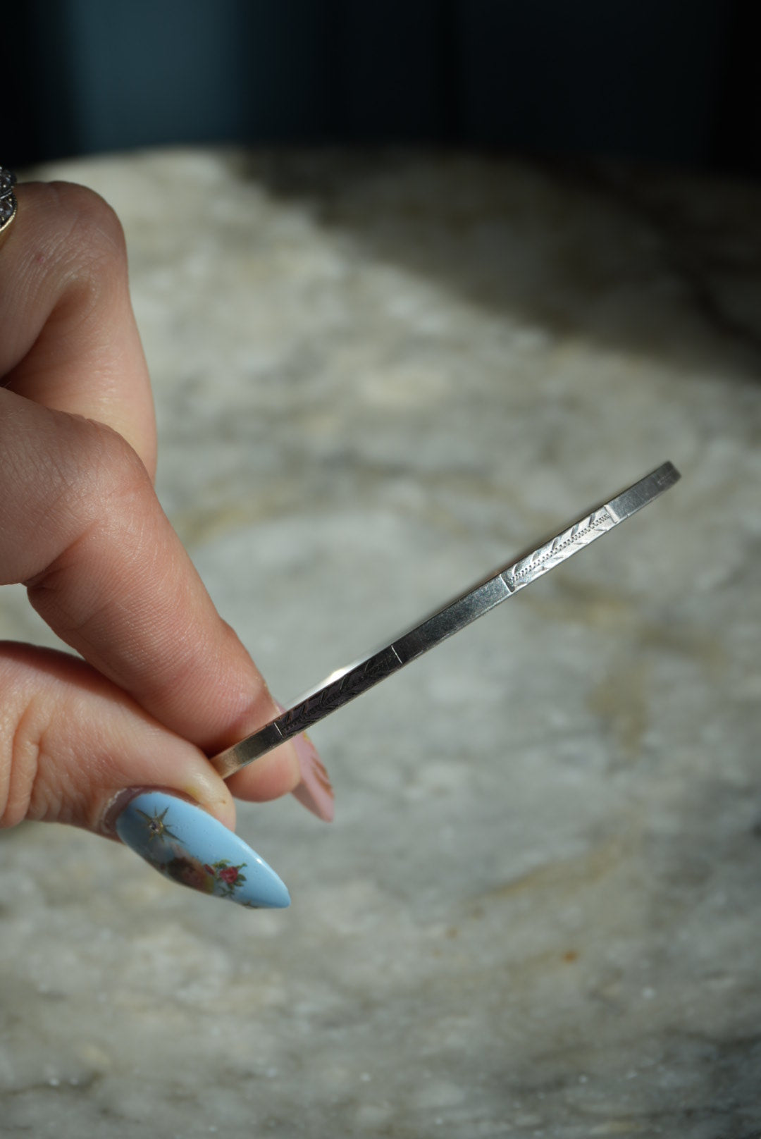 2.5 inch inner diameter solid sterling round bangle with etched design. Heavyweight !