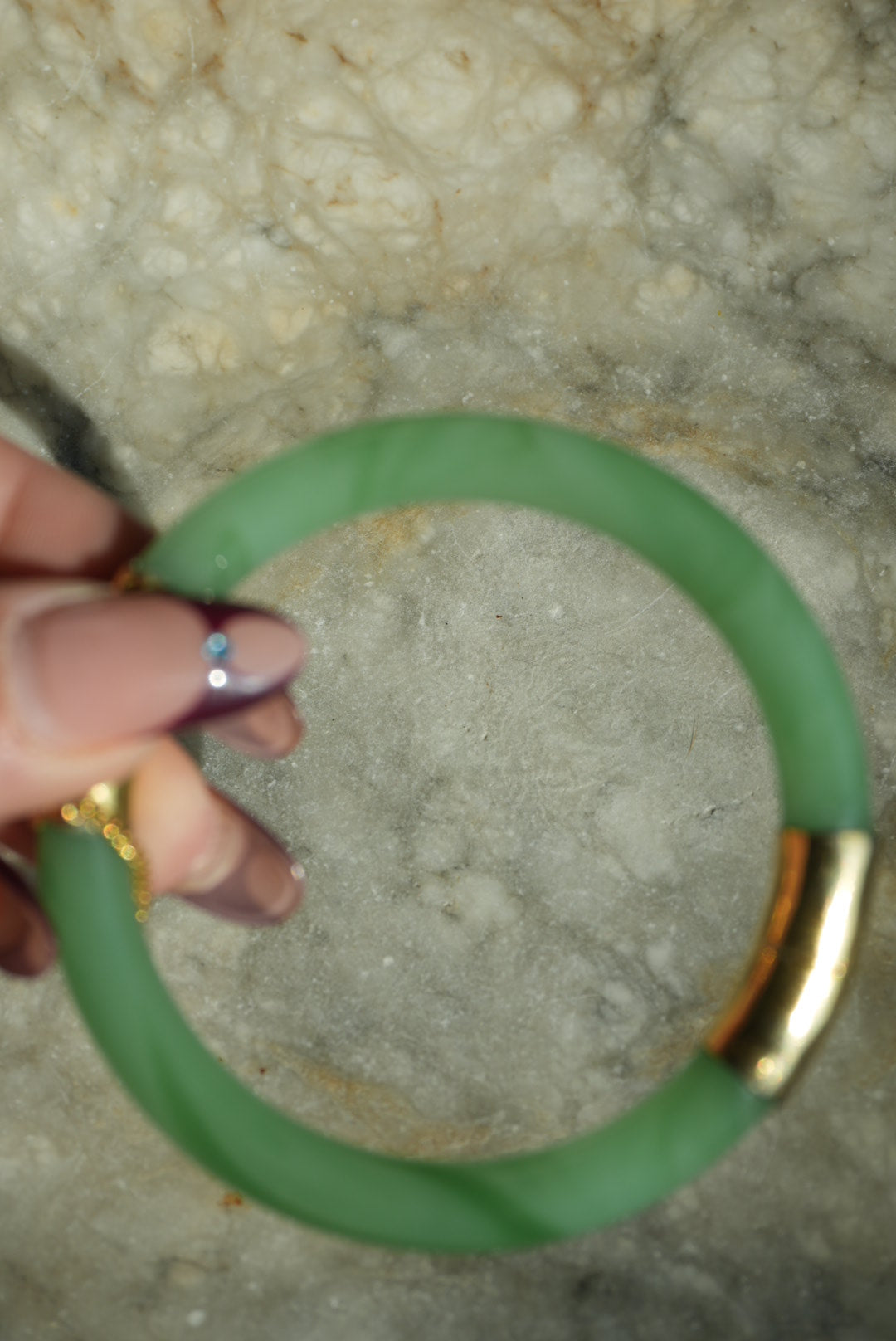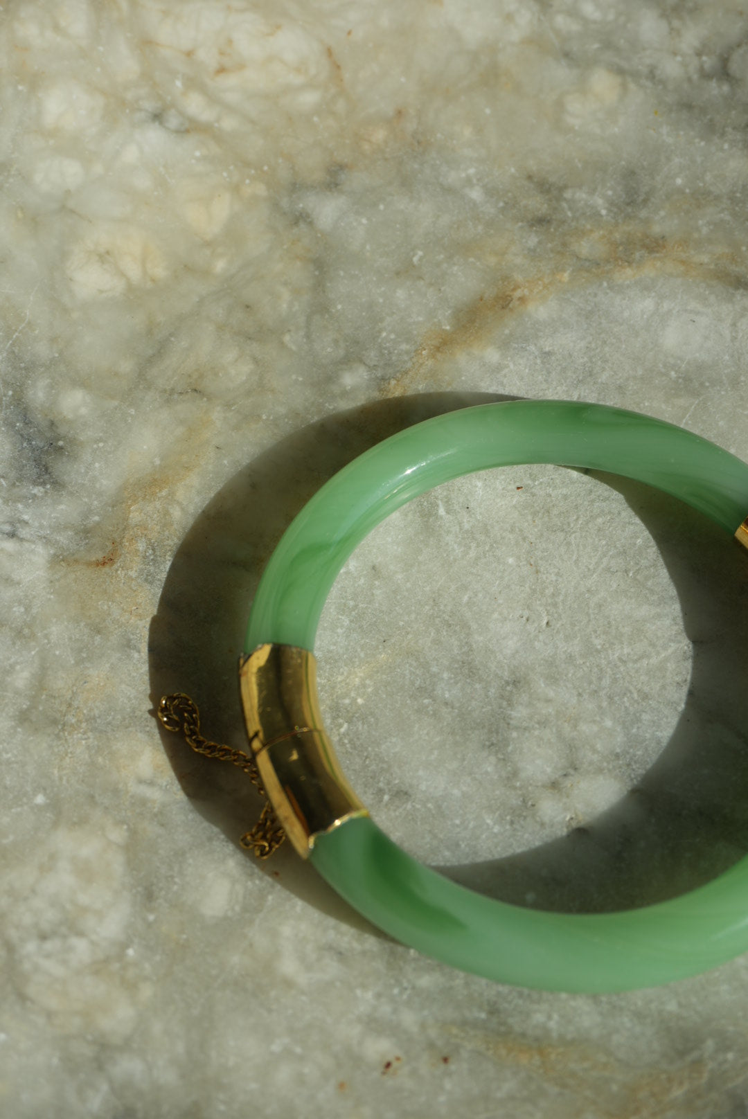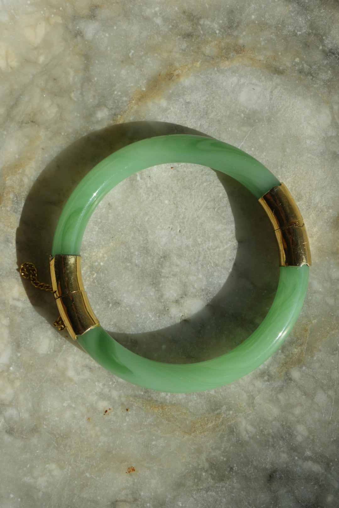 Simulated / glass “jade” bangle with gold plate hinge and closure. Safety chain not attached.
