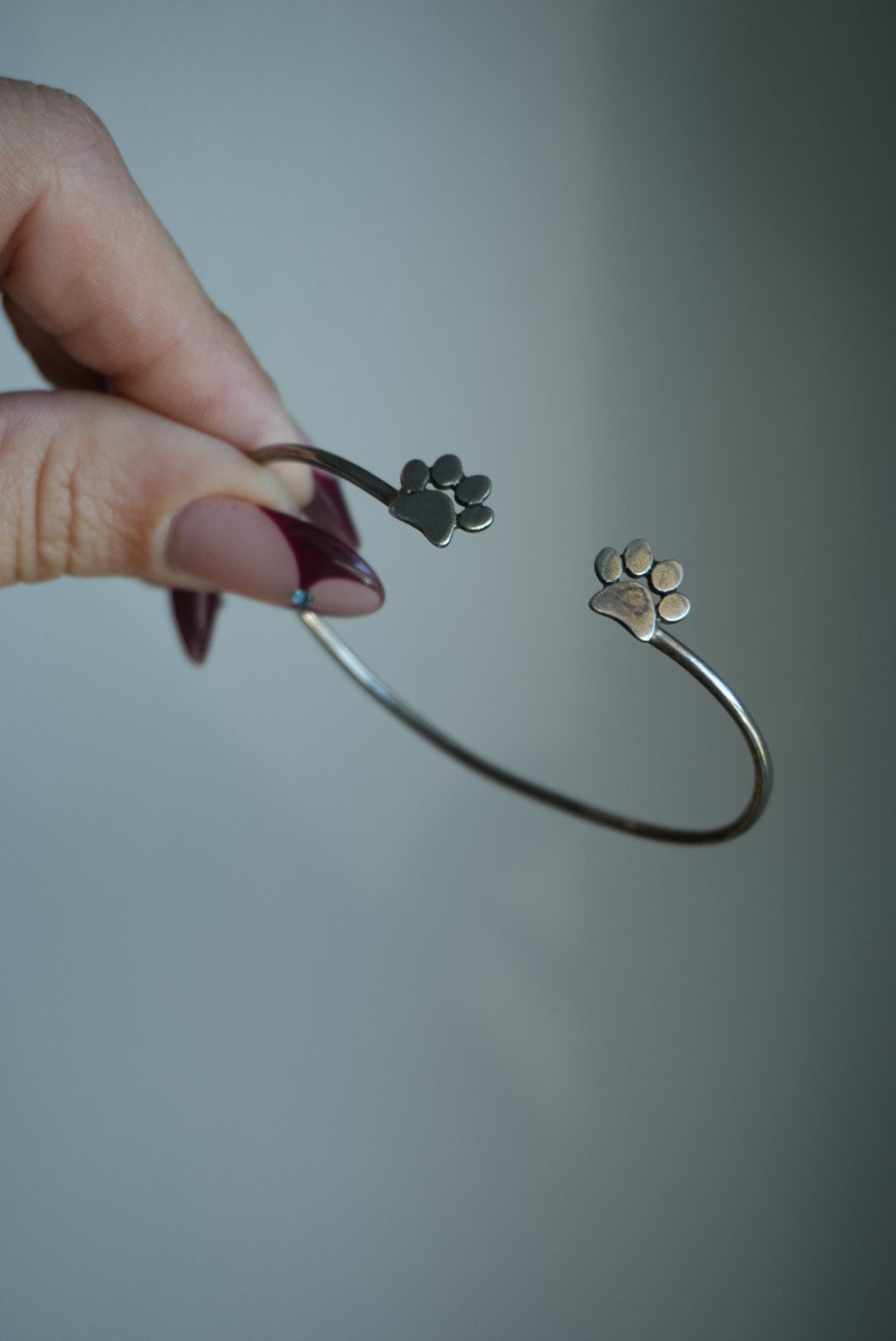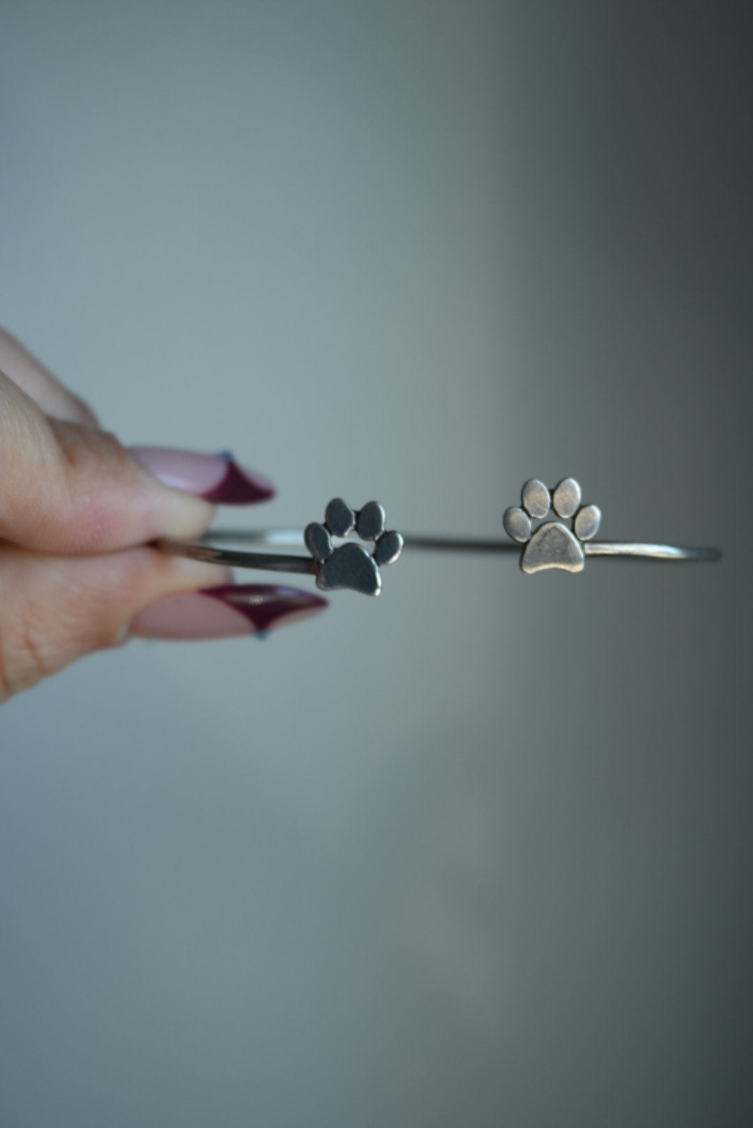 2.5 inch wide and 1.75 inch high open bangle with paws silver