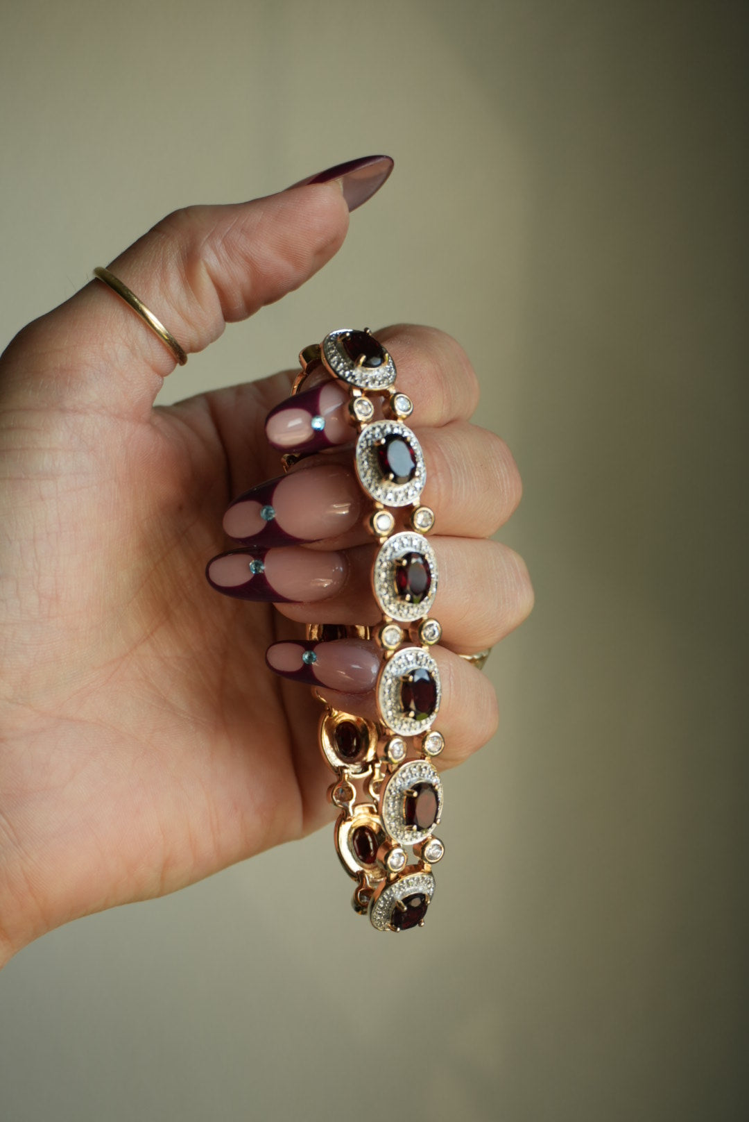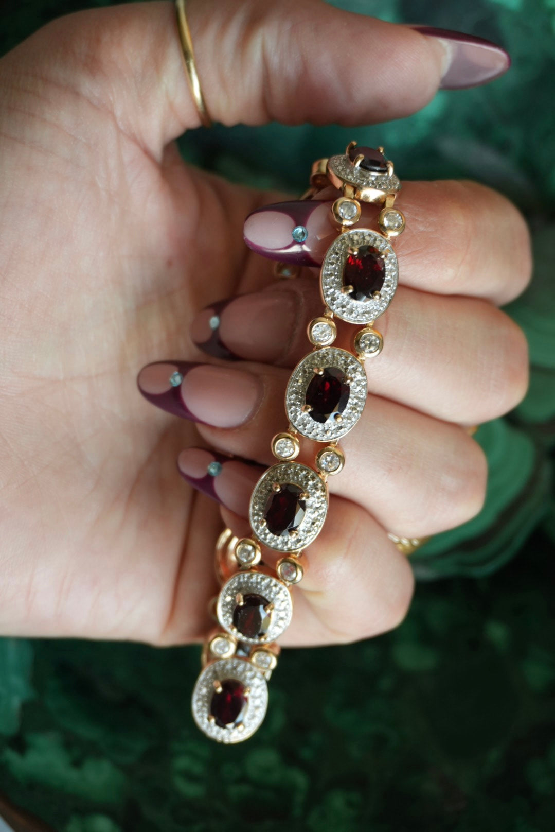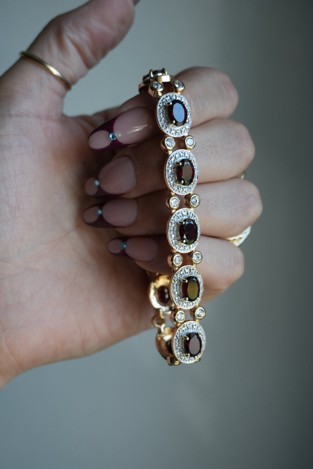 7.75 inch length garnet center stones and glass, all gold vermeil