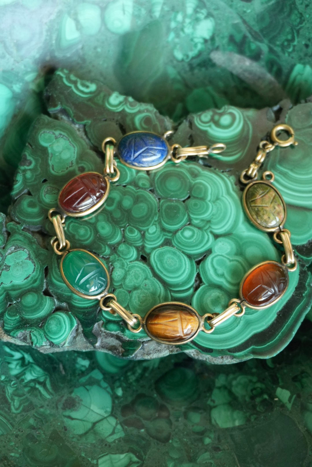 7.5 inch length gold fill bracelet with natural stone scarab beetles Condition: 8/10 patina from age on bracelet clasp / links