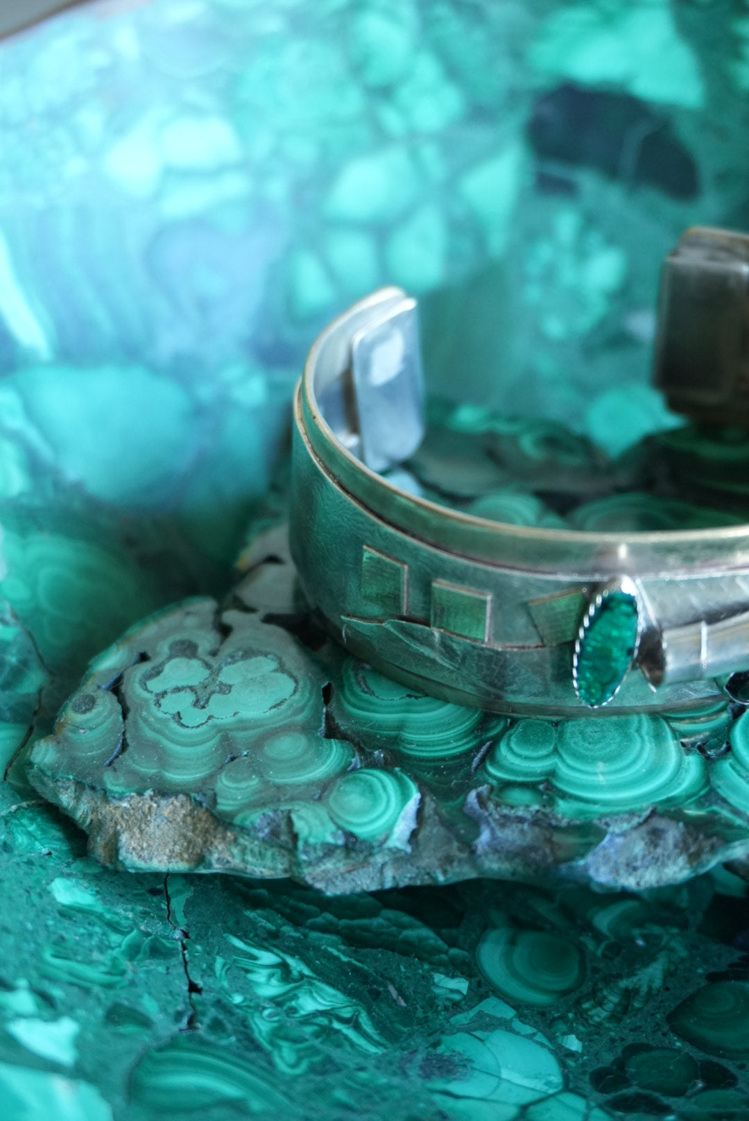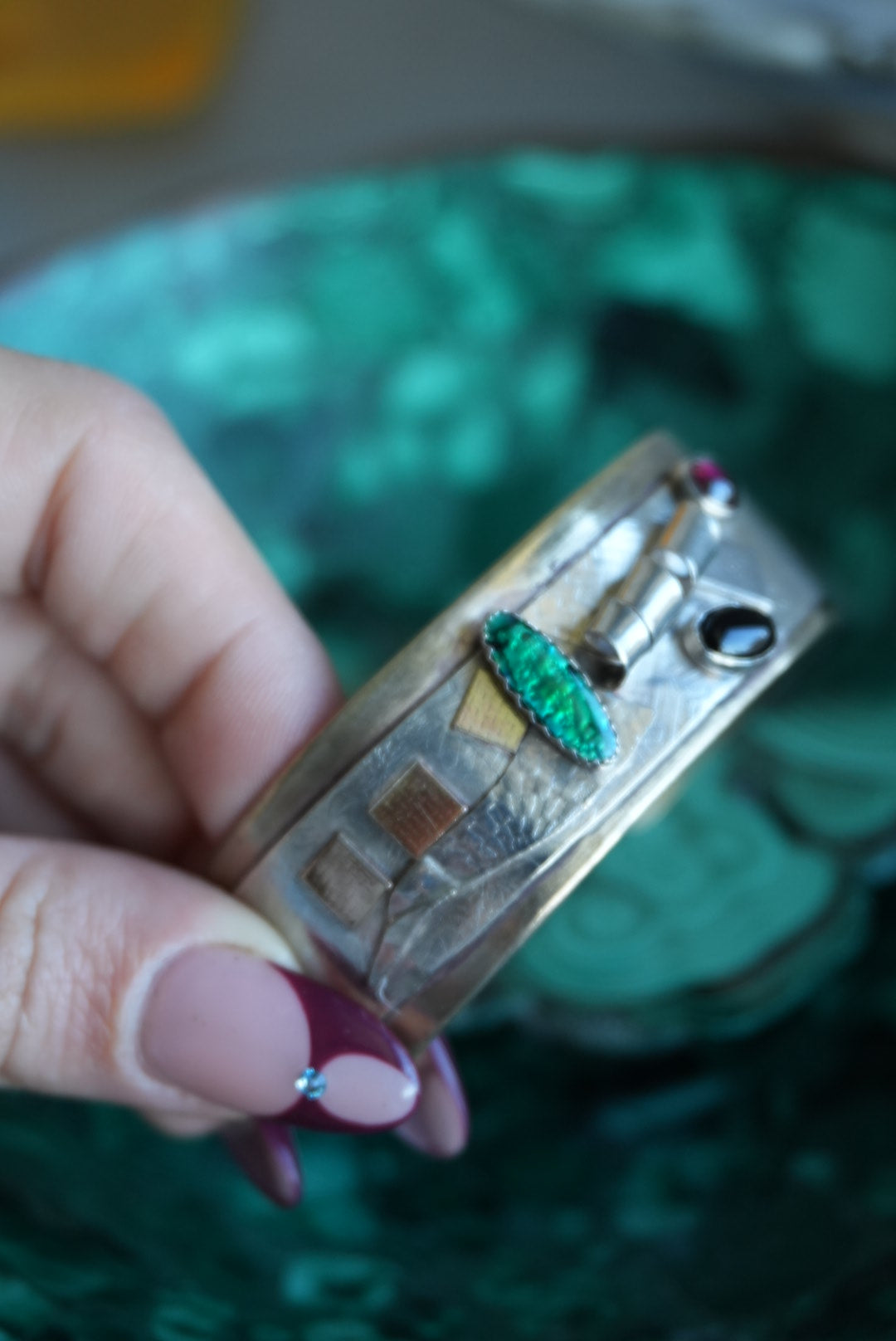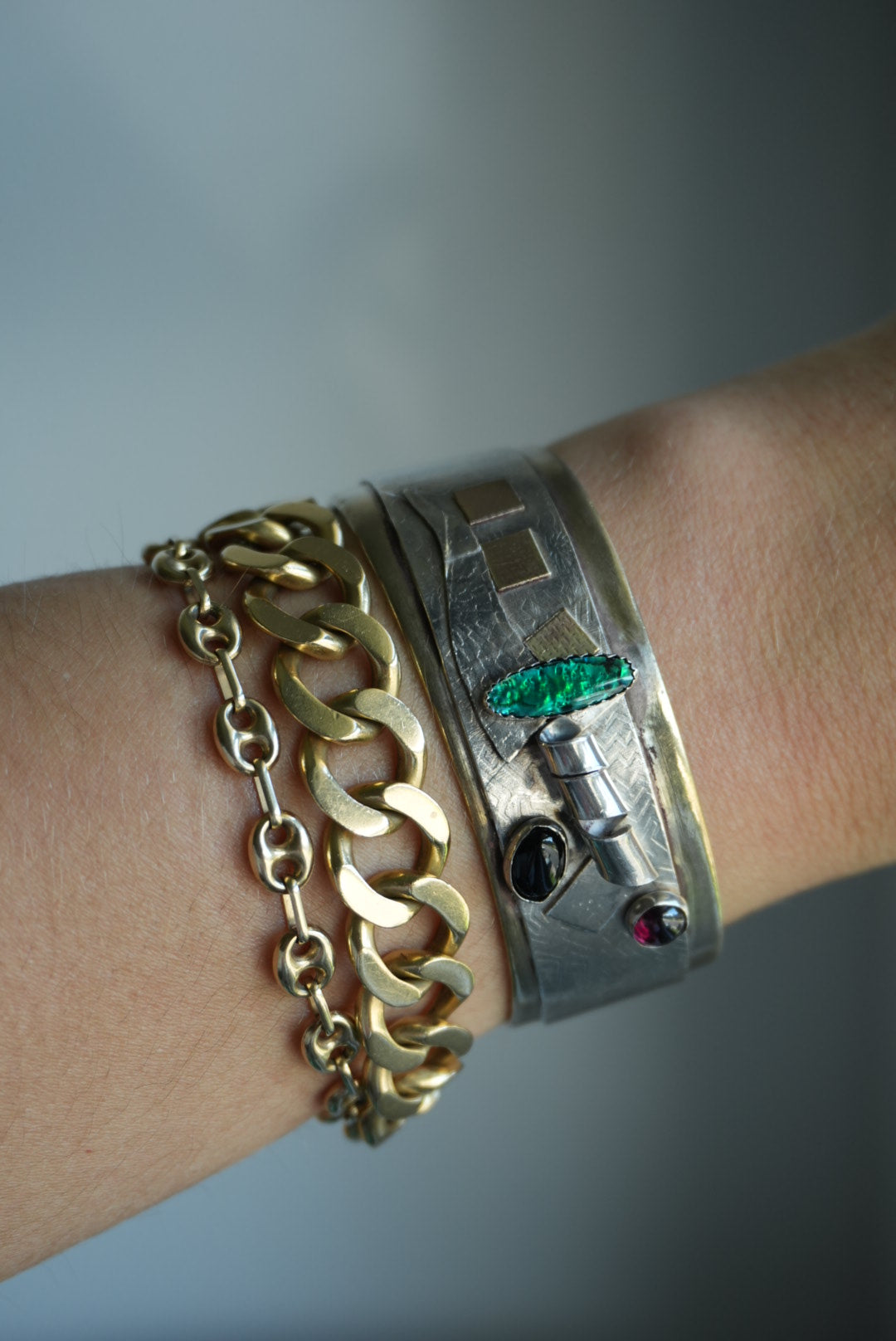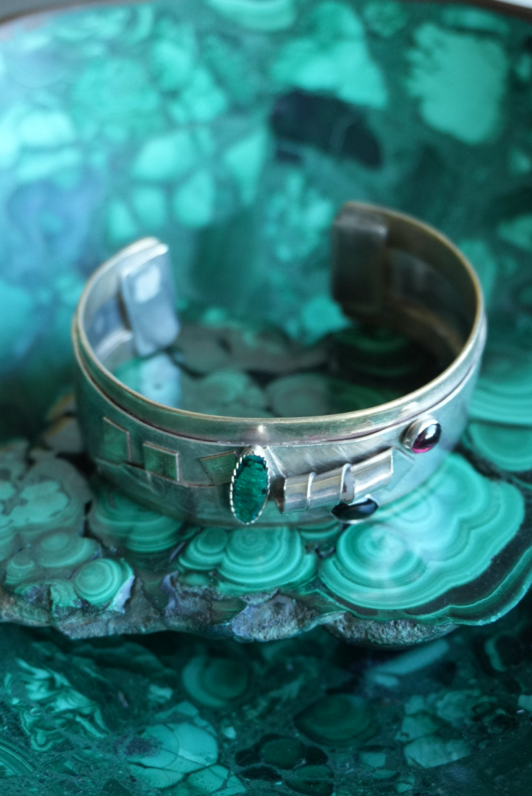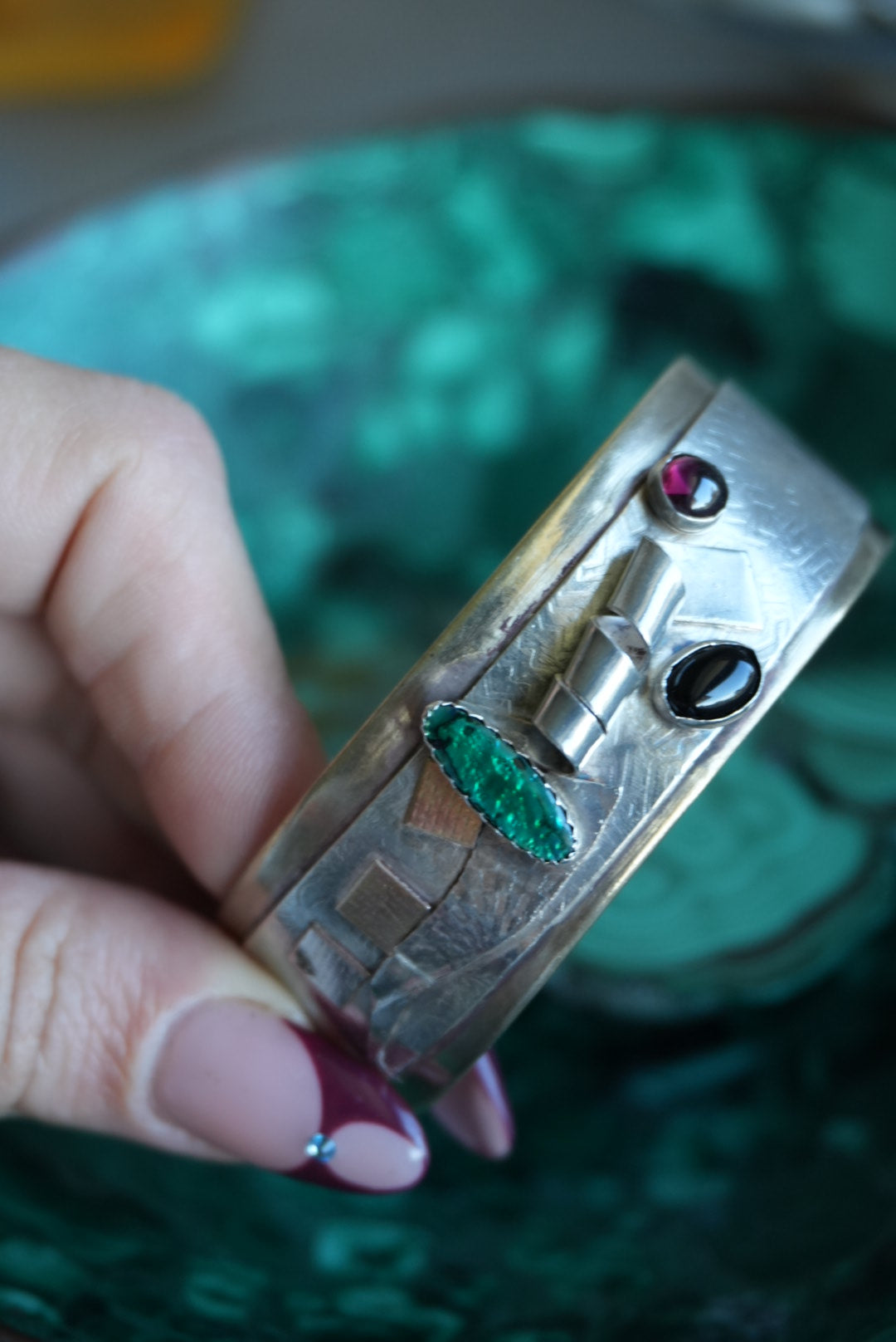hand made cuff with bezeled garnet and onyx 2.5 inch inner diameter and 1” width