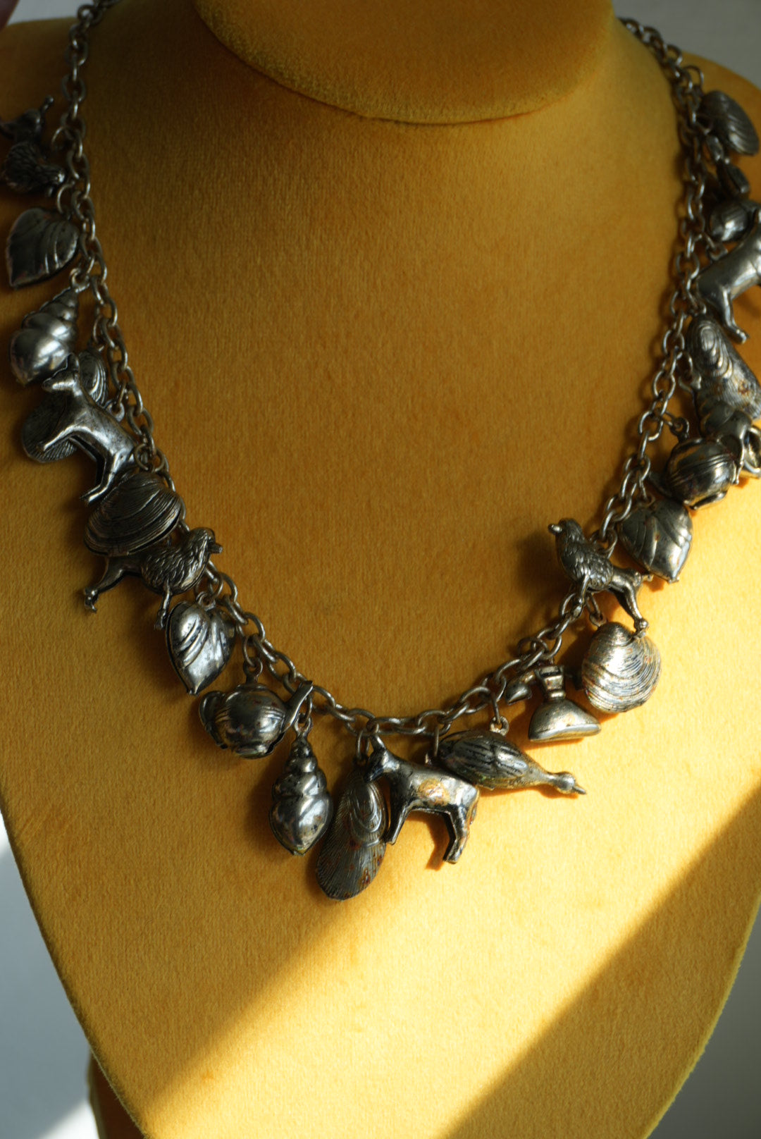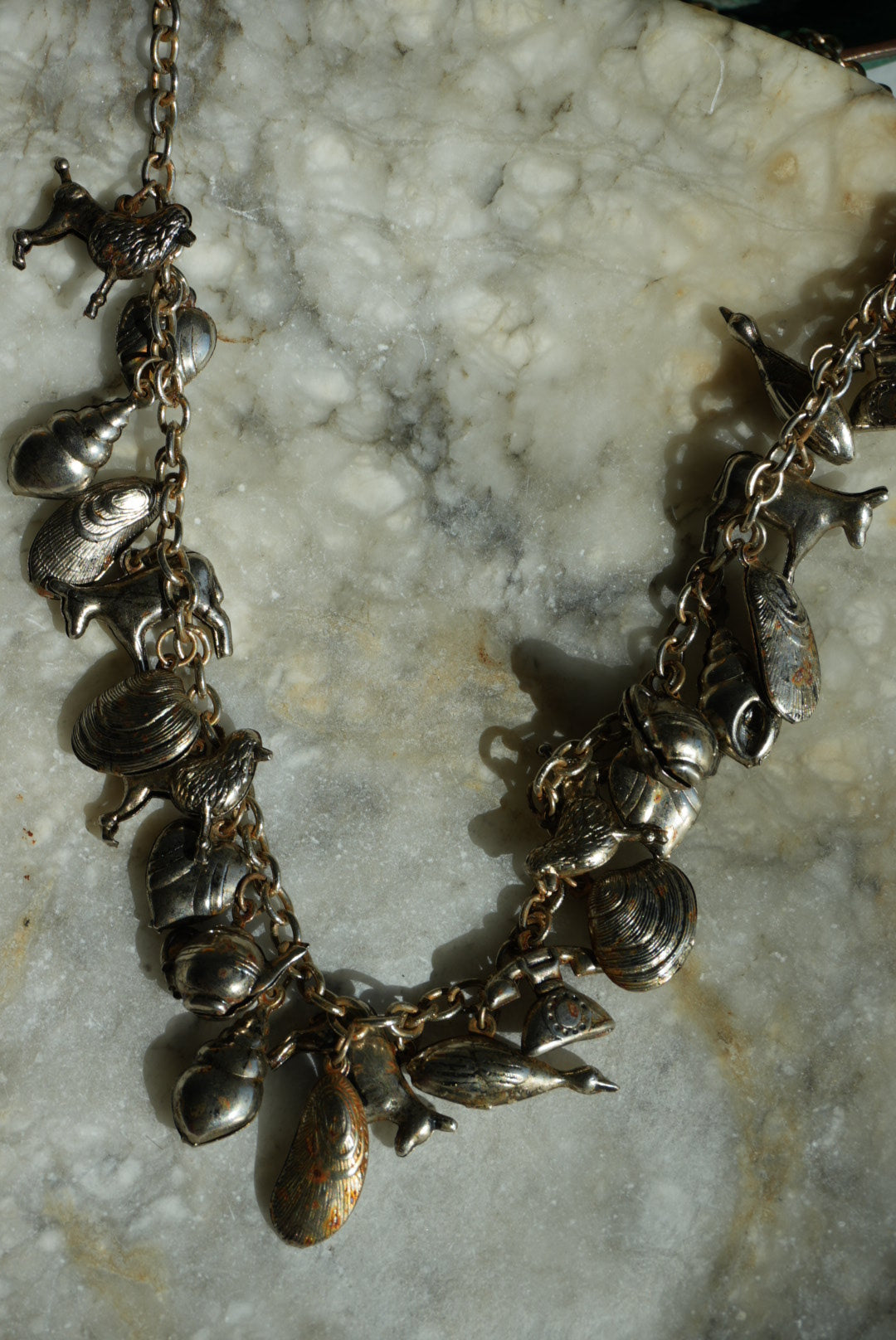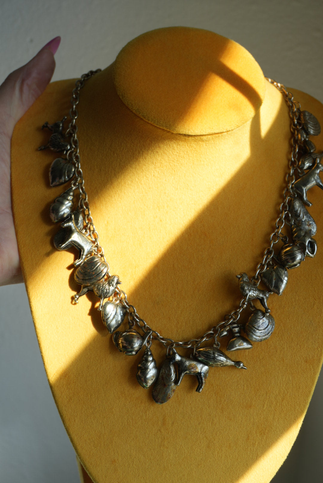 24” length vintage costume length shaker charm necklace with phone, mussels, poodles and hearts ! Condition: 5/10 some discoloration shown in photos