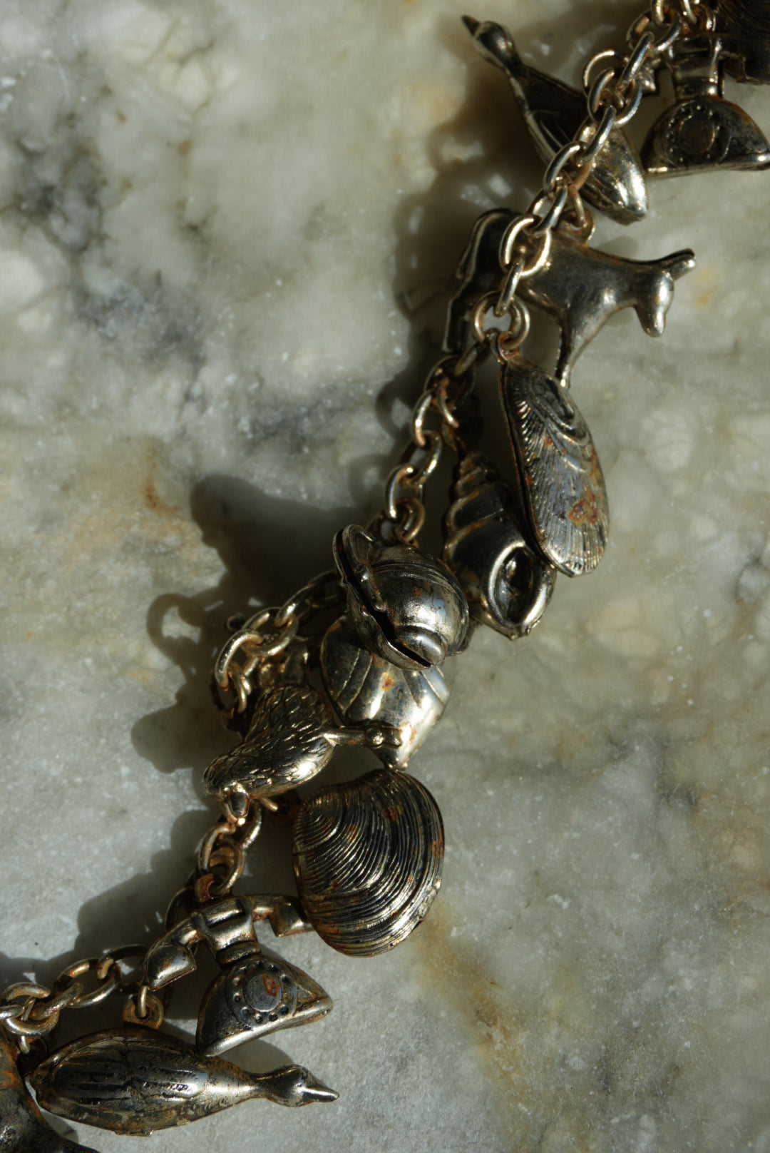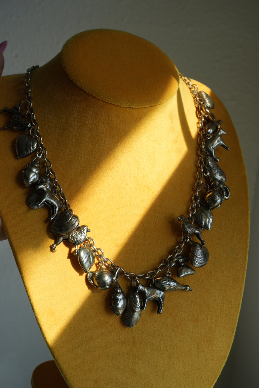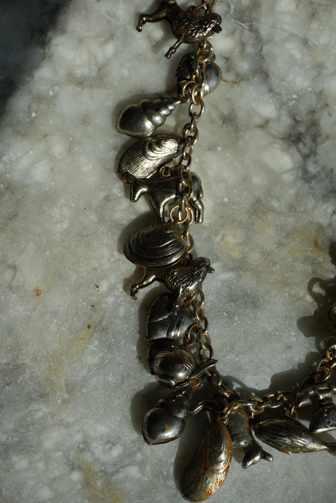 24” length vintage costume length shaker charm necklace with phone, mussels, poodles and hearts ! Condition: 5/10 some discoloration shown in photos
