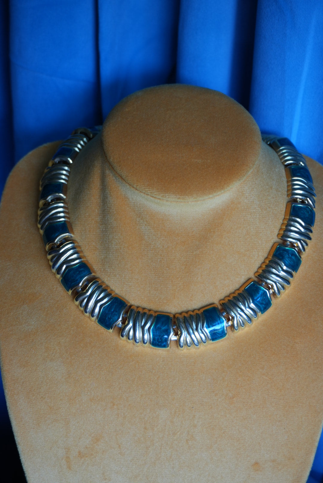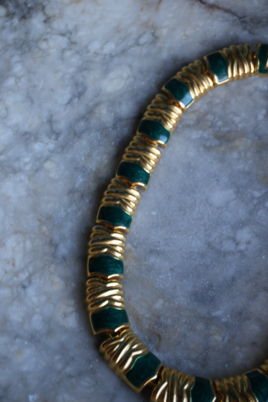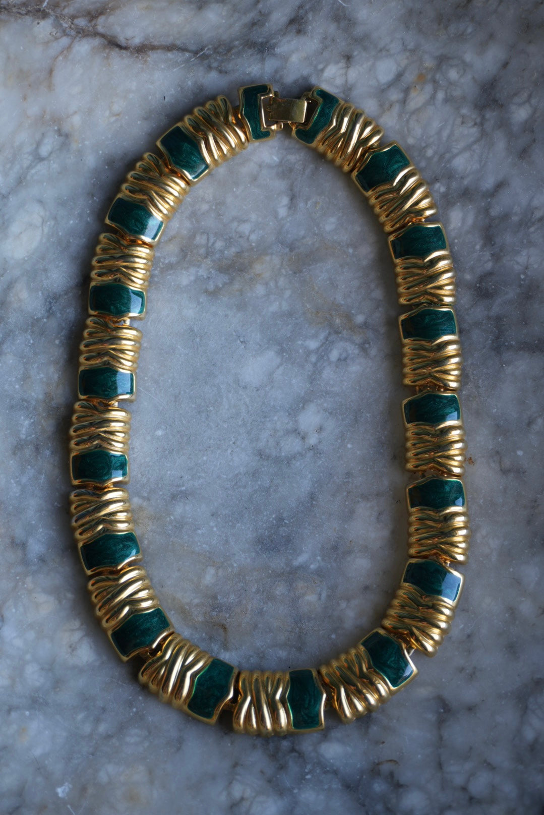 18” length and 0.7” wide links all gold plate with enamel to resemble malachite. Condition 8/10