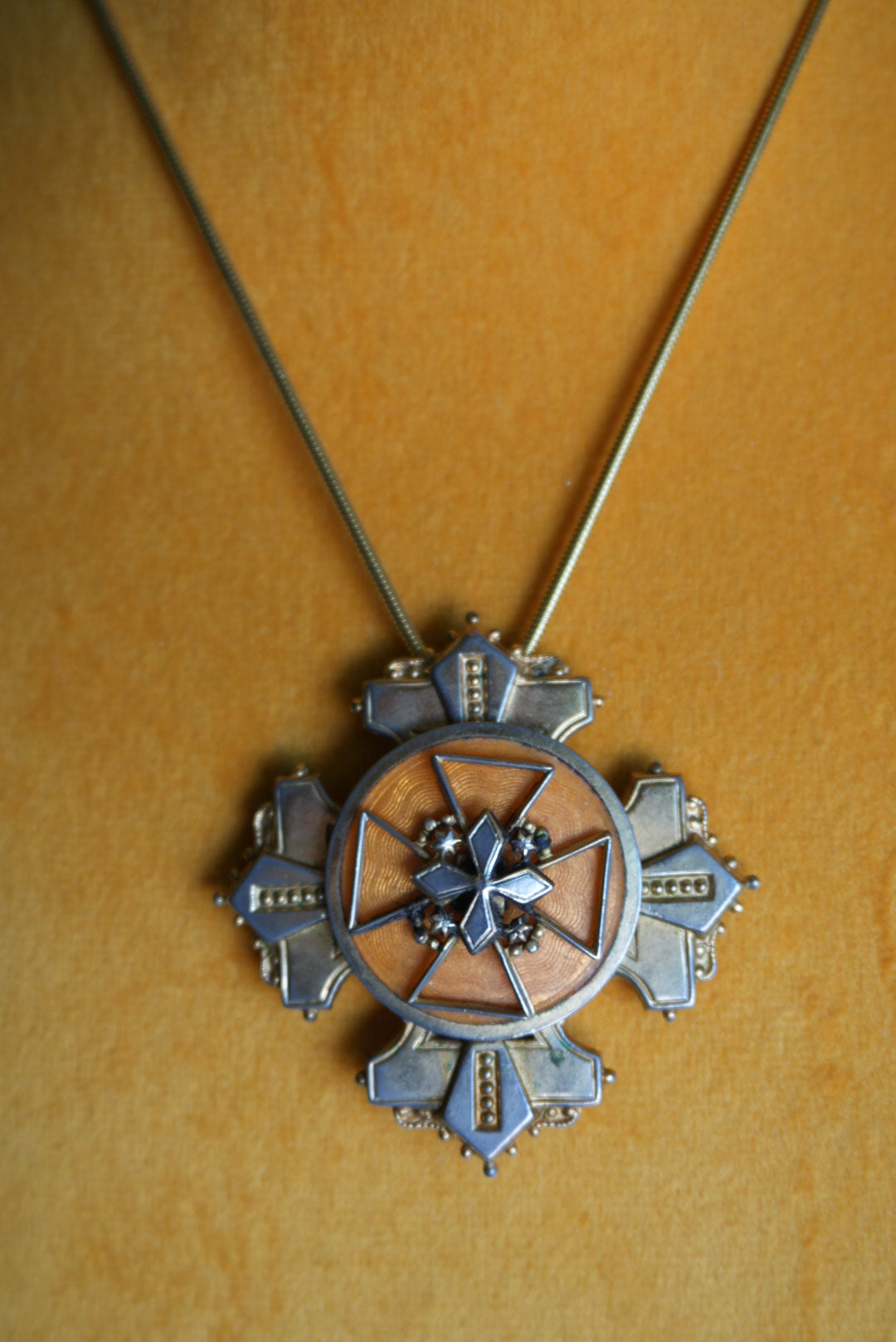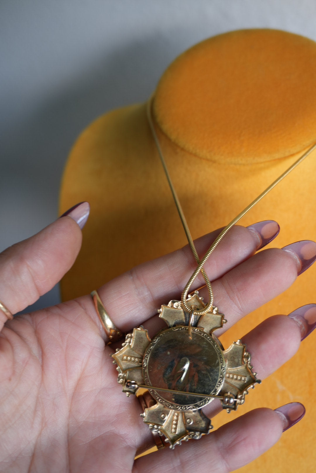 Vintage pendant on costume necklace with 15 inch length broach is 2” tall and can be worn on its own