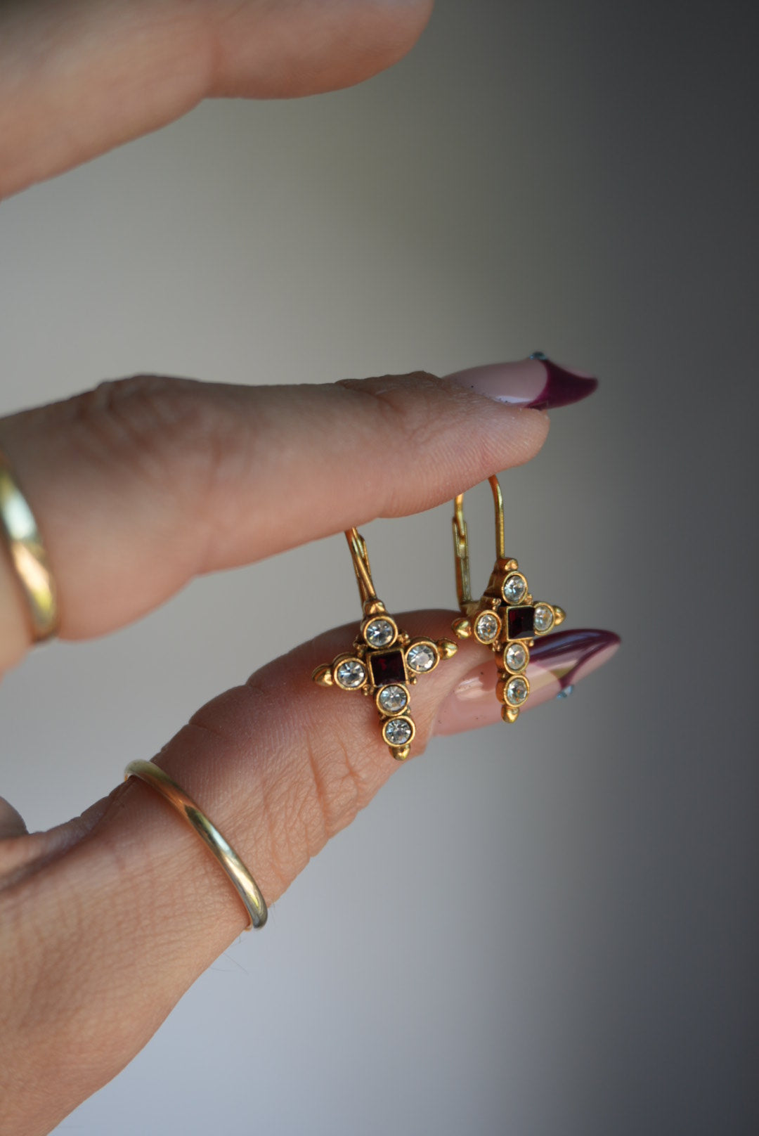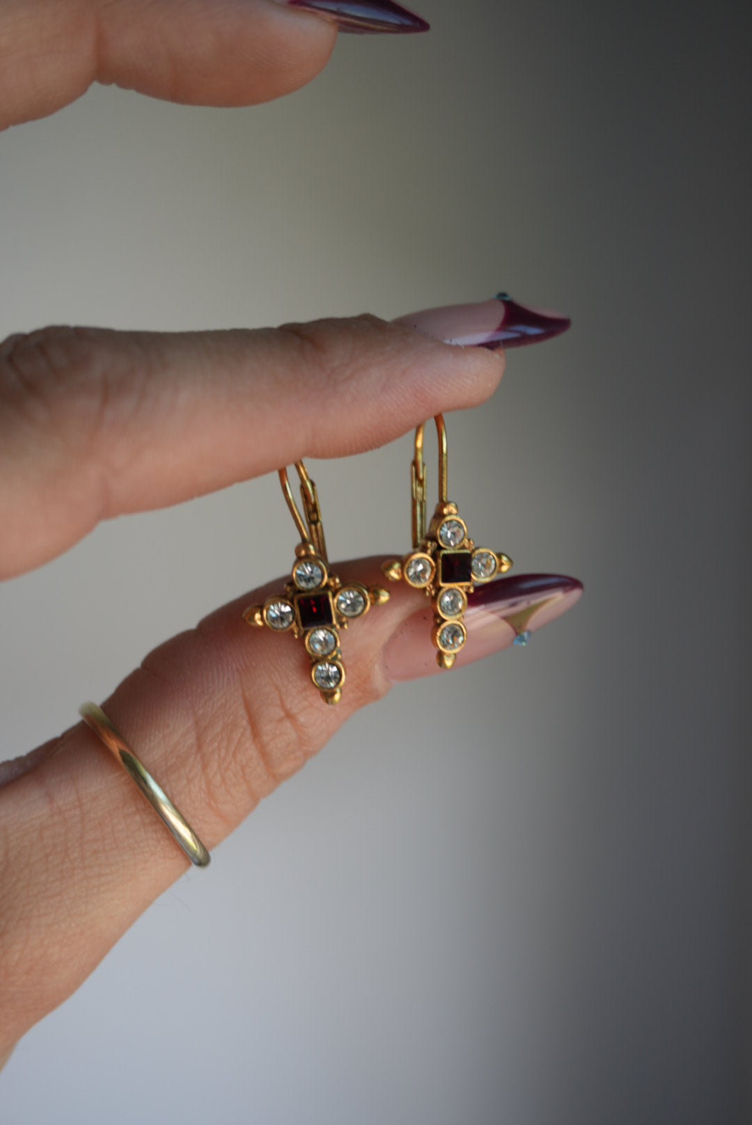 One inch tall gold plate costume cross earrings with rhinestones