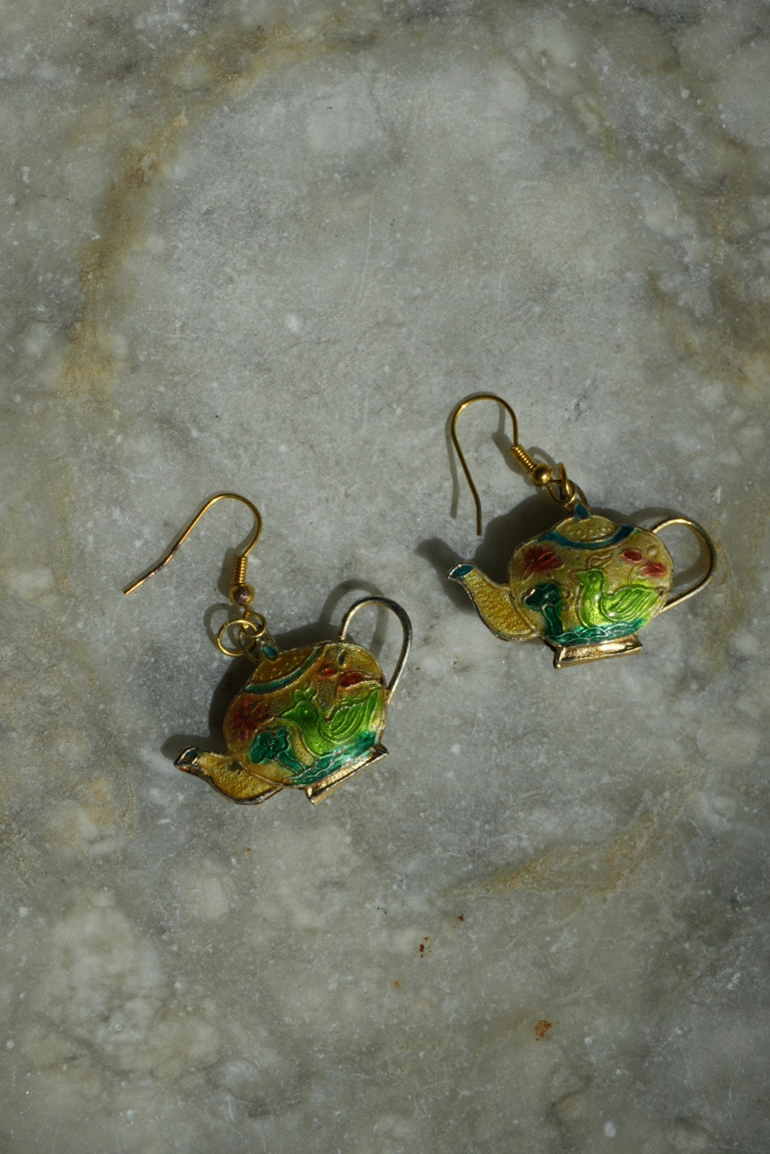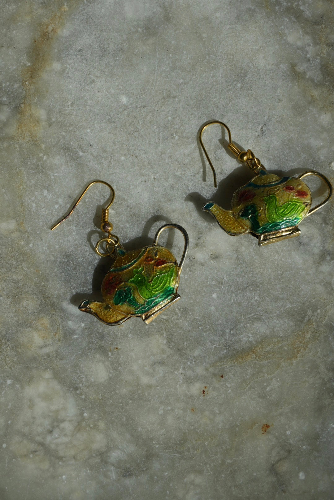 1.5 inch tall costume metal vintage cloisonné tea kettle earrings