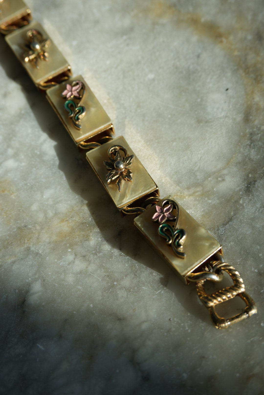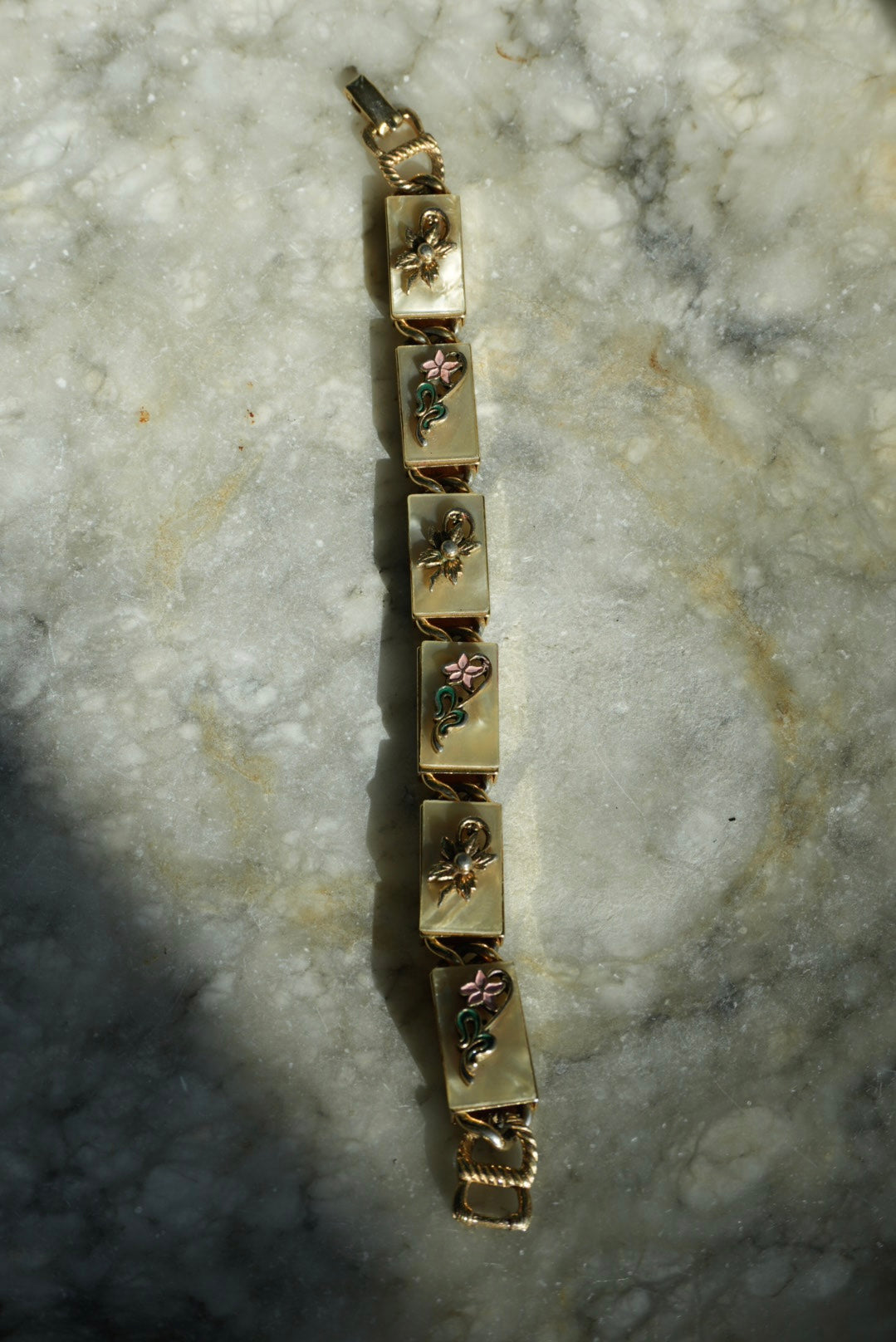 7.5 inch length insanely gorgeous bracelet vintage costume bars with mother of pearl and flower motif