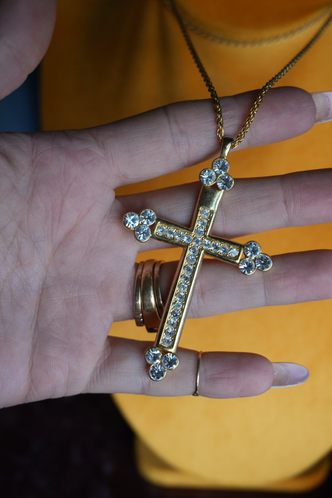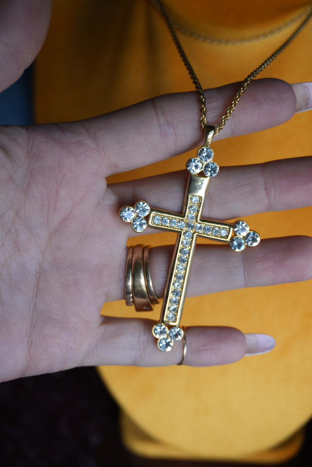27 inch length gold tone costume chain with 3” length costume cross with rhinestones
