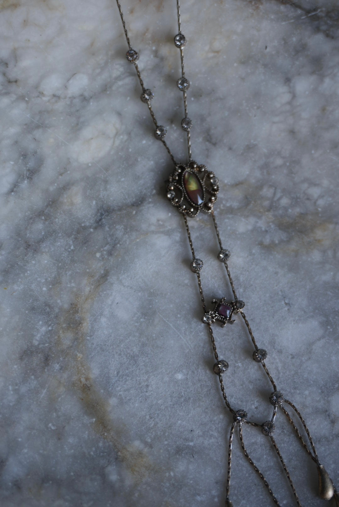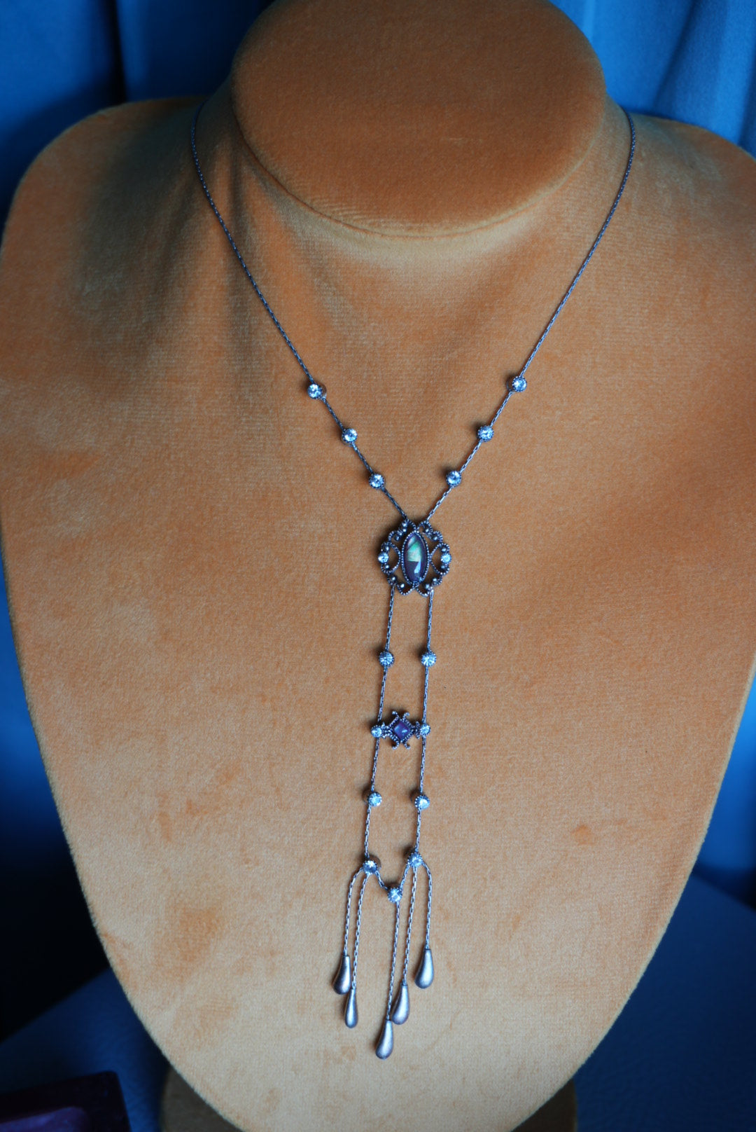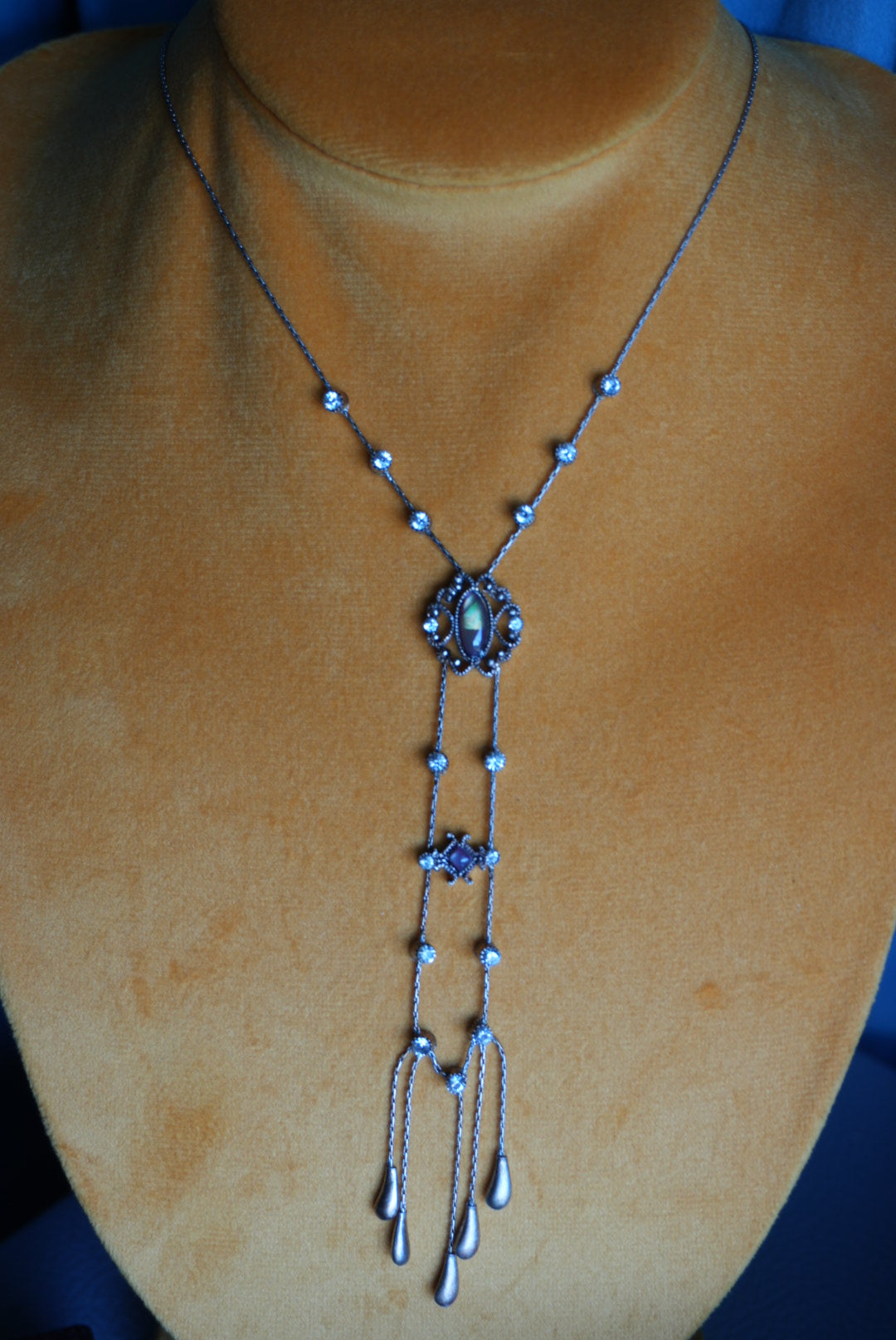 16-19” length necklace plus 4.5 inch tassel / lariat segment. Costume materials from brand 1928z