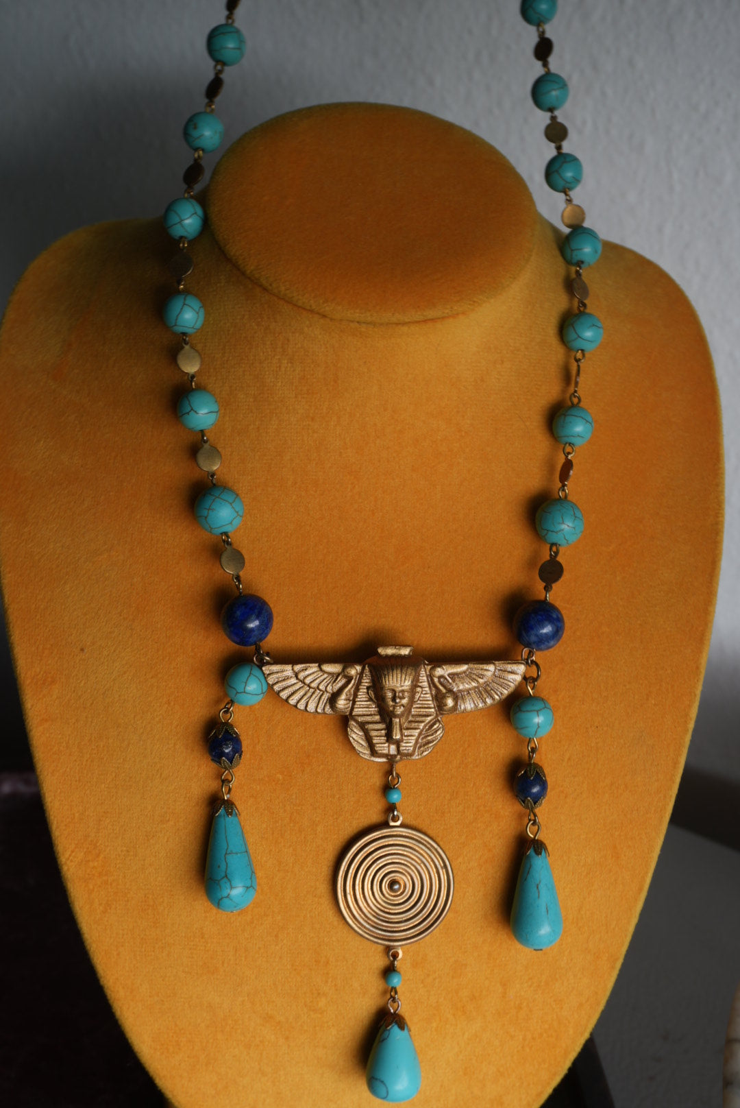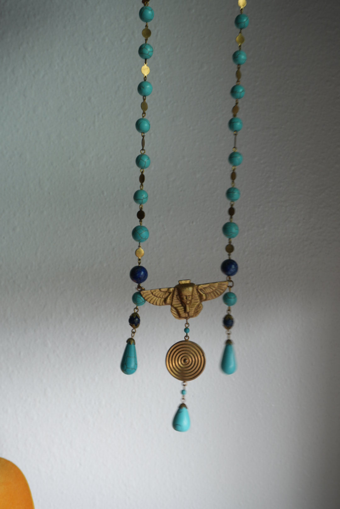 Gold plate chain and cut pendants with lapis and turquoise beads. 22” length necklace plus 3” pendant length