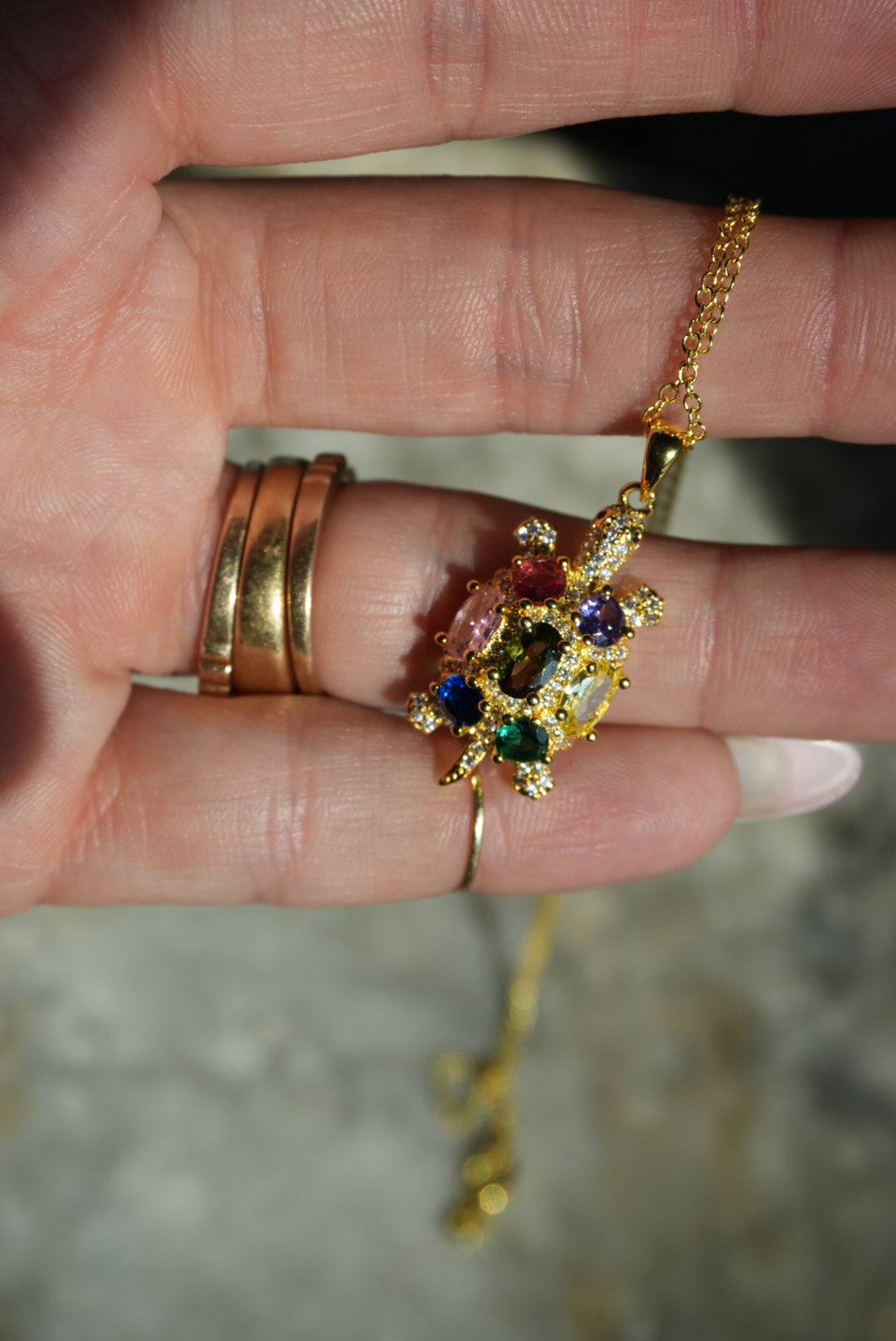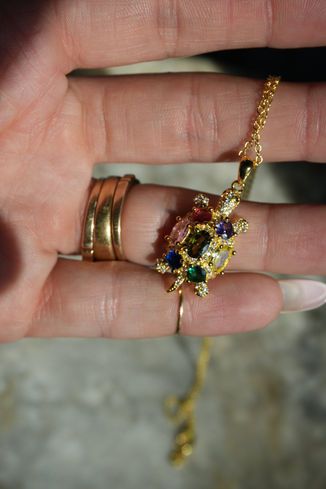 18” length costume chain and turtle with bright glass stones such a cutie ! All gold plated
