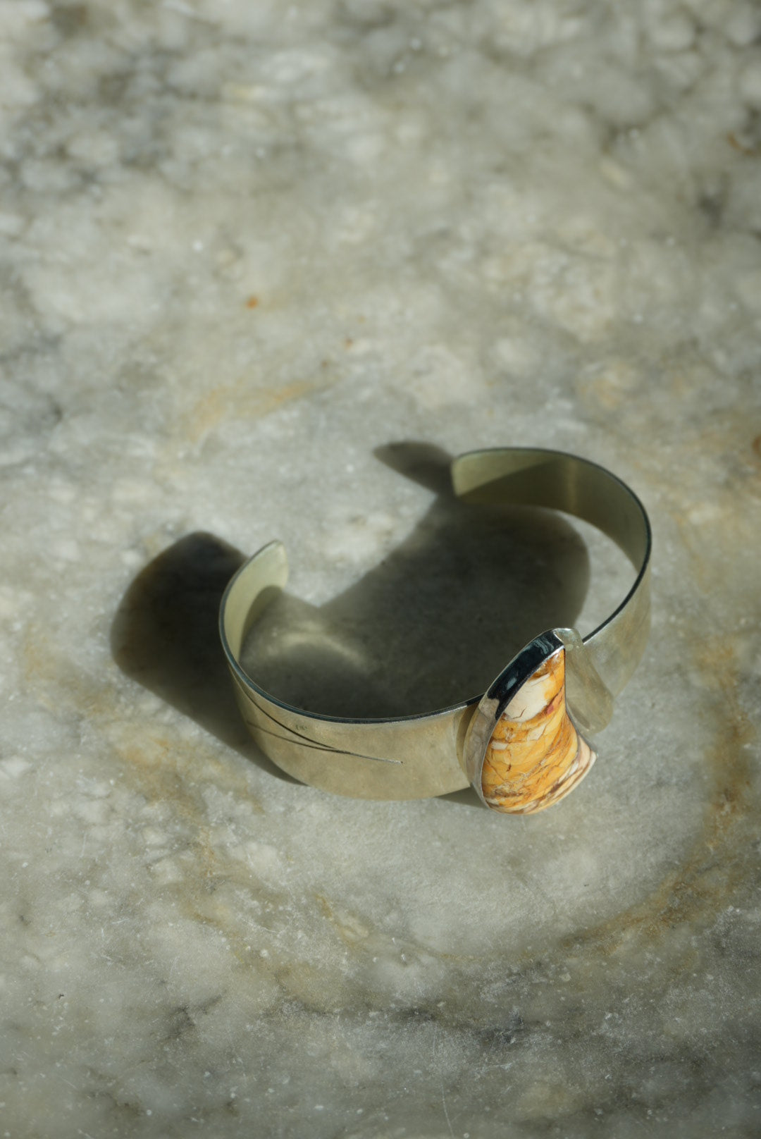 Sterling silver desert rose trading by Jay King is a high quality sterling cuff with a large crescent shaped jasper stone at center 2.4 inch inner diameter slightly adjustable with 1” width