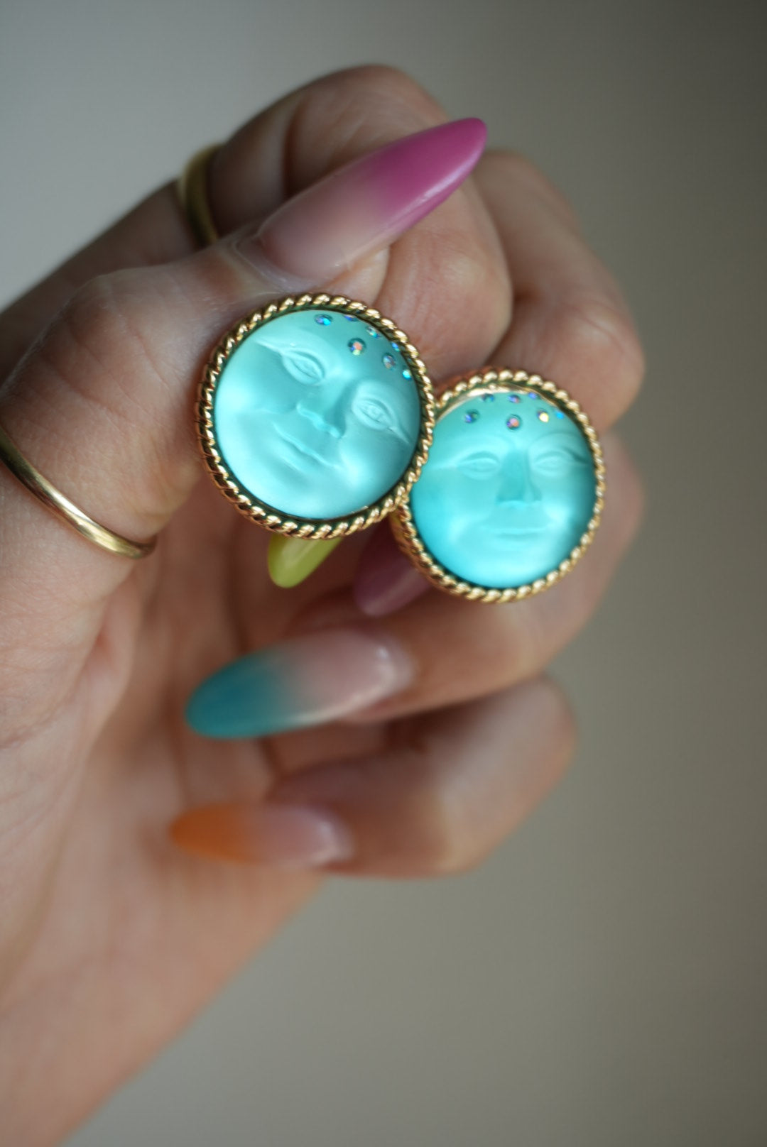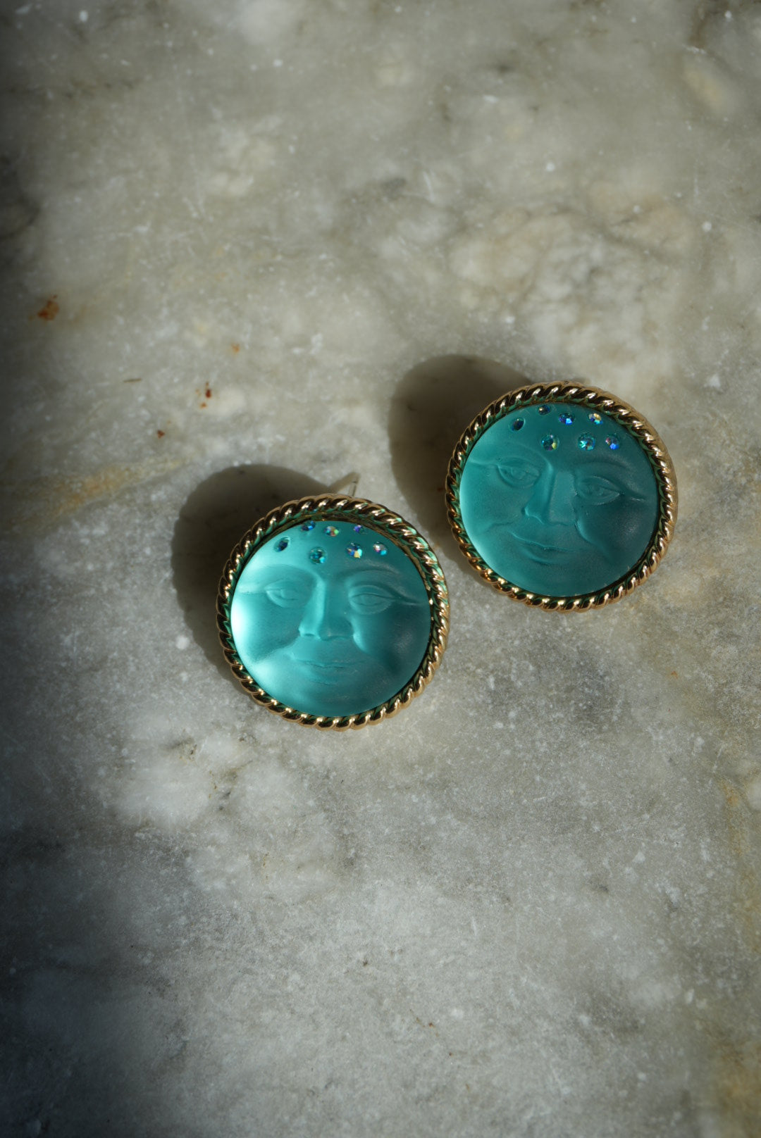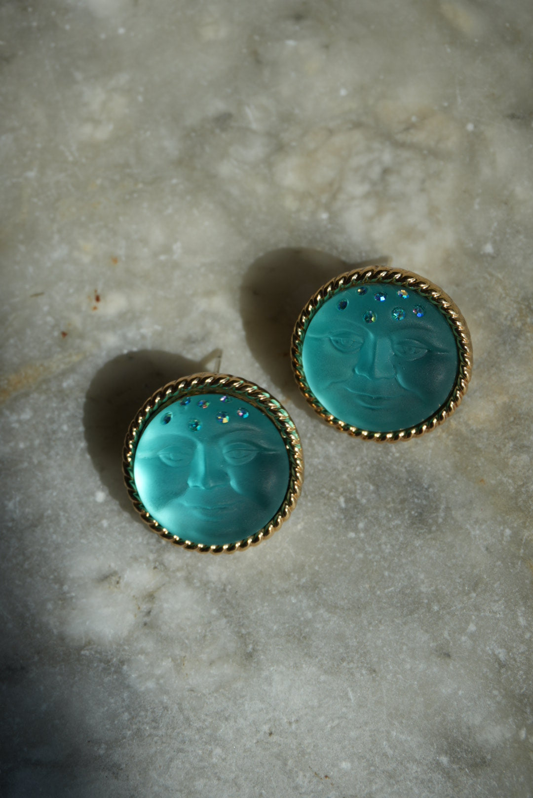 Kirk’s folly moon man blue earrings costume gold plate 1”