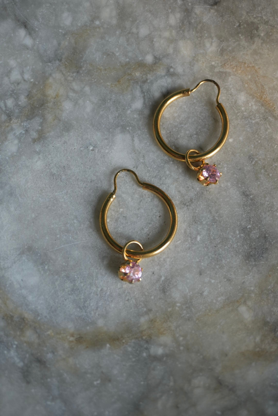 1.25 inch drop hoop gold plate with dangling pink glass stone