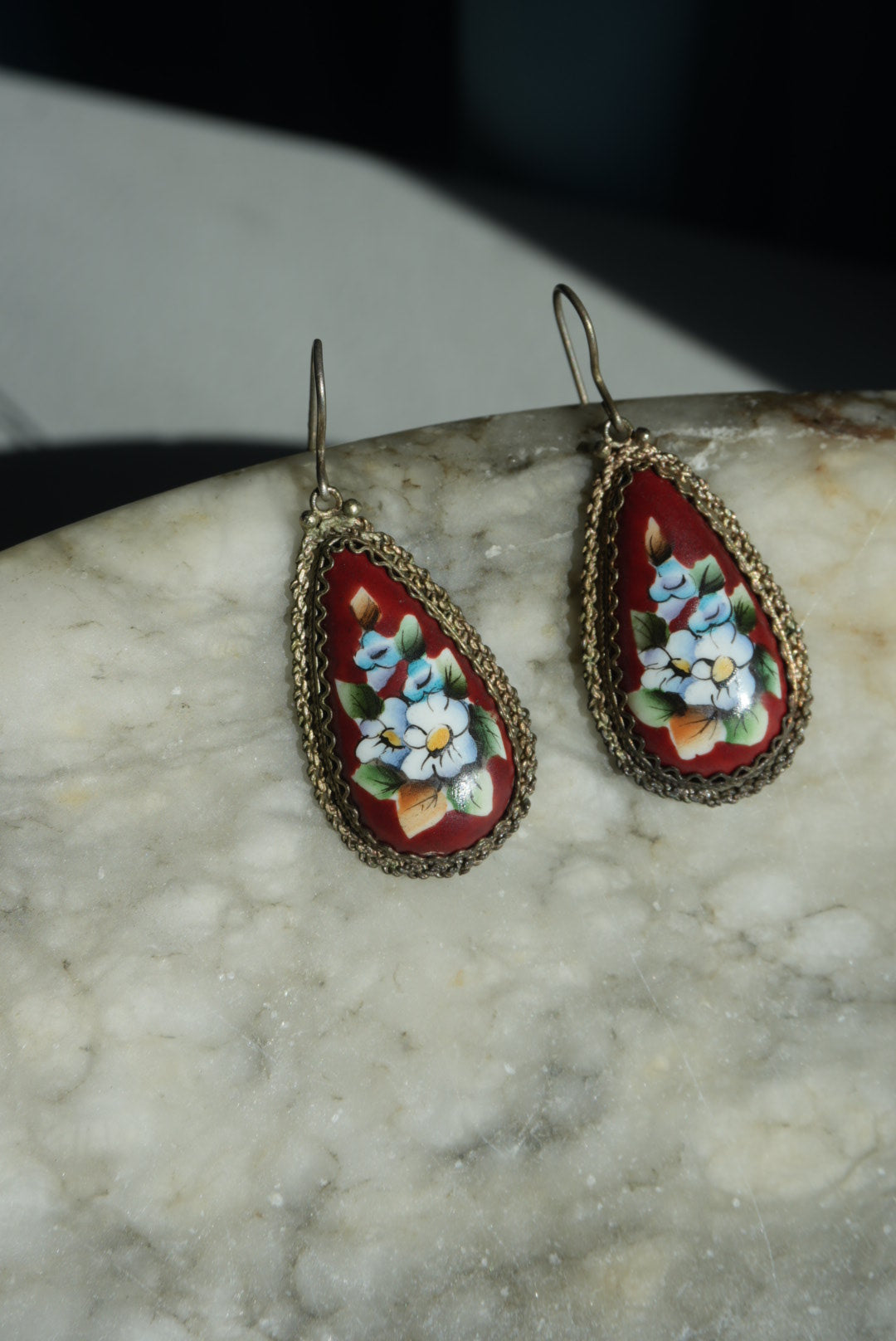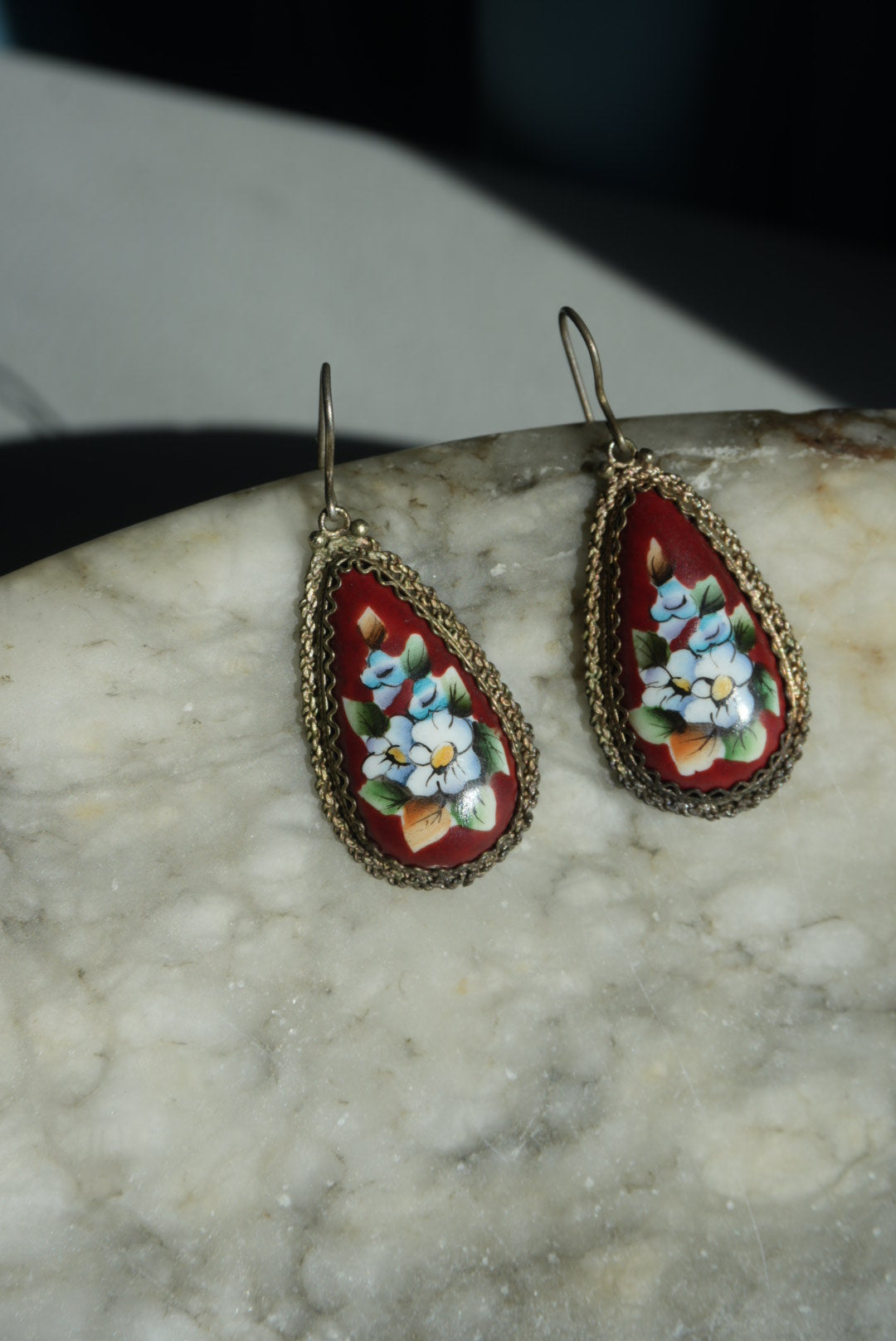 Hand painted porcelain earrings from Russia with filigree frame detail