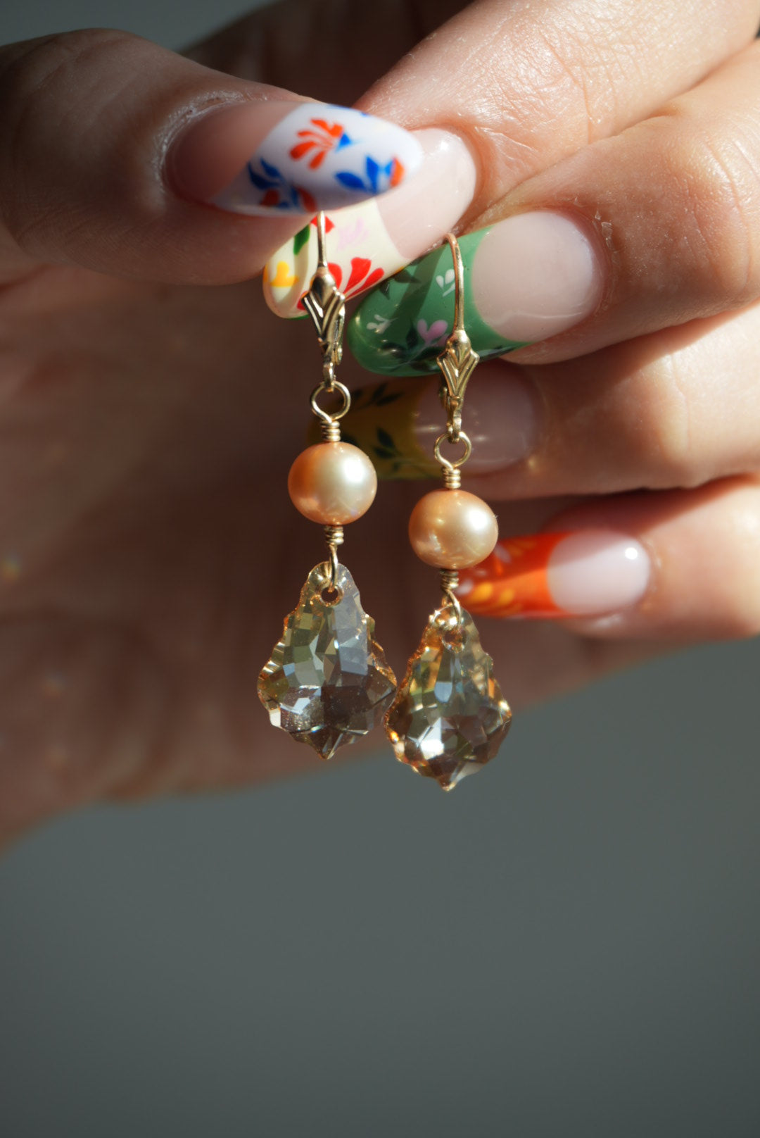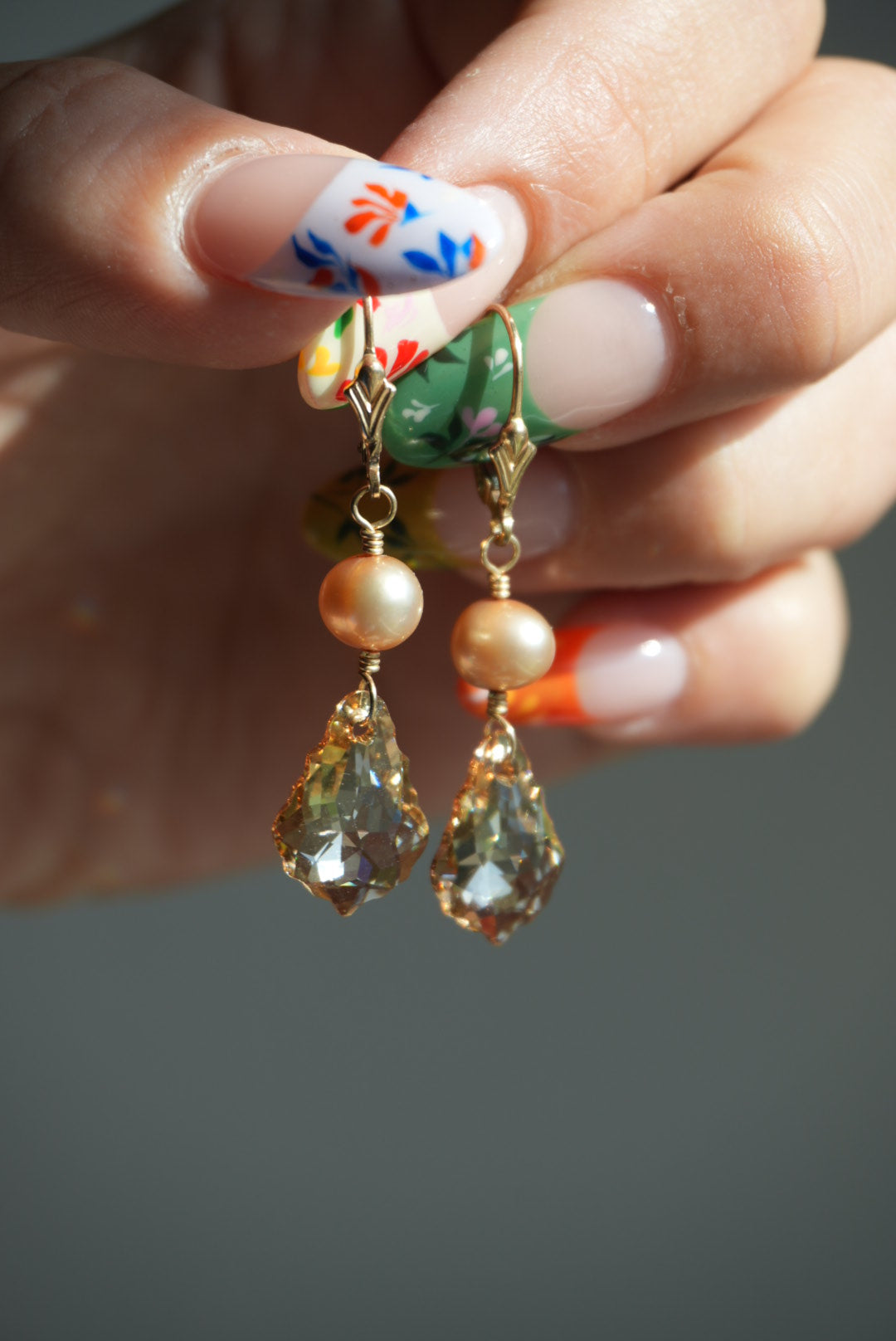 gold fill 1.75” tall drop earrings with pearl and cut glass