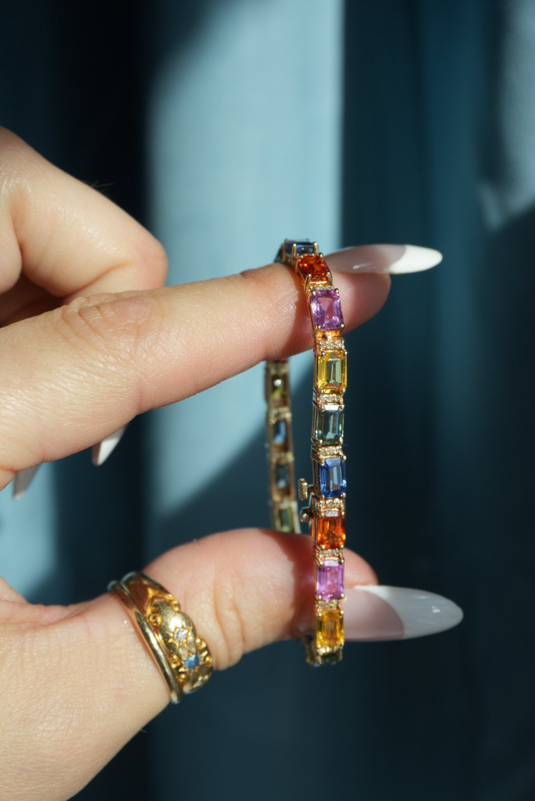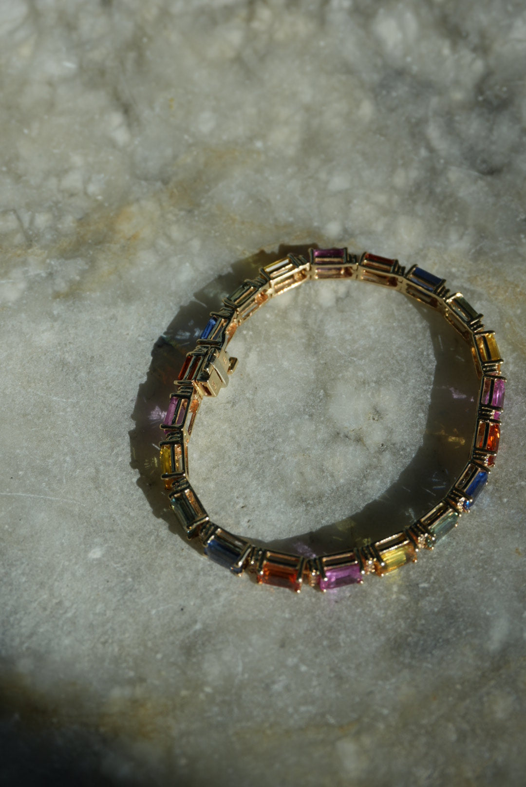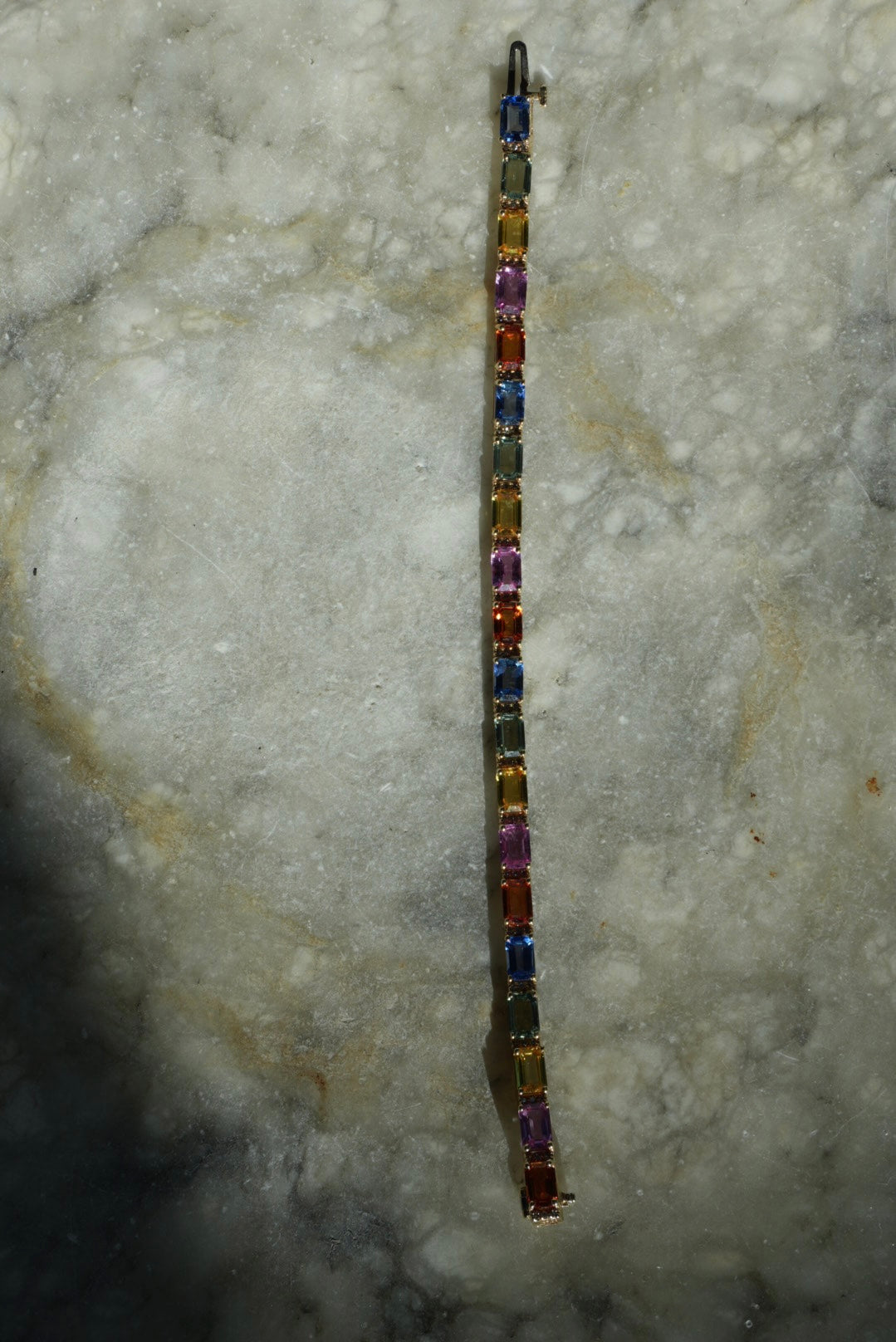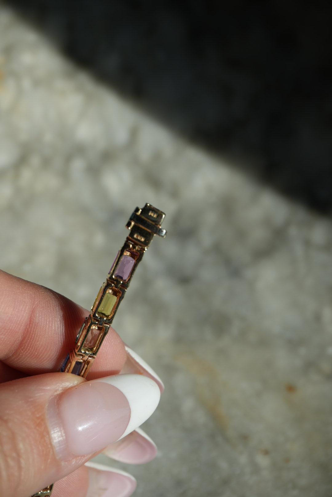 This tennis bracelet is 14k gold bracelet made my the iconic Effy brand. All natural stones 6 inches long. Deffinitly for the smaller wrist.