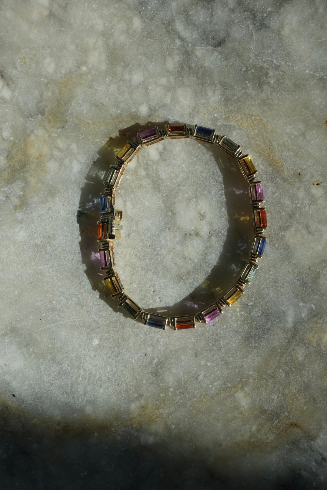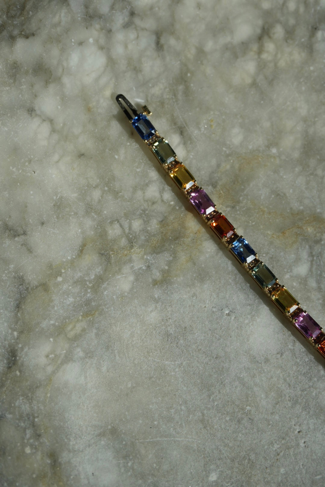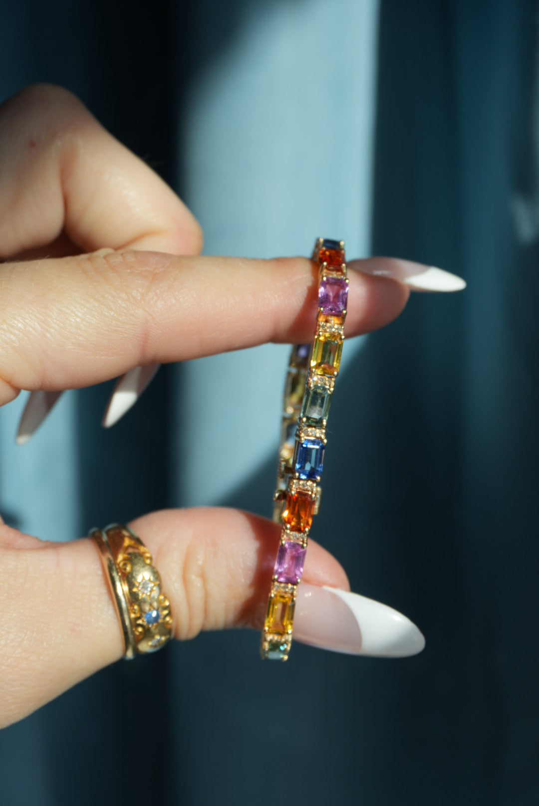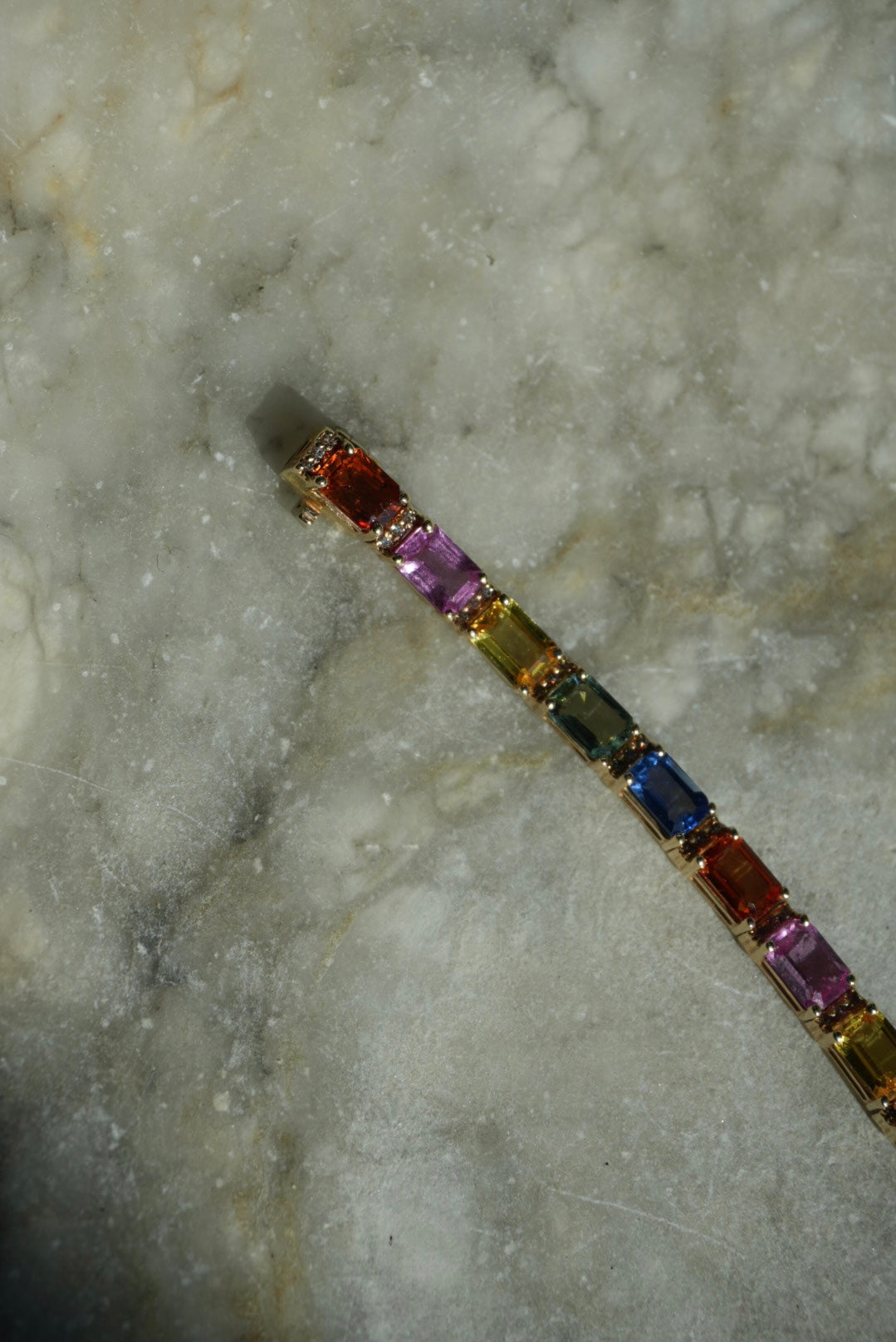 This tennis bracelet is 14k gold bracelet made my the iconic Effy brand. All natural stones 6 inches long. Deffinitly for the smaller wrist.