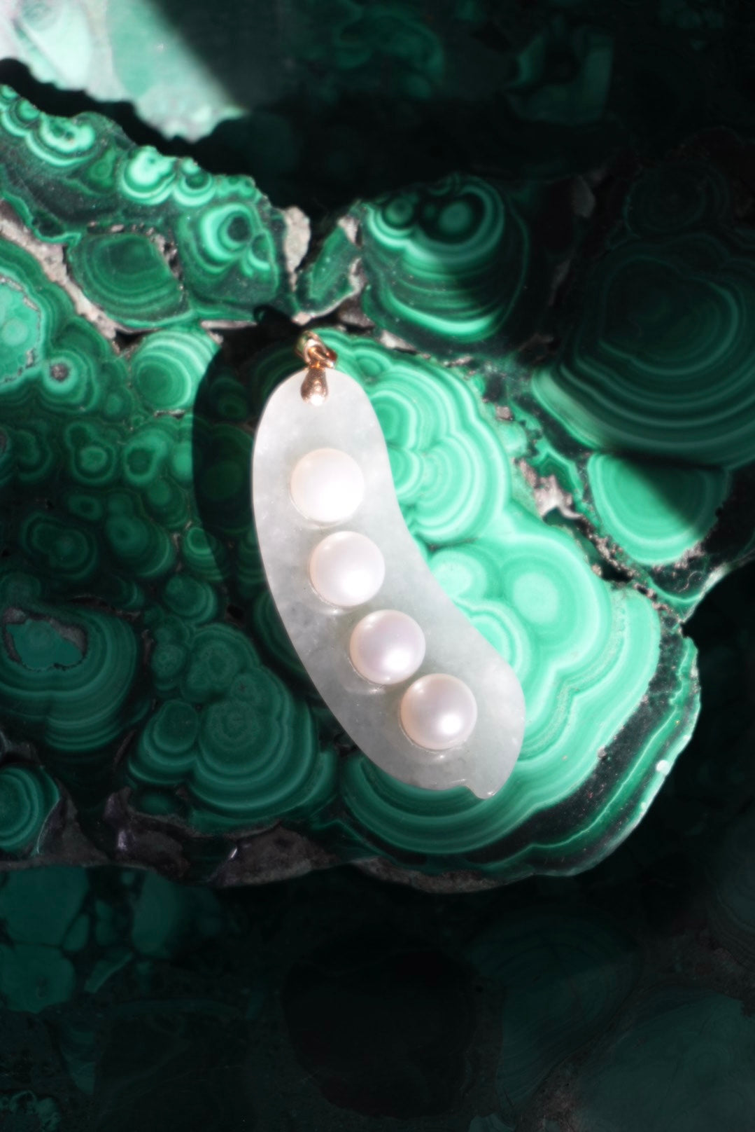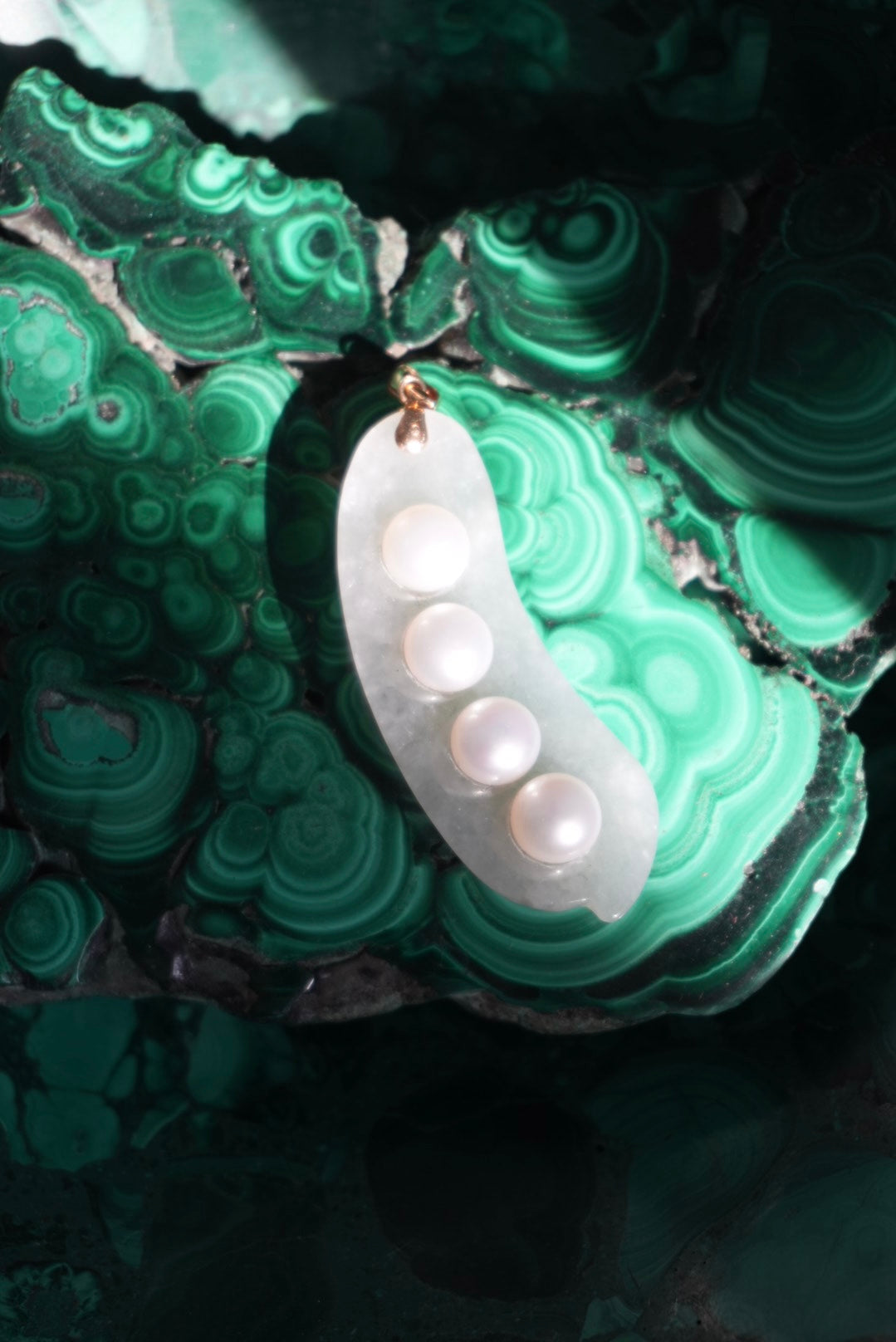 14k bail on a natural jade & pearl pea pod pendant 2 inches long