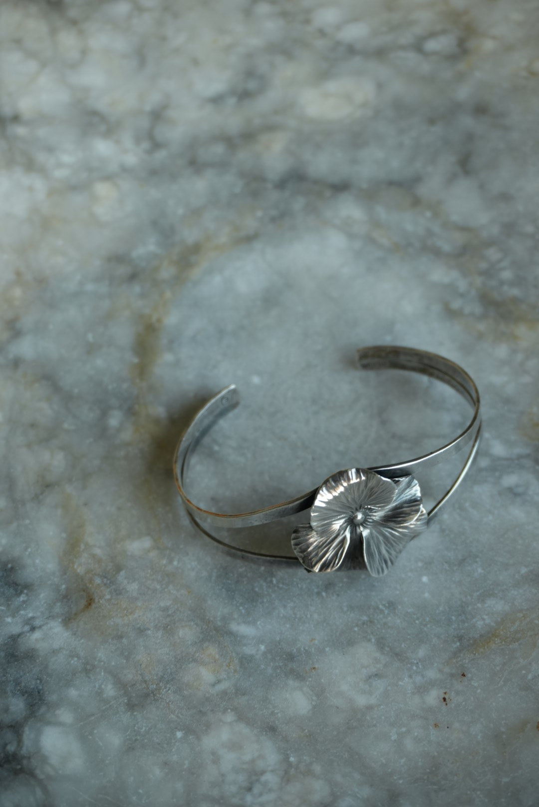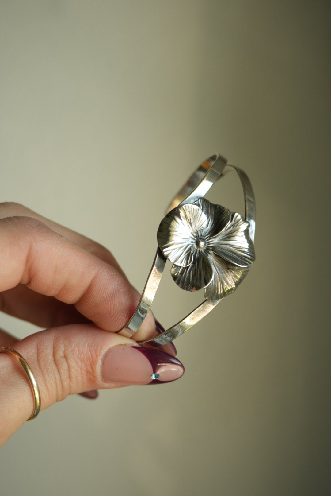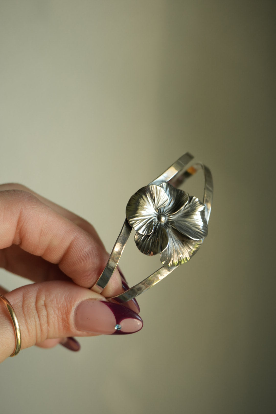Sterling silver Stuart NYE marked pansy or orchid cuff bangle. 2.3” inner diameter slightly adjustable ◡̈