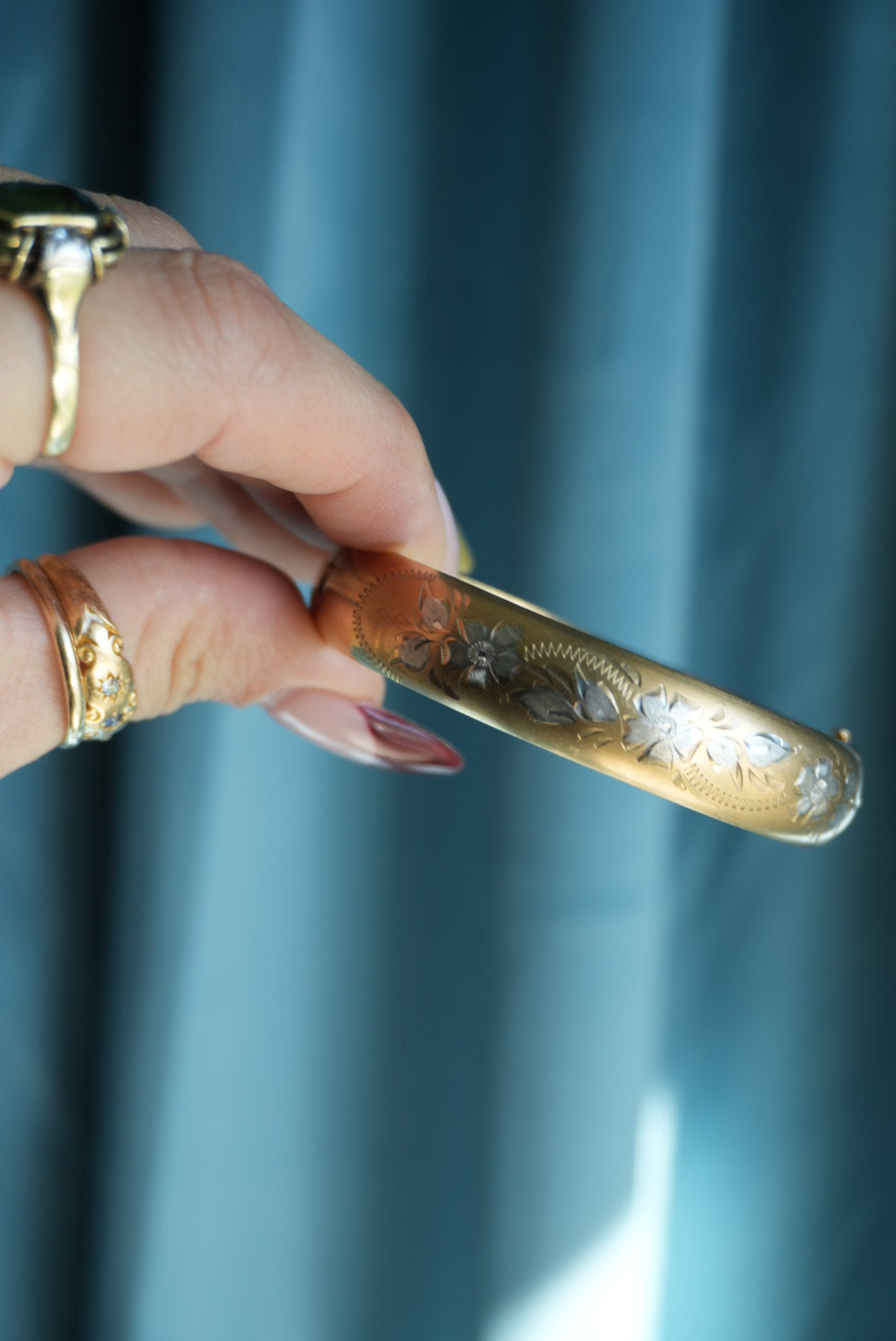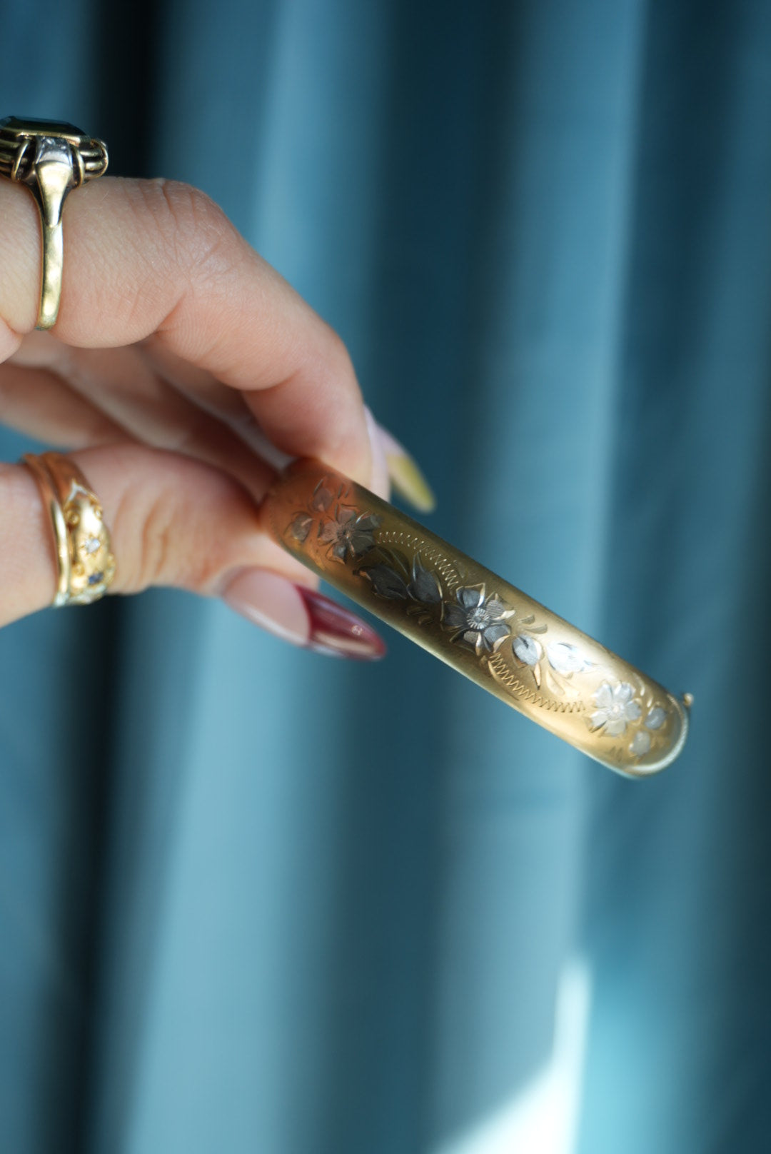 Marathon gold fill bangle in stunning condition 2.5 inch diameter with silver florals etched and smooth backside of bangle