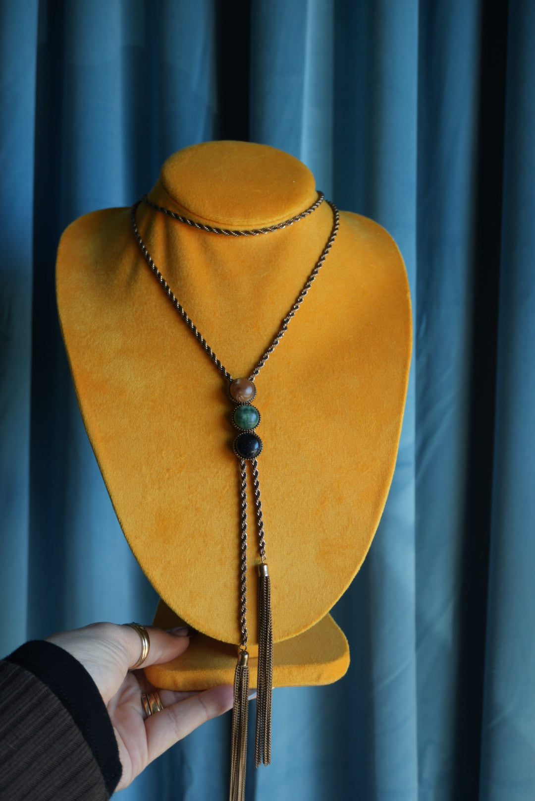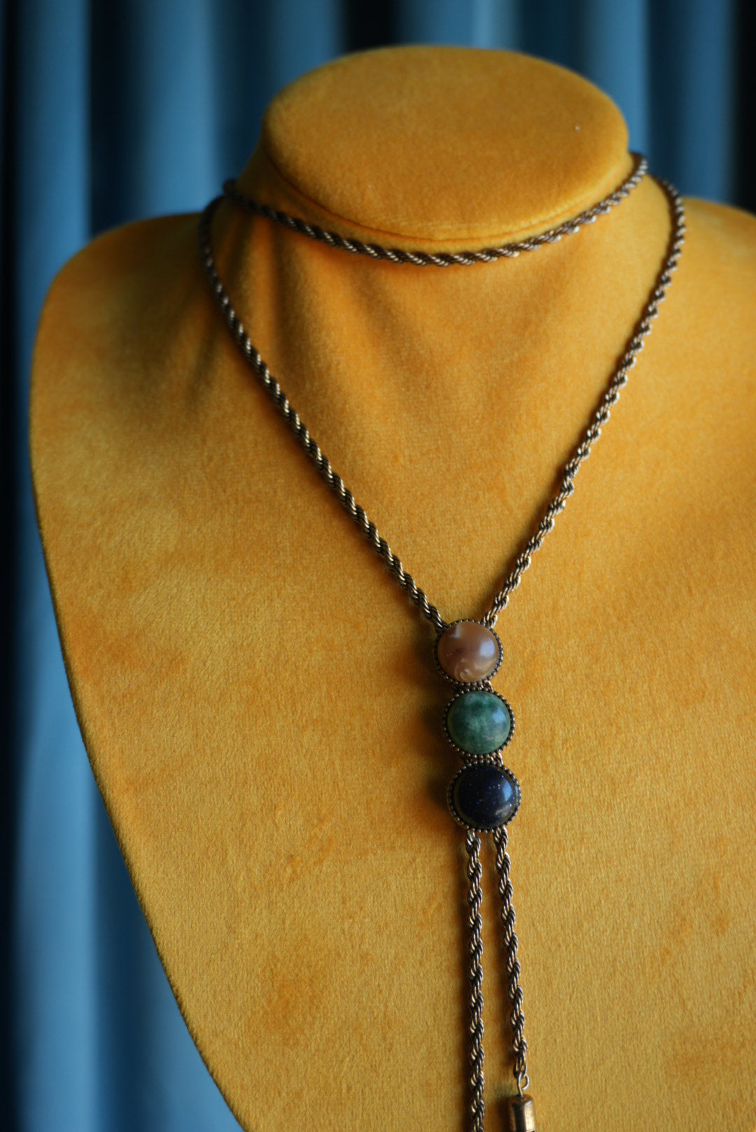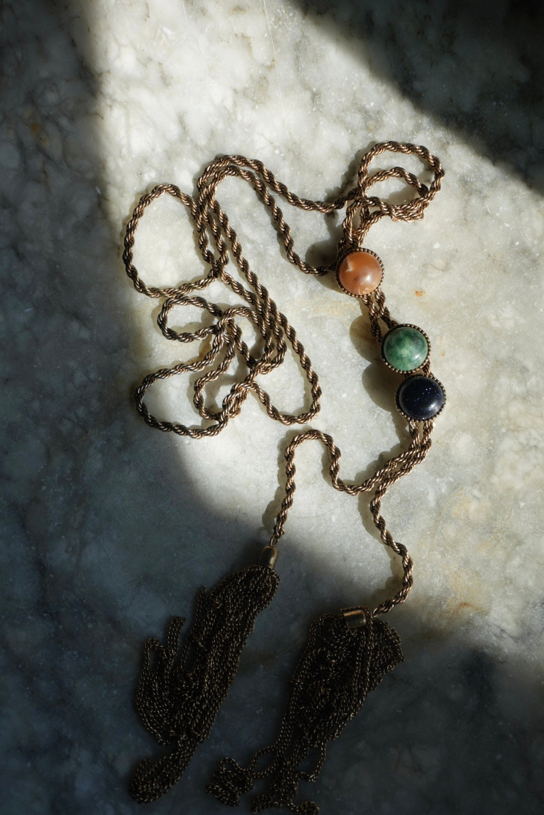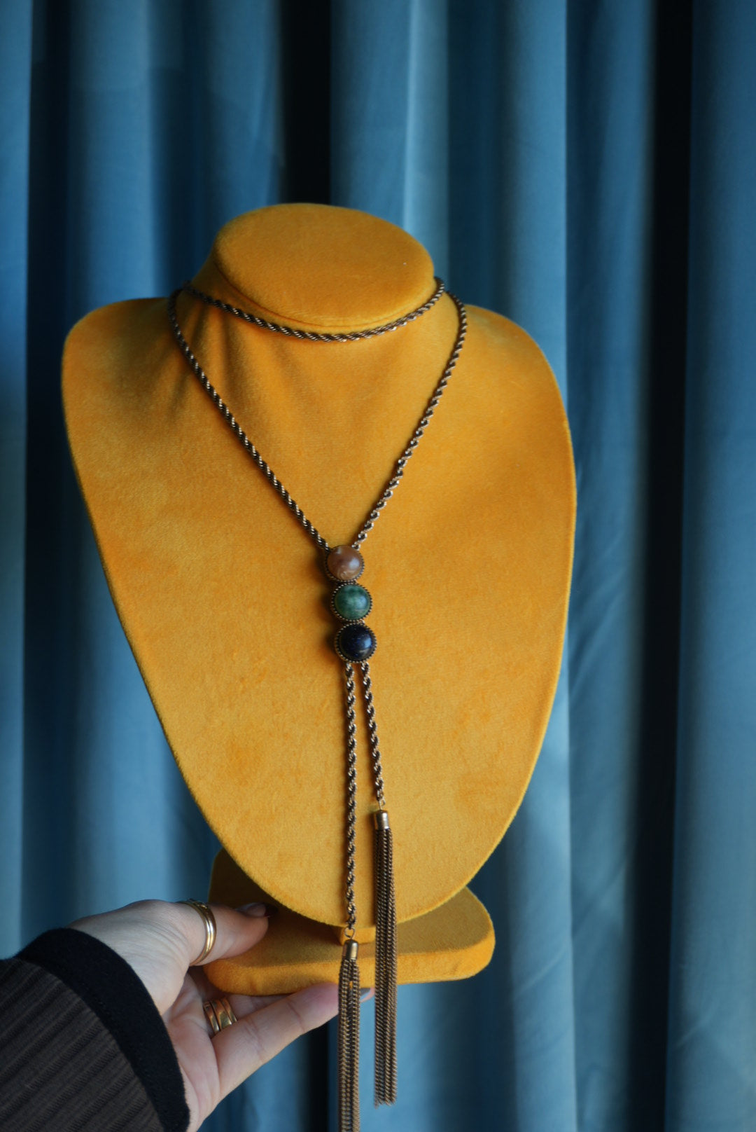 Gorgeous gold fill lariat style necklace total length 48” including tassels. Features blue goldstone, nephrite, and agate