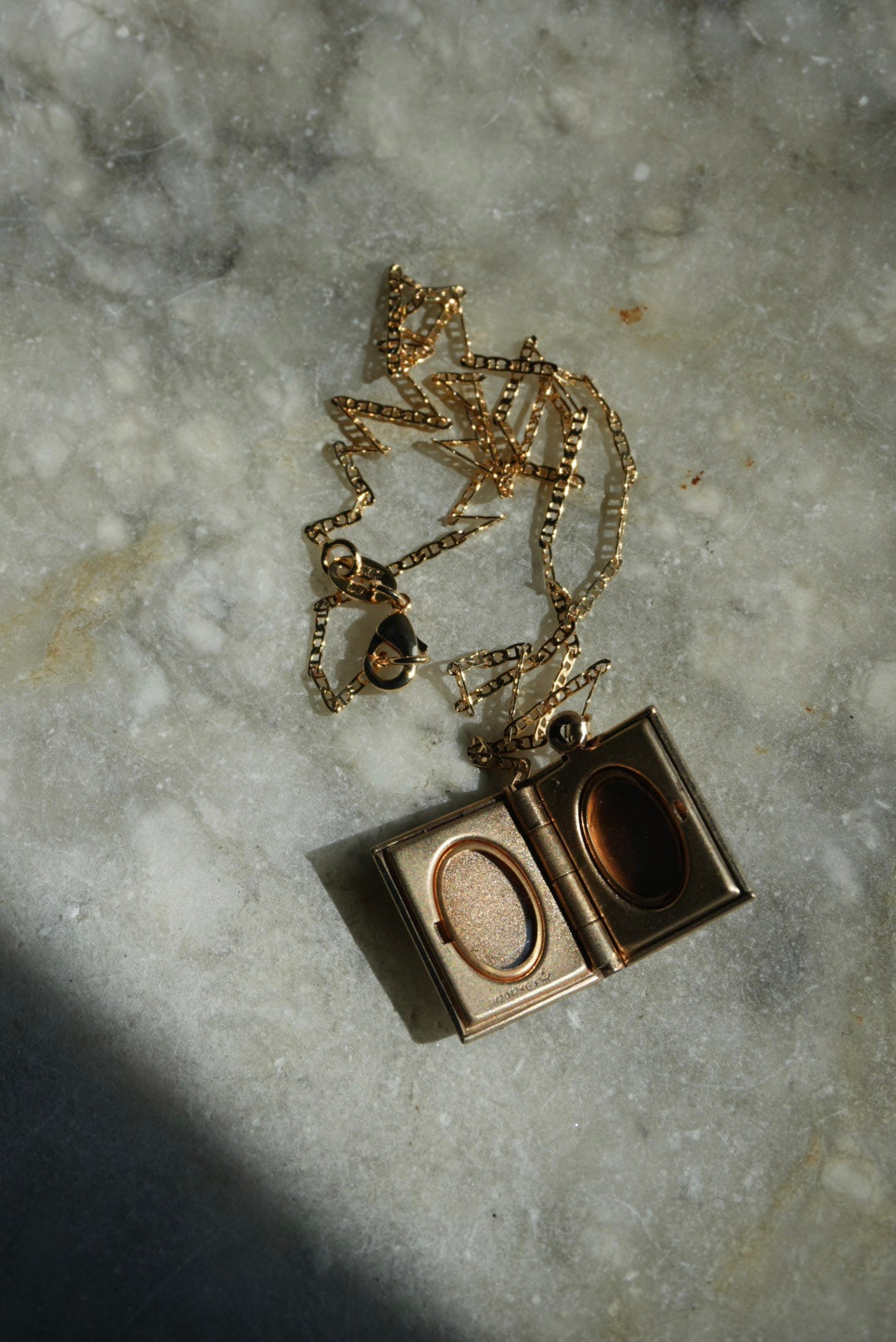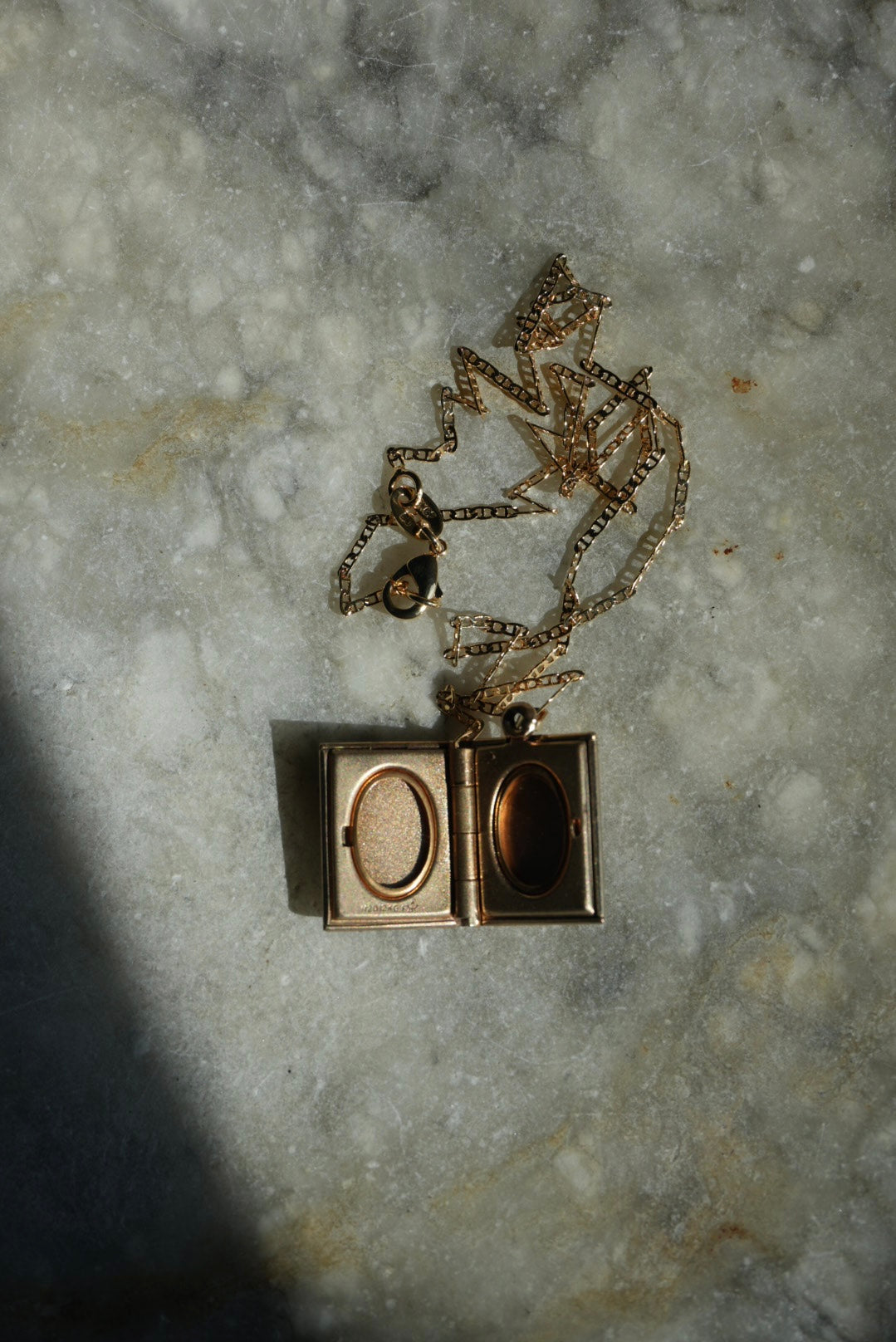 17.5 inch length gold fill chain and book locket 0.75 inch height with little photo holder rare locket