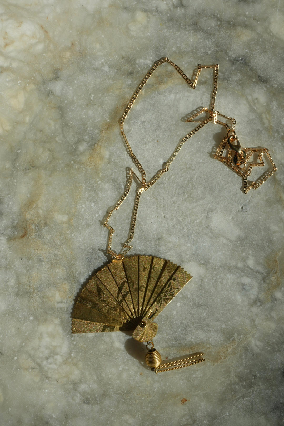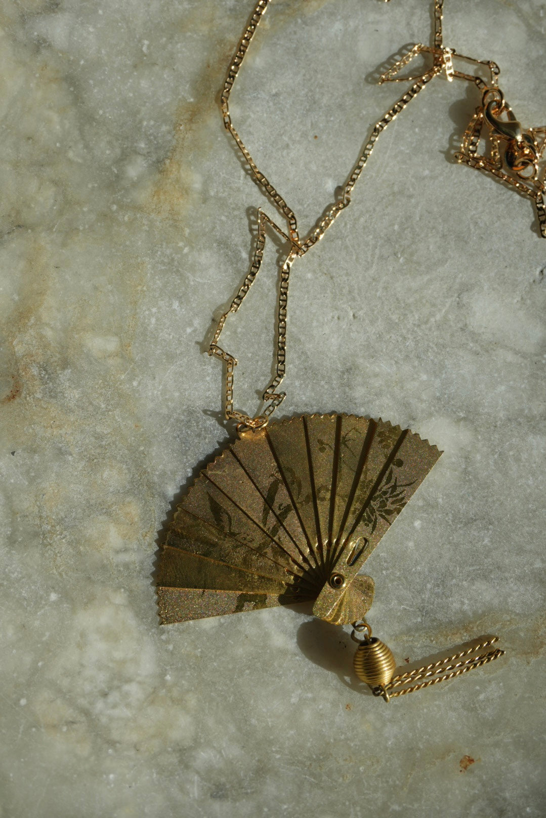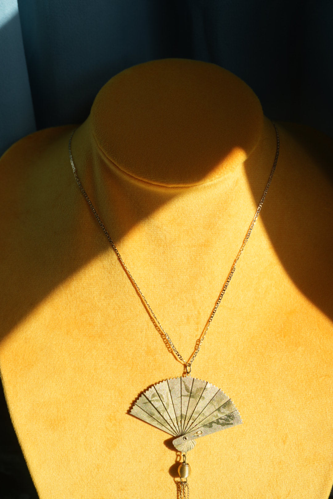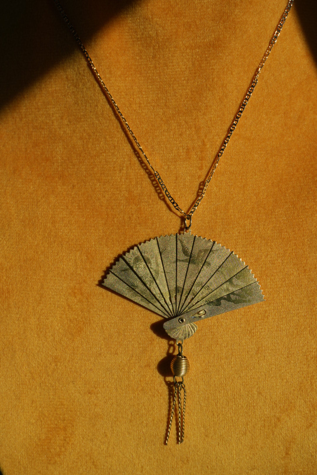 16” length gold fill chain with open and close fan pendant with reversible crane side and rare two birds side