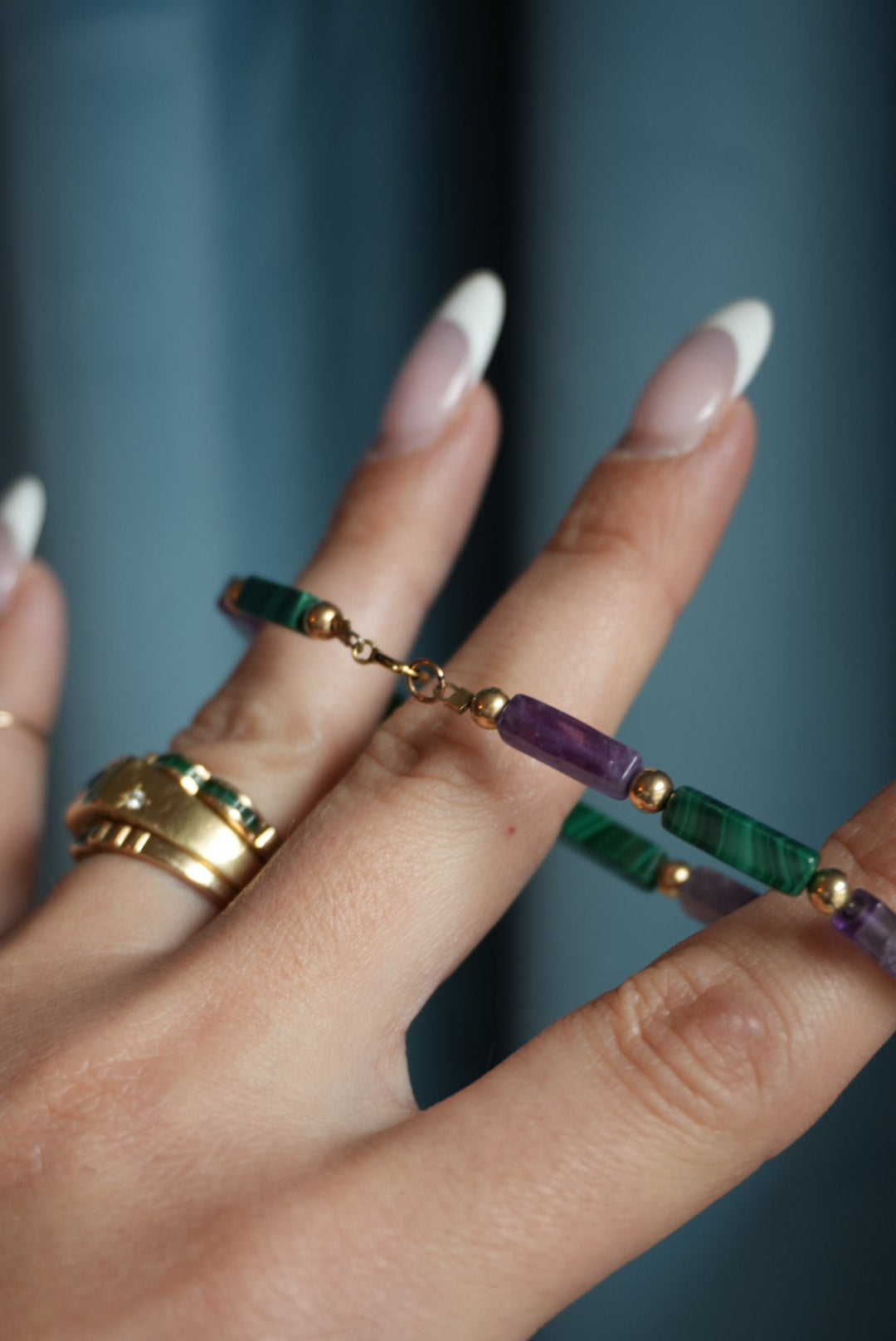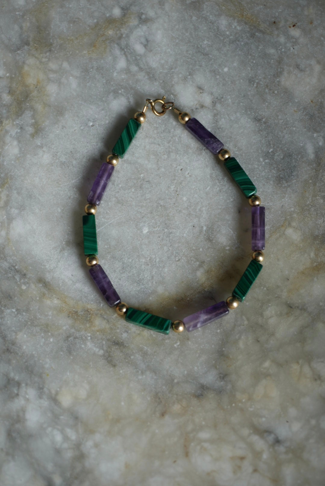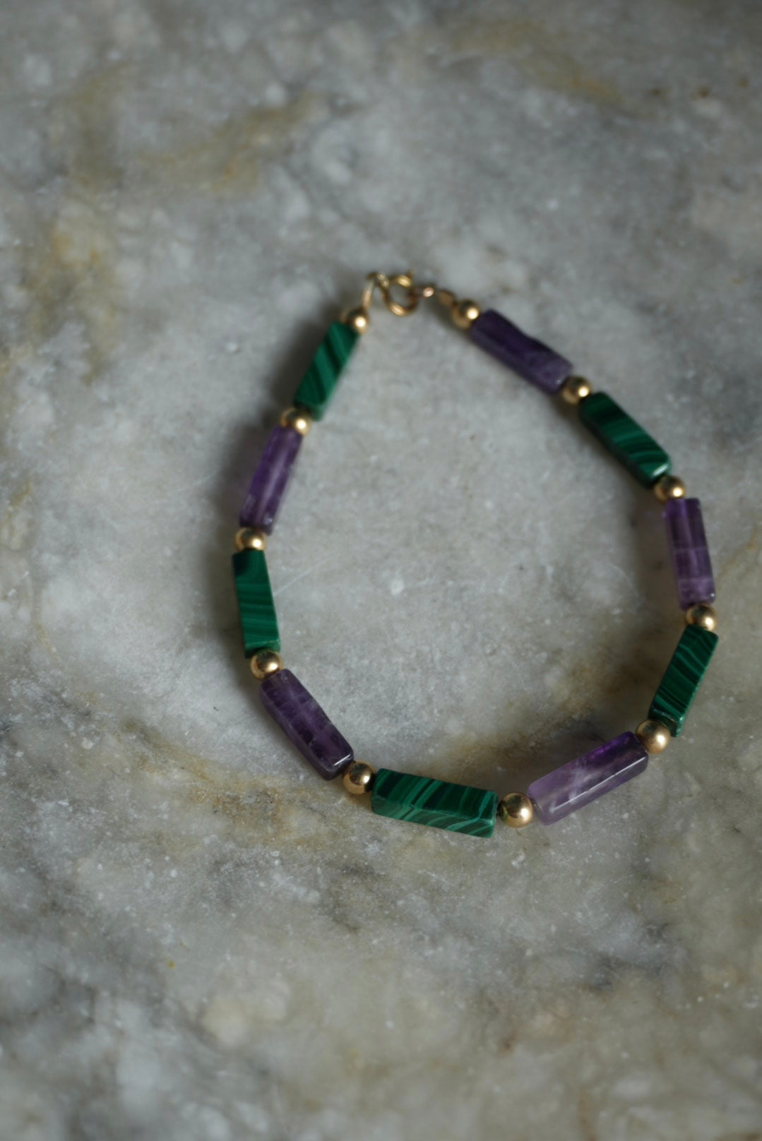 7 inch gold fill malachite & amethyst bracelet