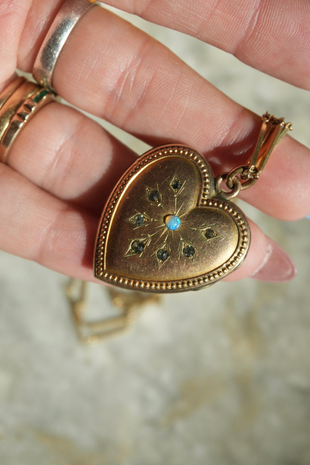 14” length gold fill double chain with antique locket 1.25 inch tall with original photos inside and glass stones
