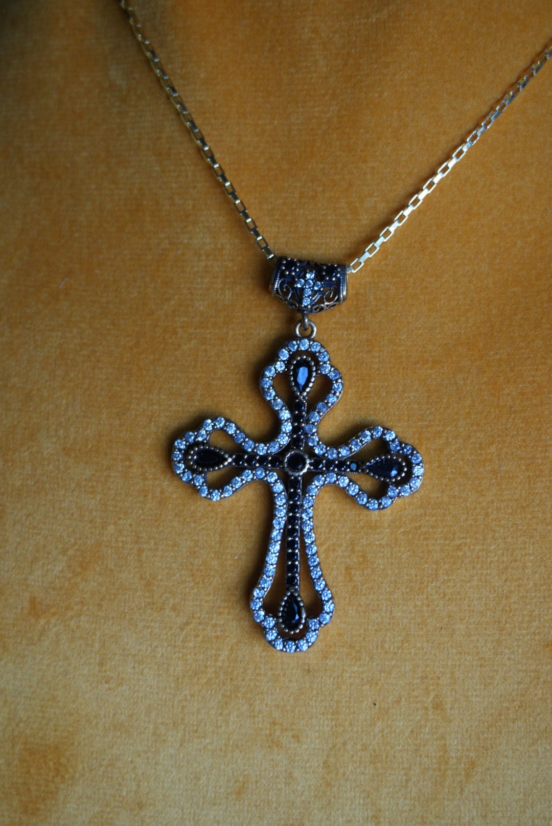 17” length box chain gold fill with vermeil cross pendant 2.2” tall with glass stones