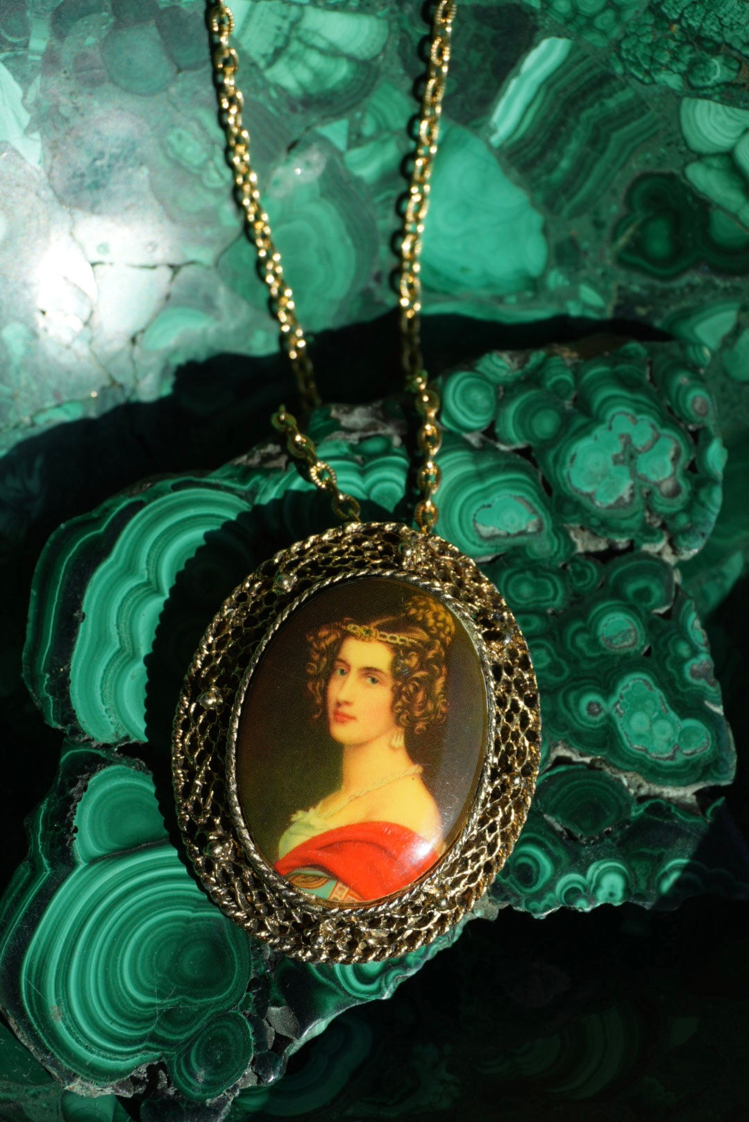 Gorgeous Florentine portrait 24” length gold plate chain and pendant that can be worn as a broach 2.25” tall