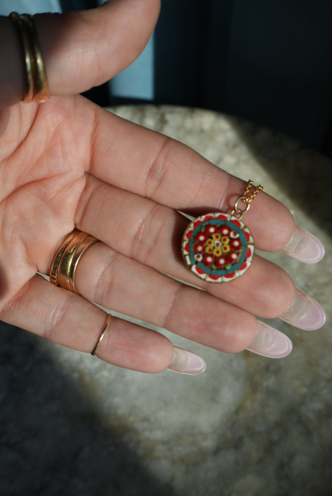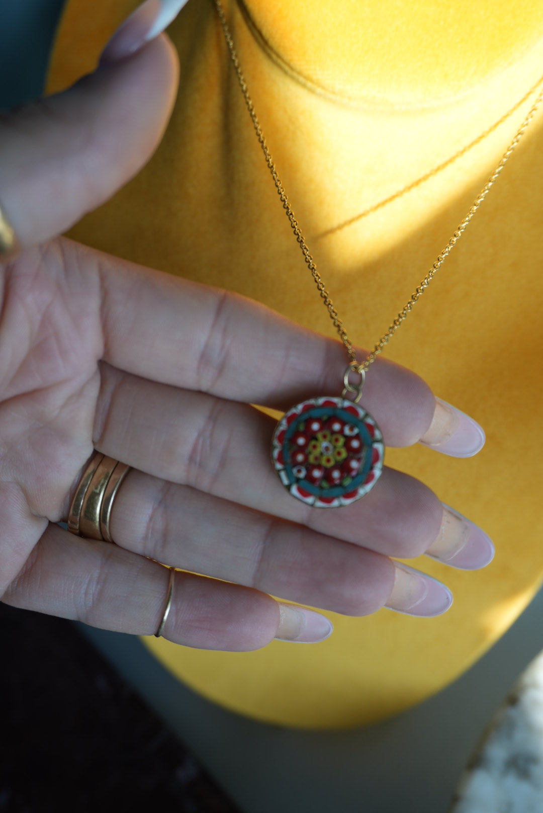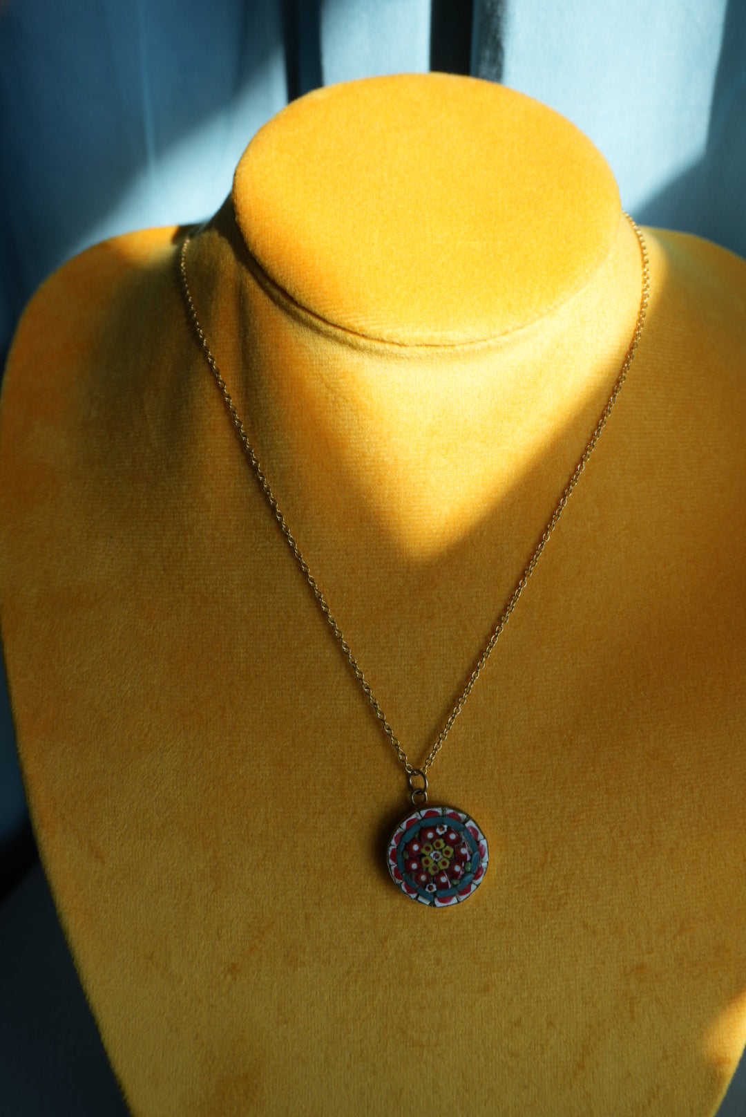 18” length pop metal costume necklace with handmade Italian mosaic pendant with vibrant colors. Pendant is 1” tall