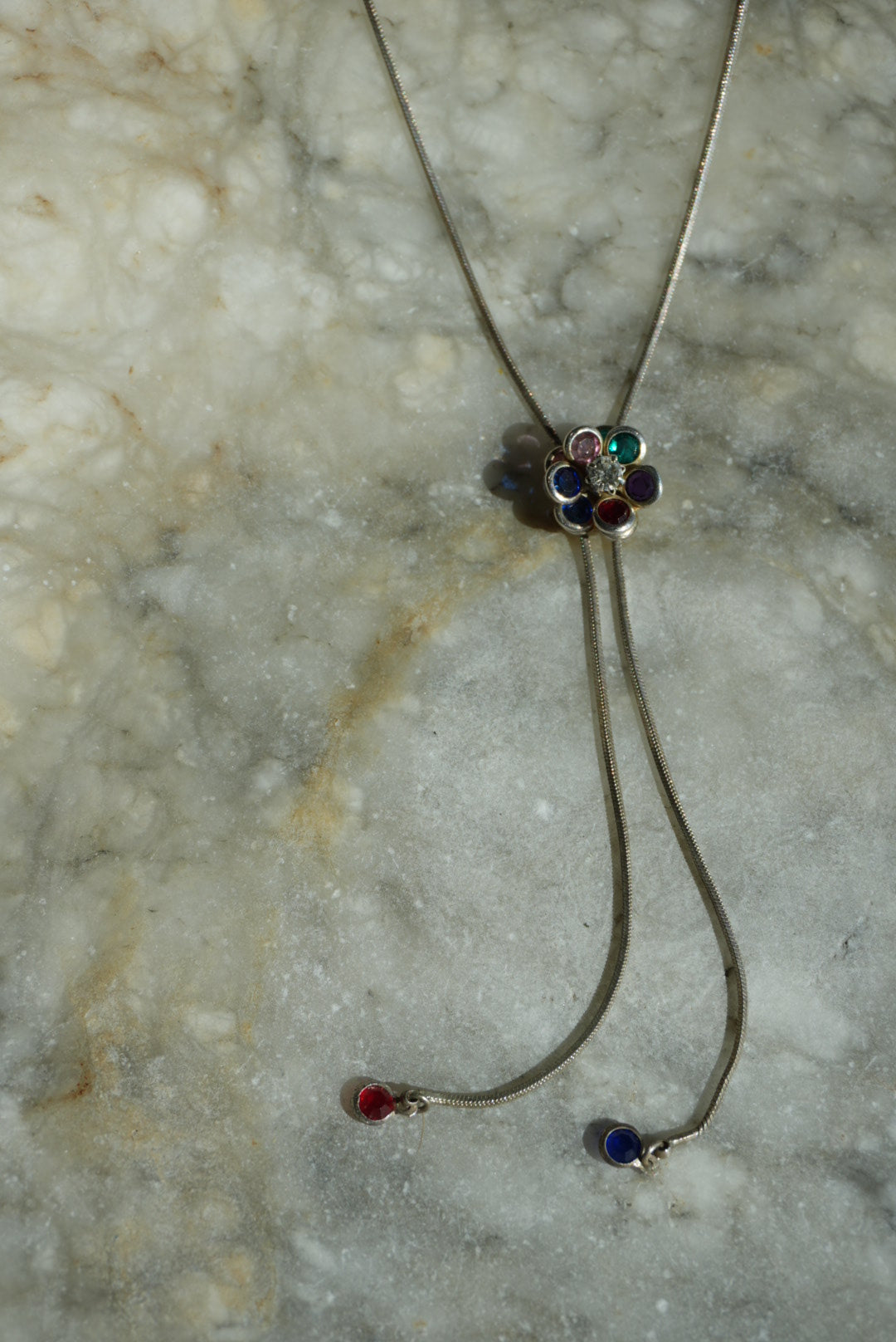 26 inch sterling silver lariat necklace with an adjustable flower center