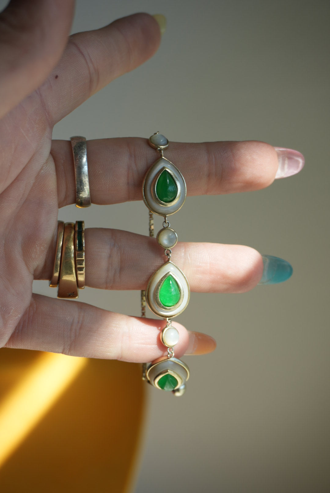 9” length gold vermeil adjustable slide bracelet with jade and moonstone