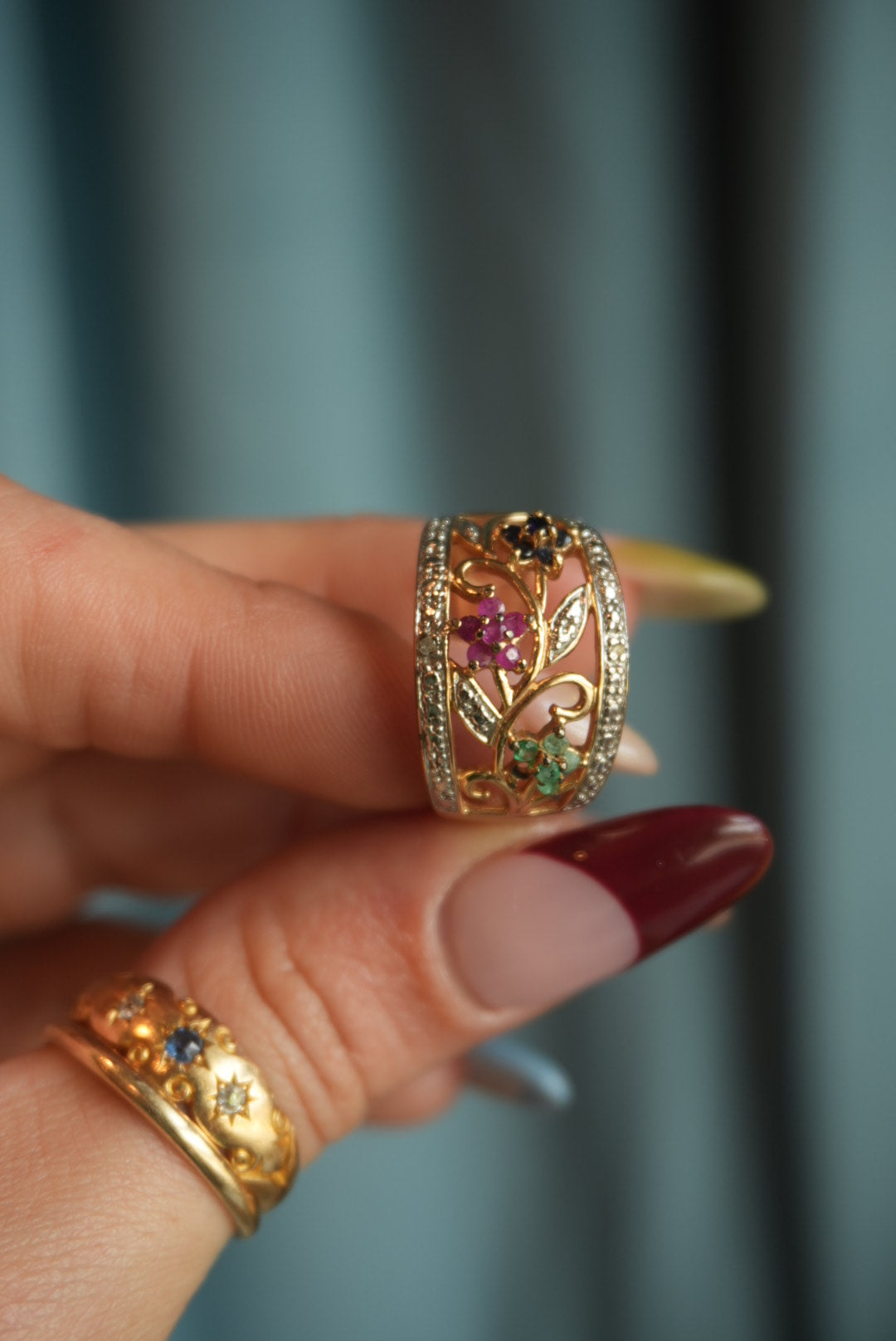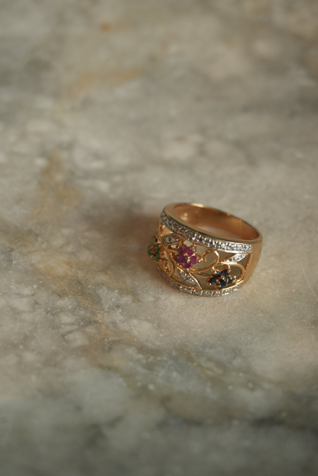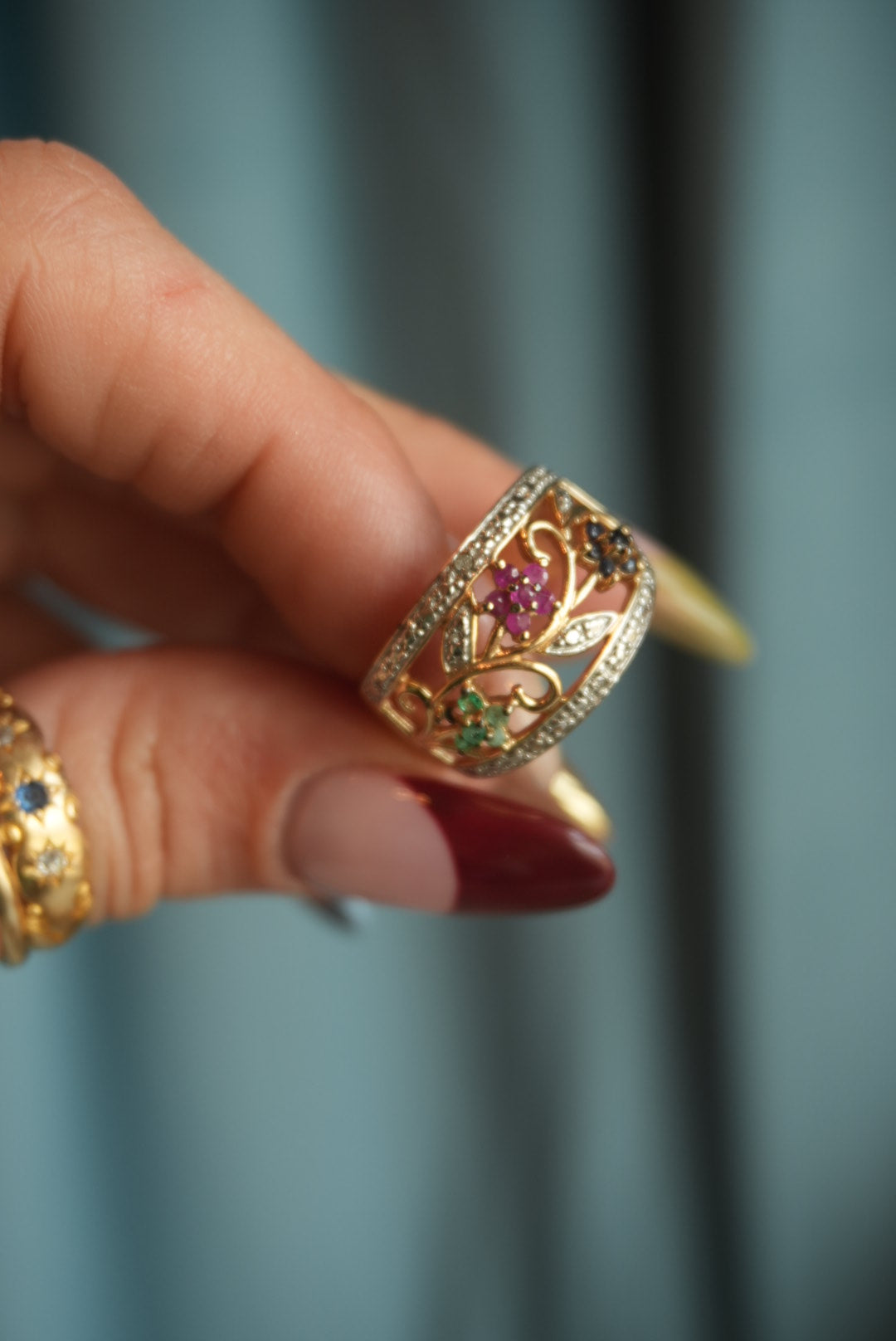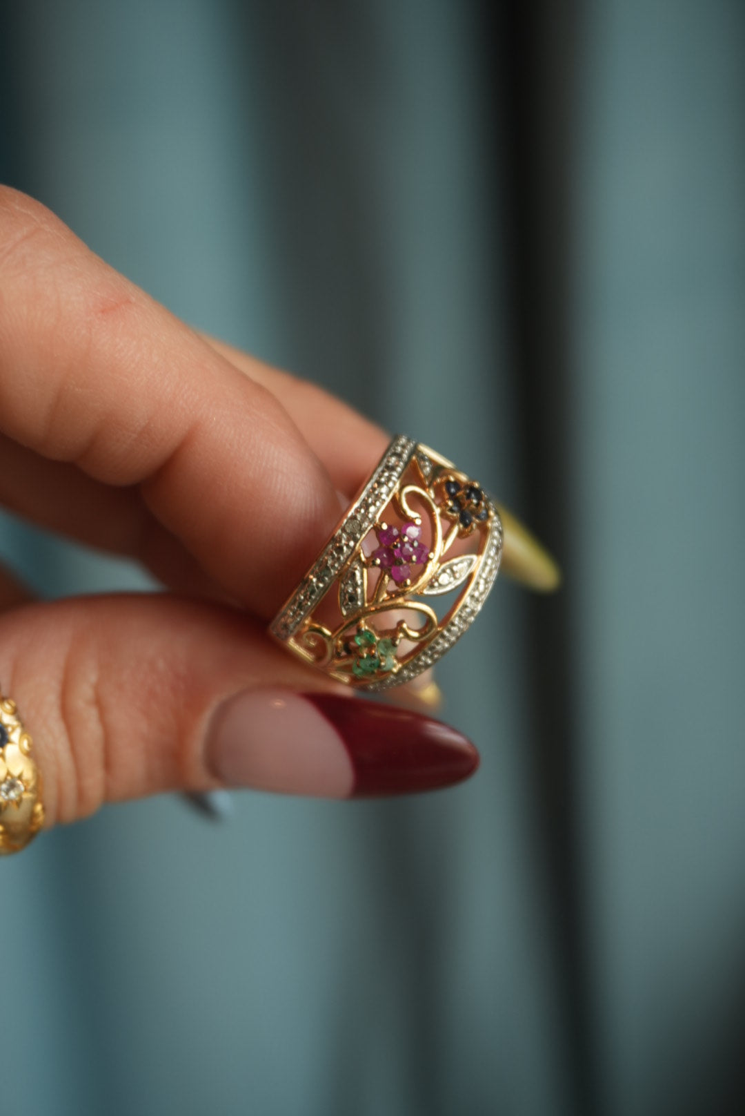 SZ 6 vermeil ring with ruby, sapphire, emeralds
