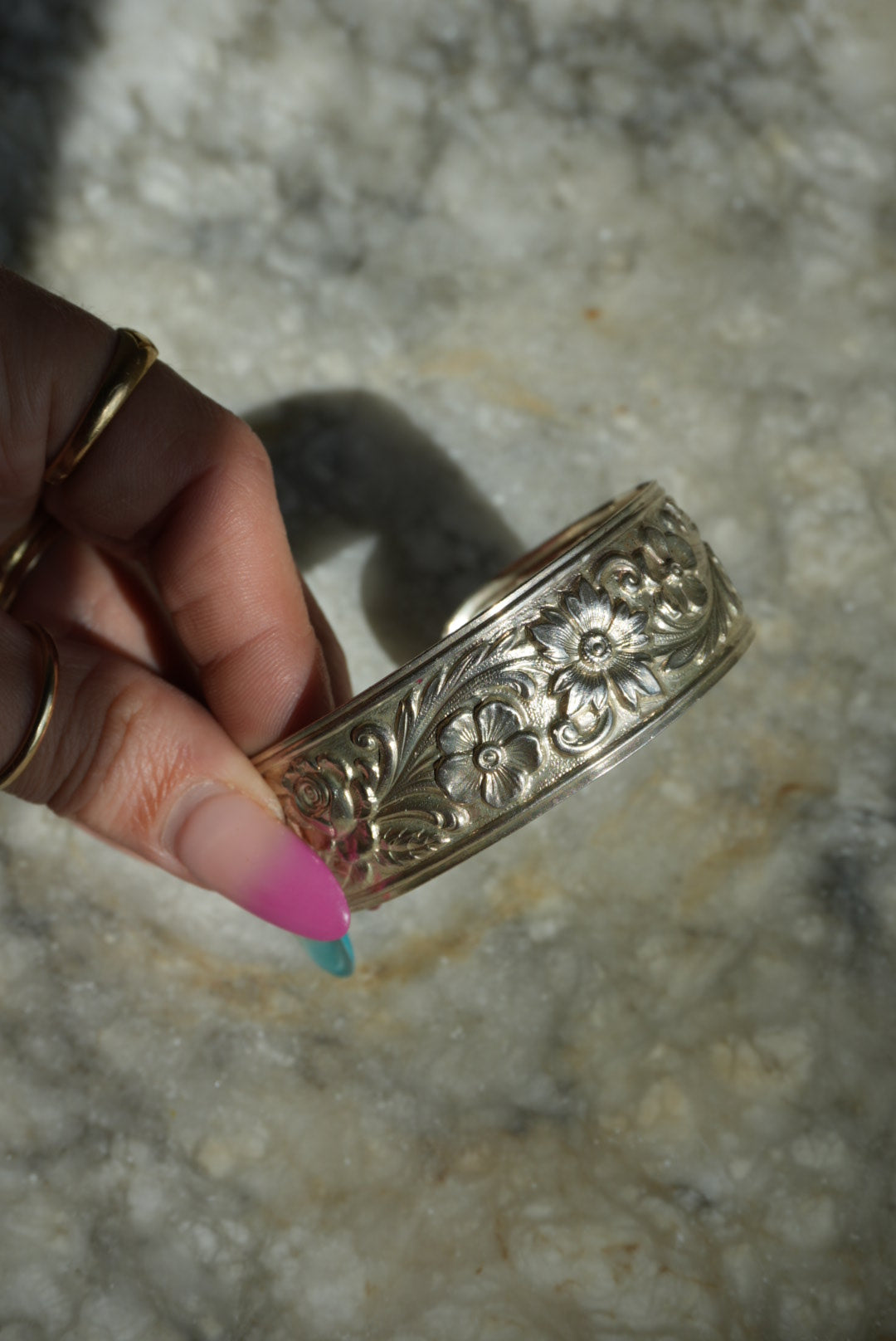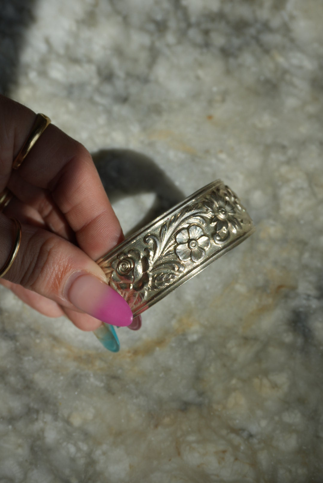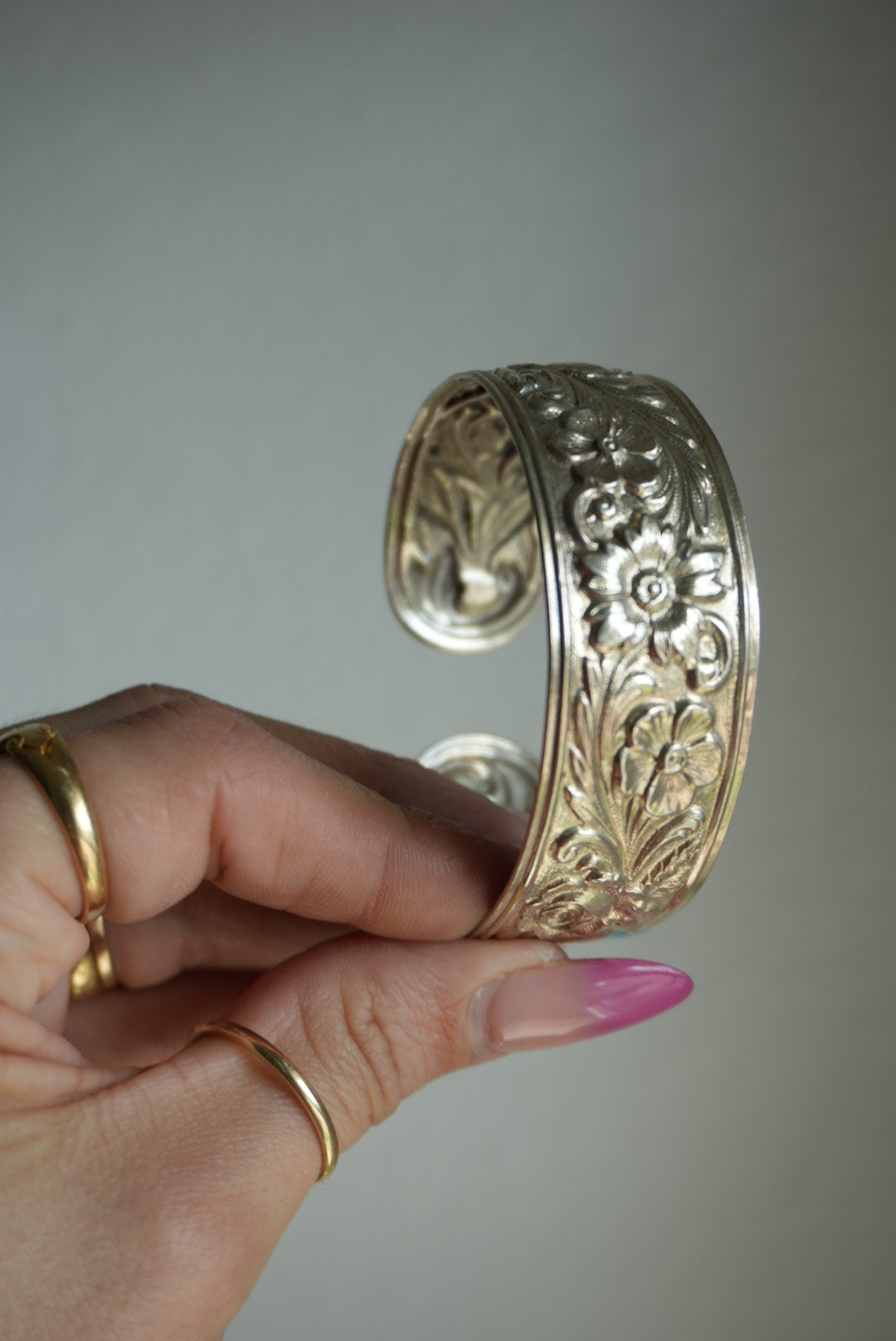 Sterling silver open back cuff bracelet with impressions flowers & leaves