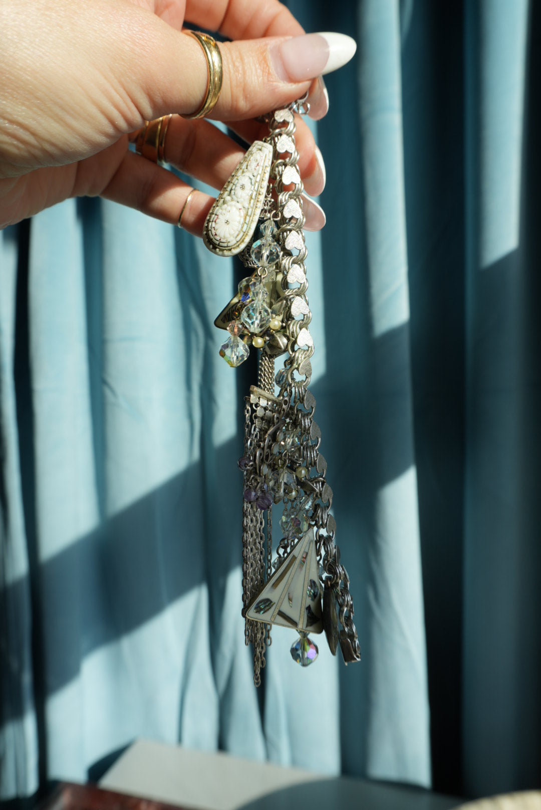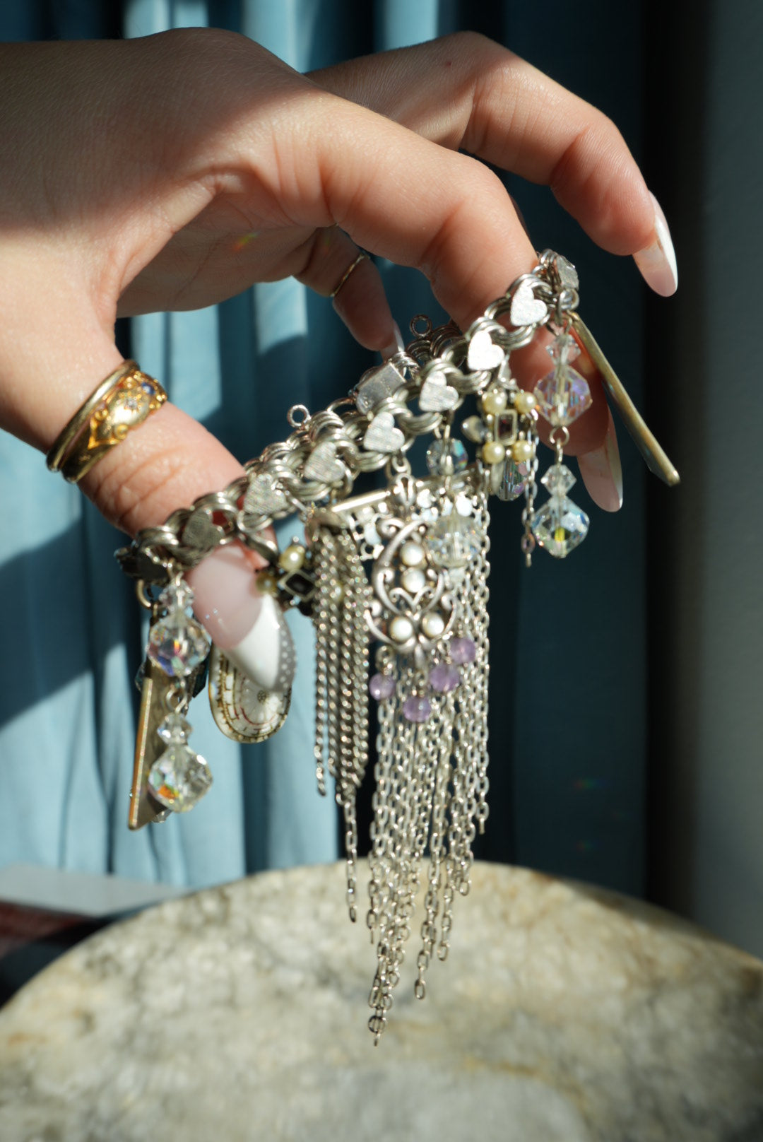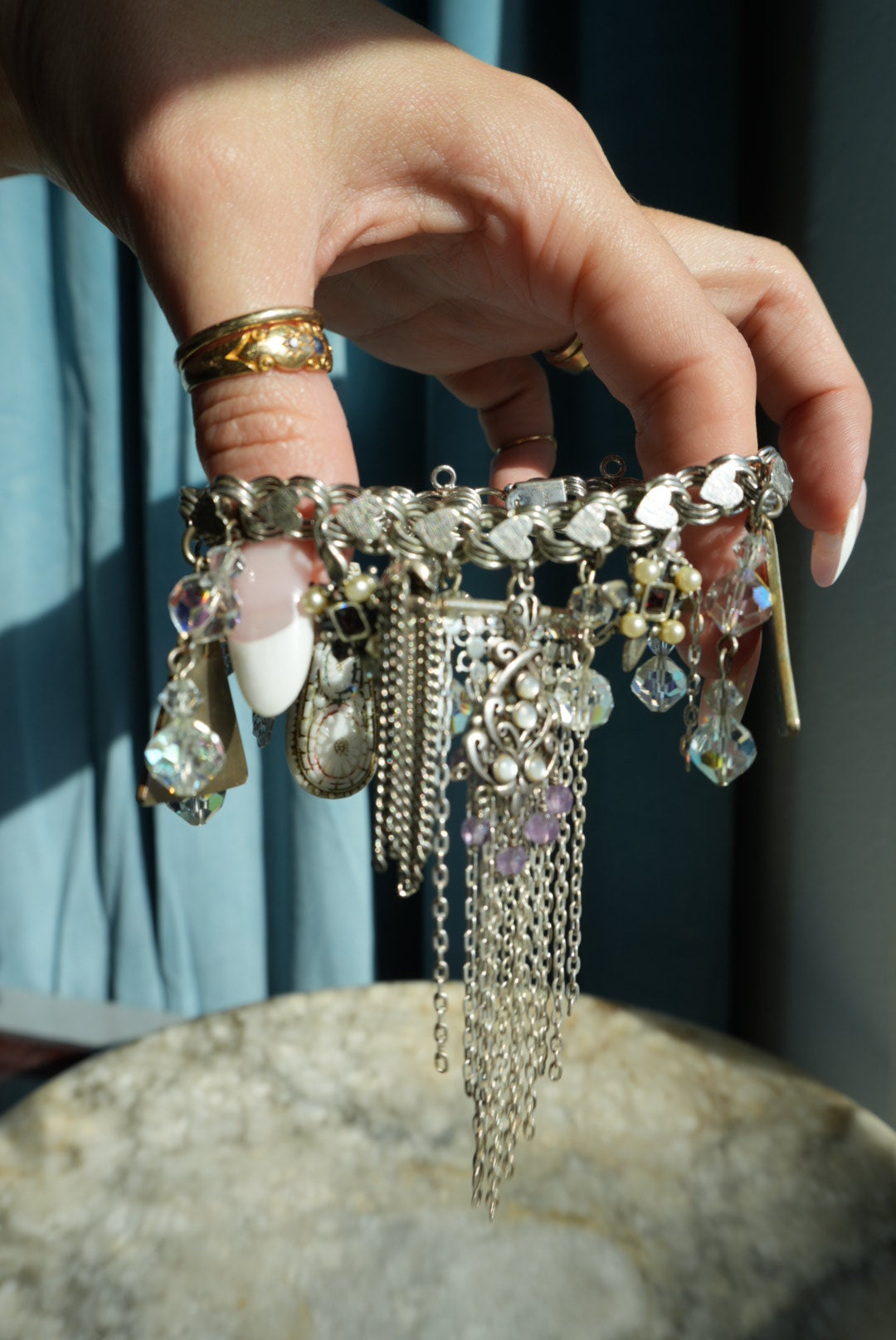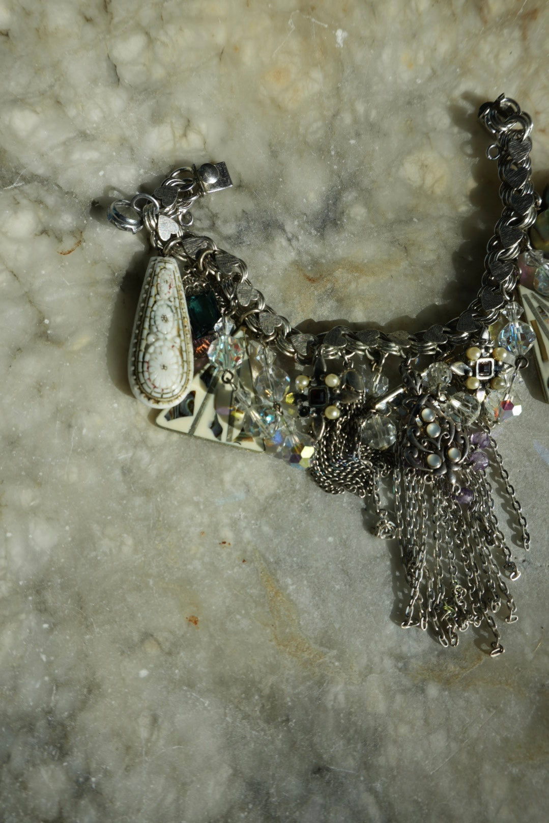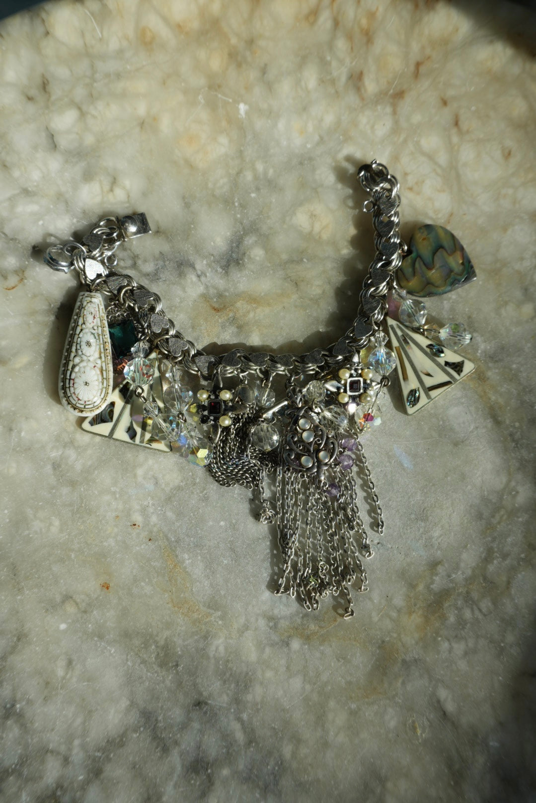 7.5 inch length sterling silver heart link charm bracelet with eclectic charms attached made from Mexican sterling, abalone and more