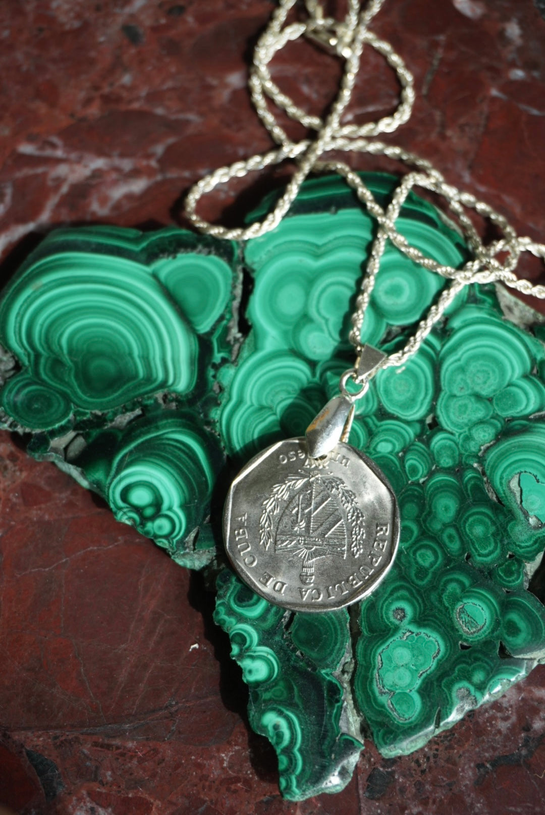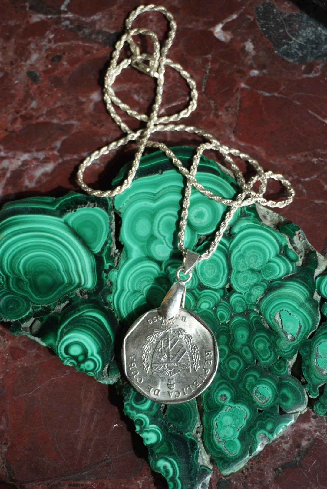 Sterling silver chain 20” length and Cuban coin reversible with one face showing Guama