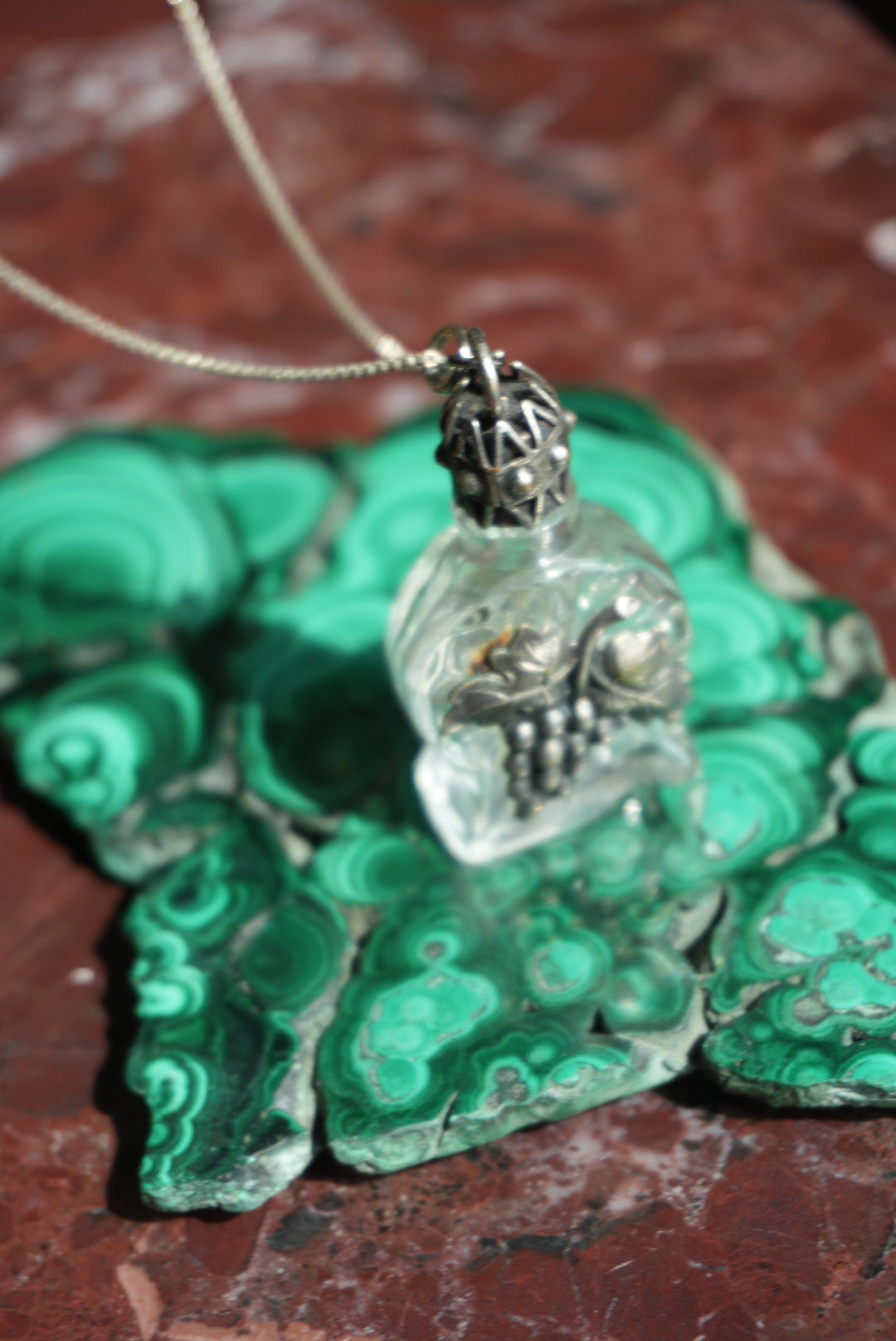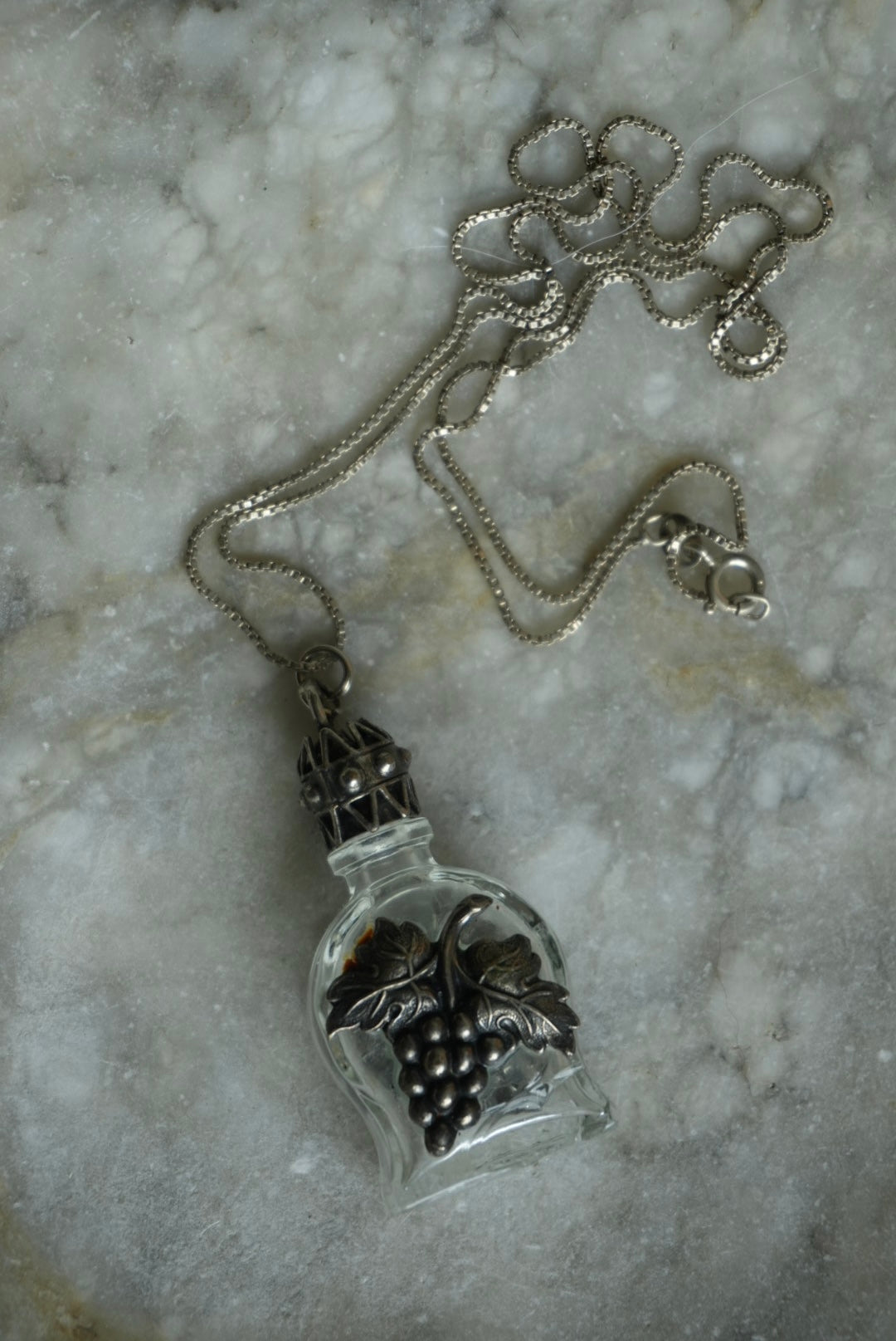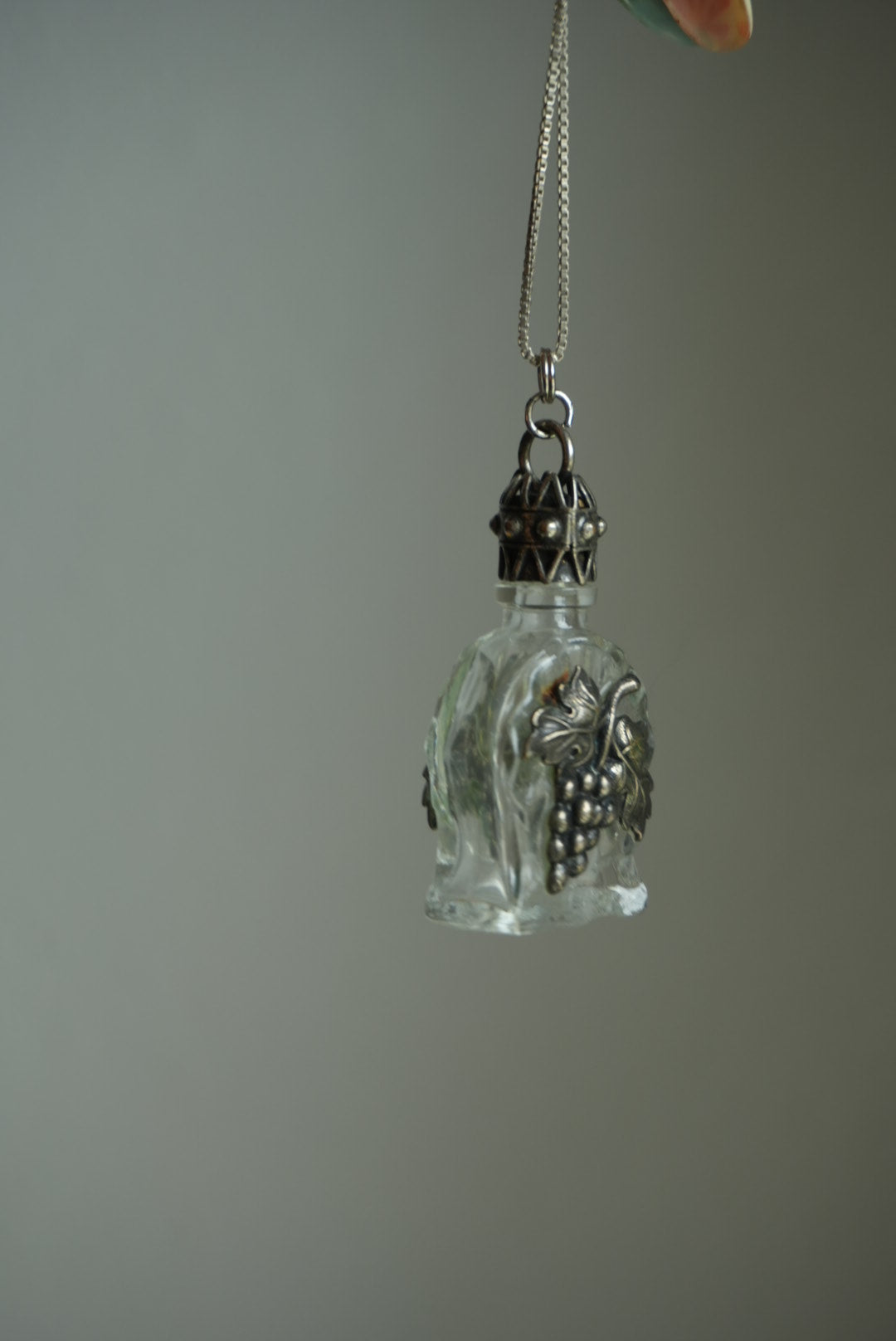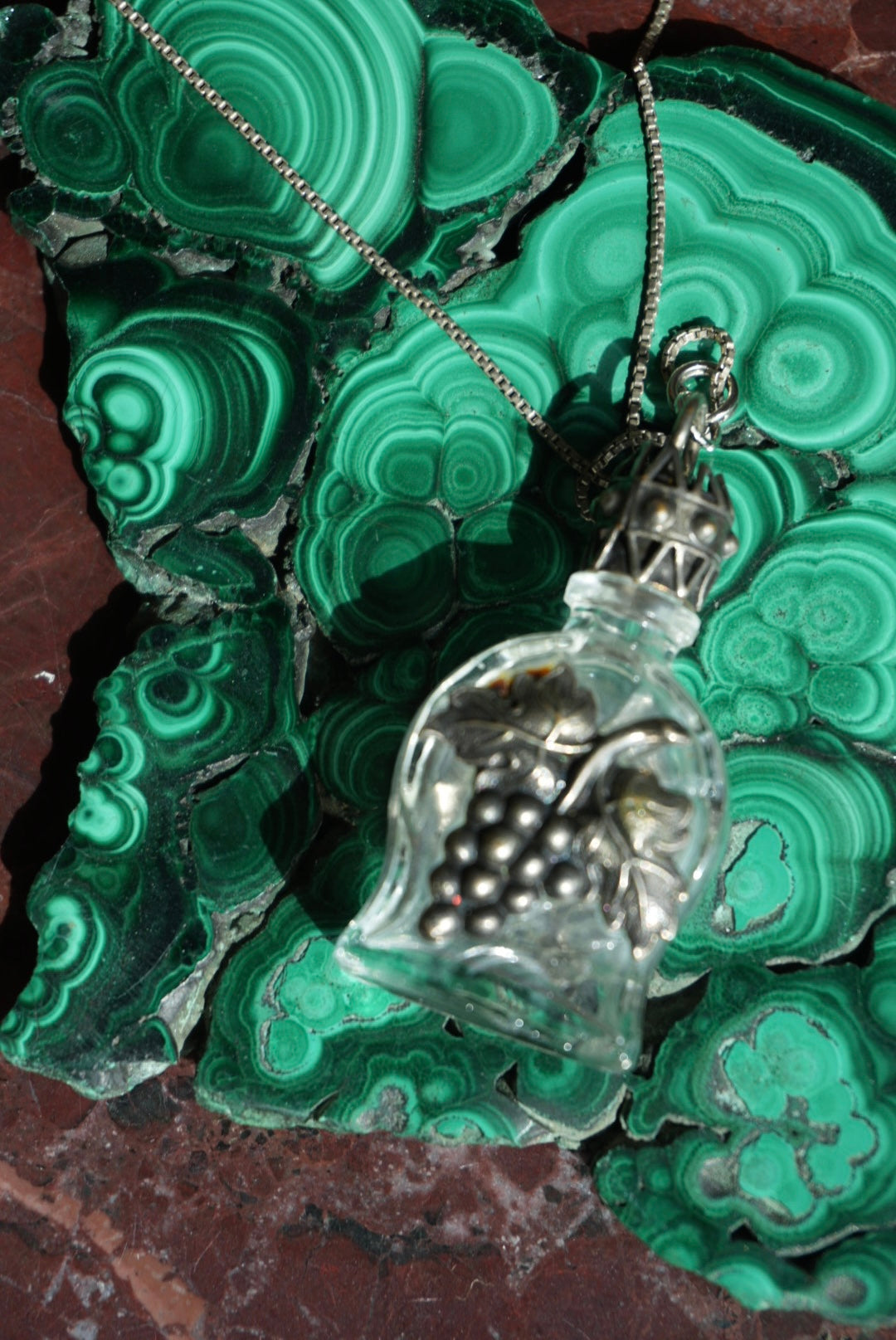 24 inch sterling silver perfume bottle necklace with grapes motif in sterling silver