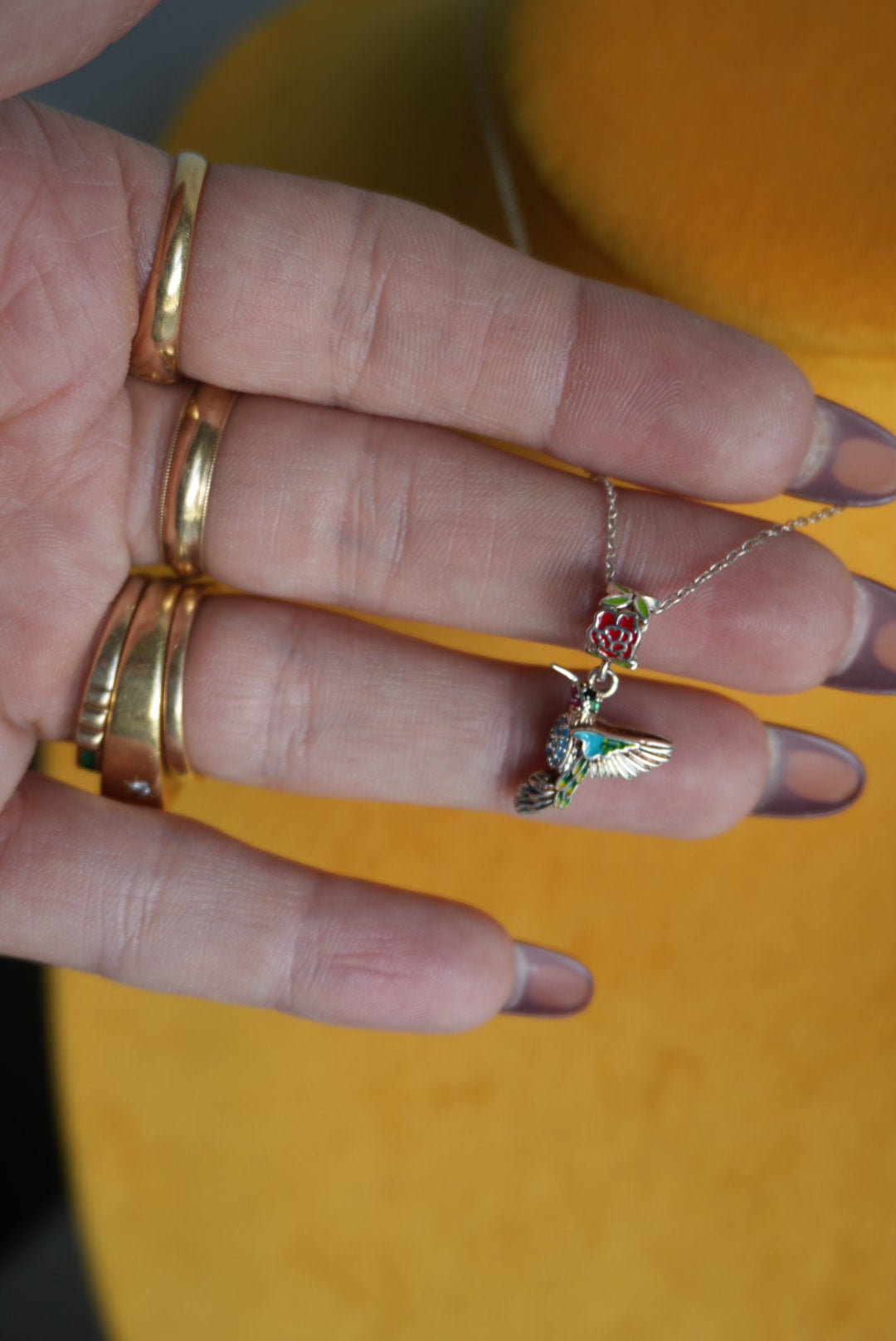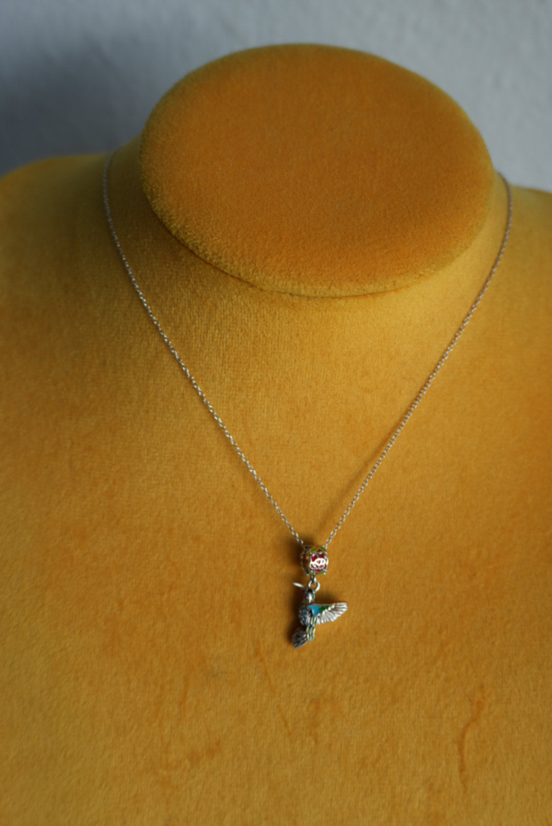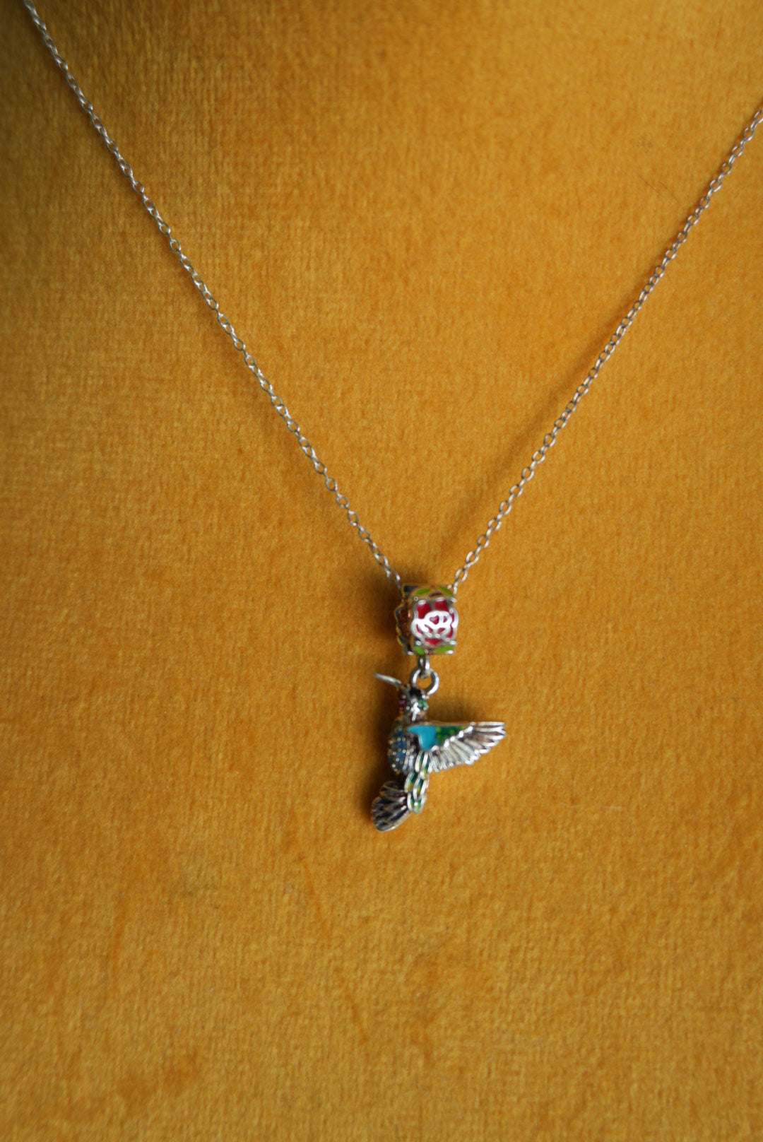 16 inch length sterling necklace and charm of sweet enamel painted hummingbird and rose bale gorgeous detail ! Glass stone pave tummy and neck
