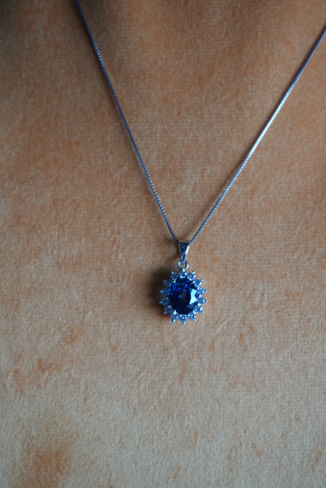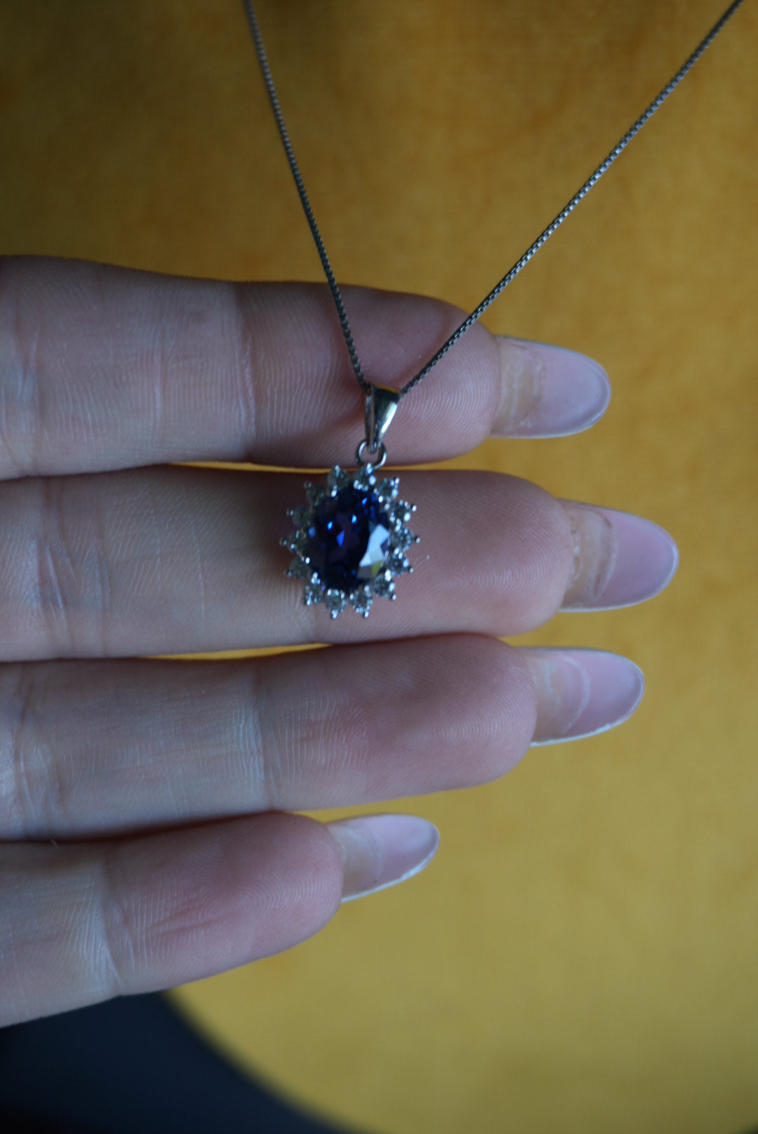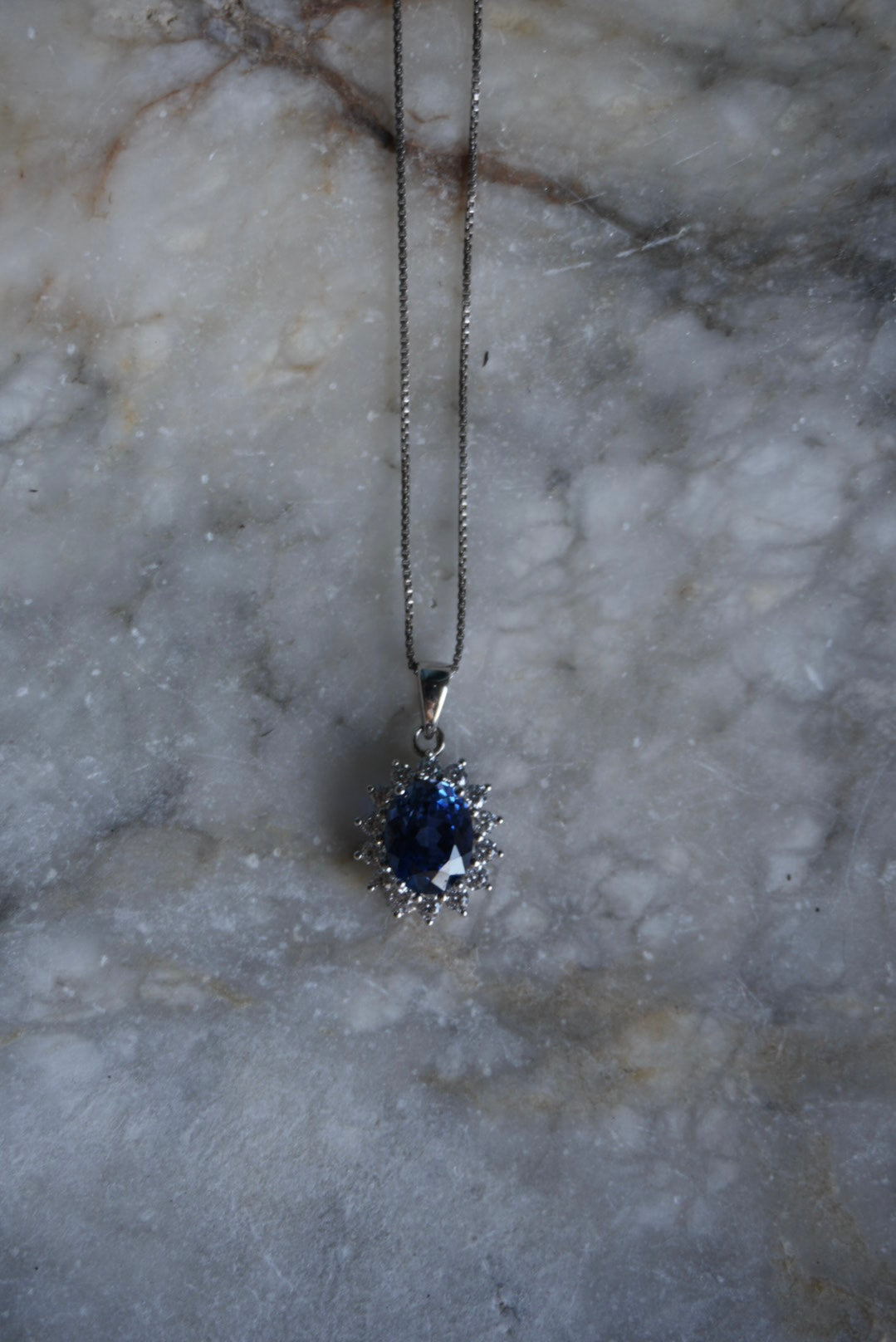 18” length sterling chain with sterling pendant. Glass stone halo and blue lab sapphire