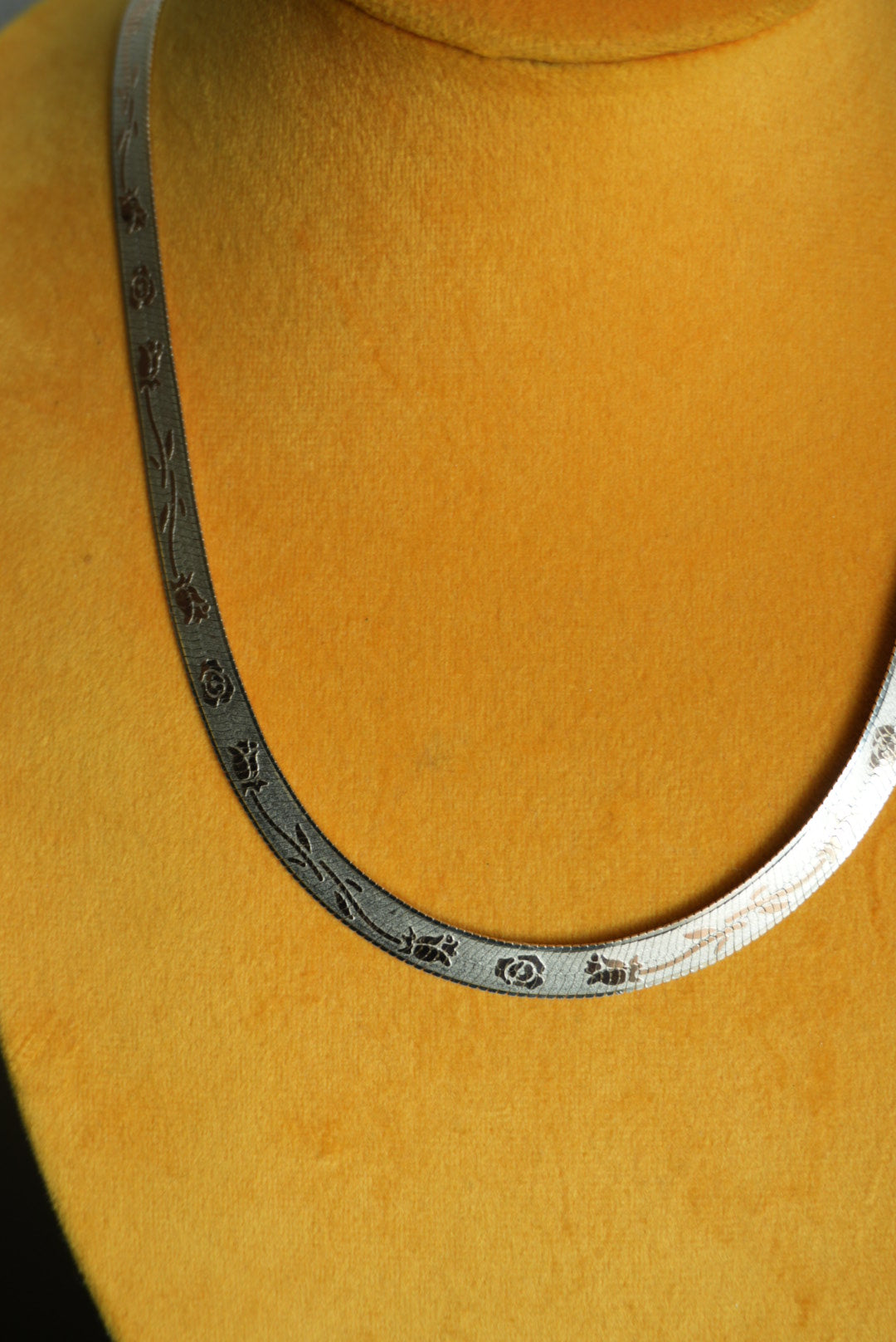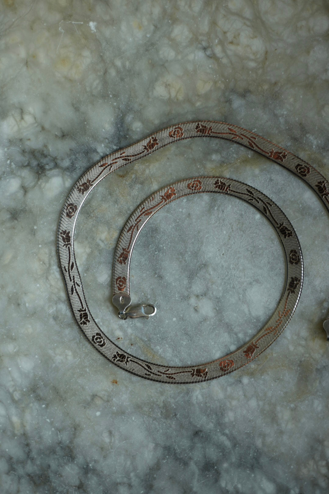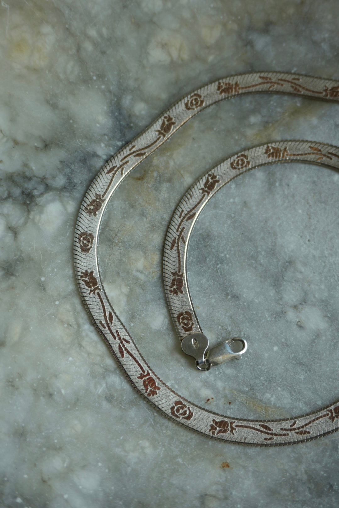 19” length sterling silver reversible herringbone necklace with one side rose gold vermeil roses