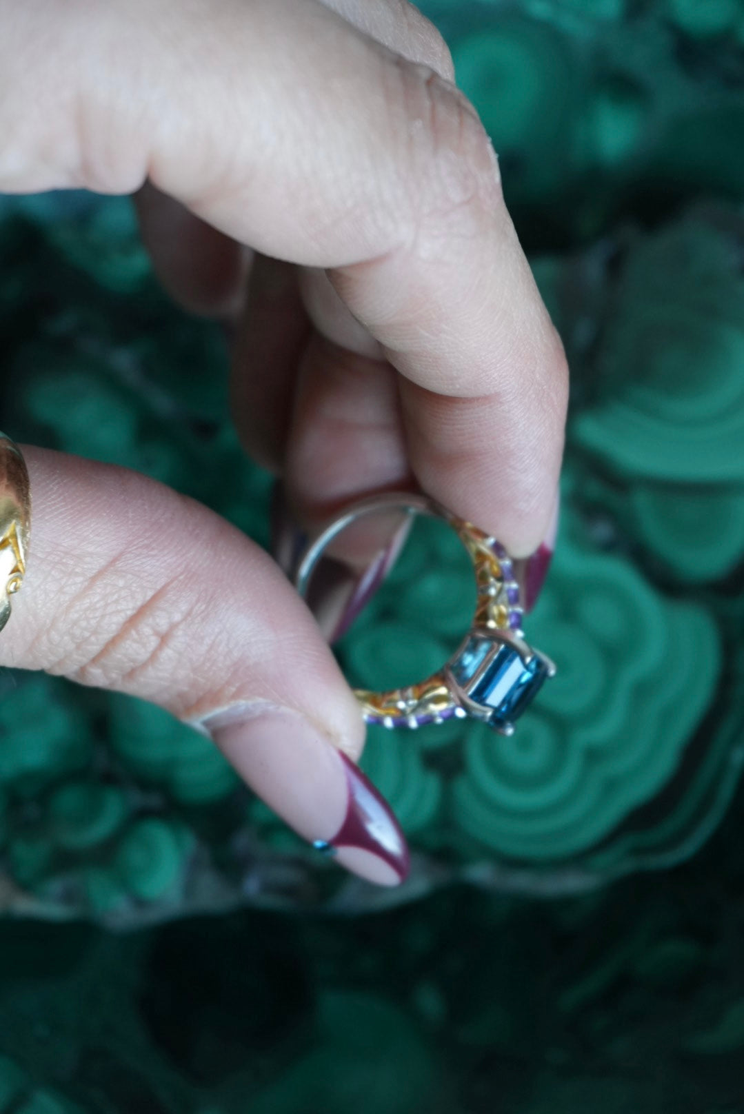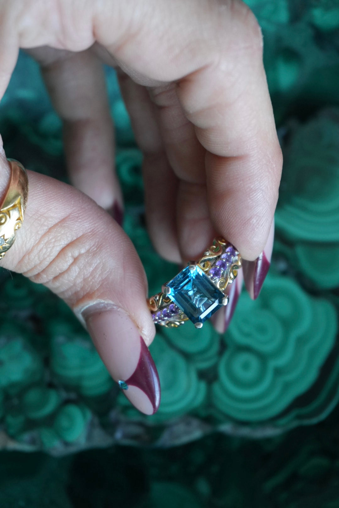 Sterling silver ring with amethyst details & a tourmaline center stone