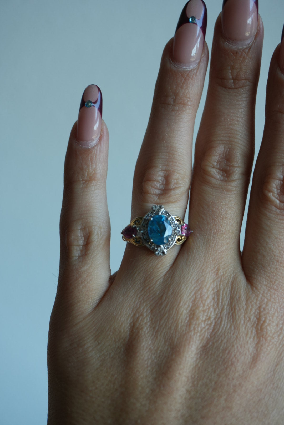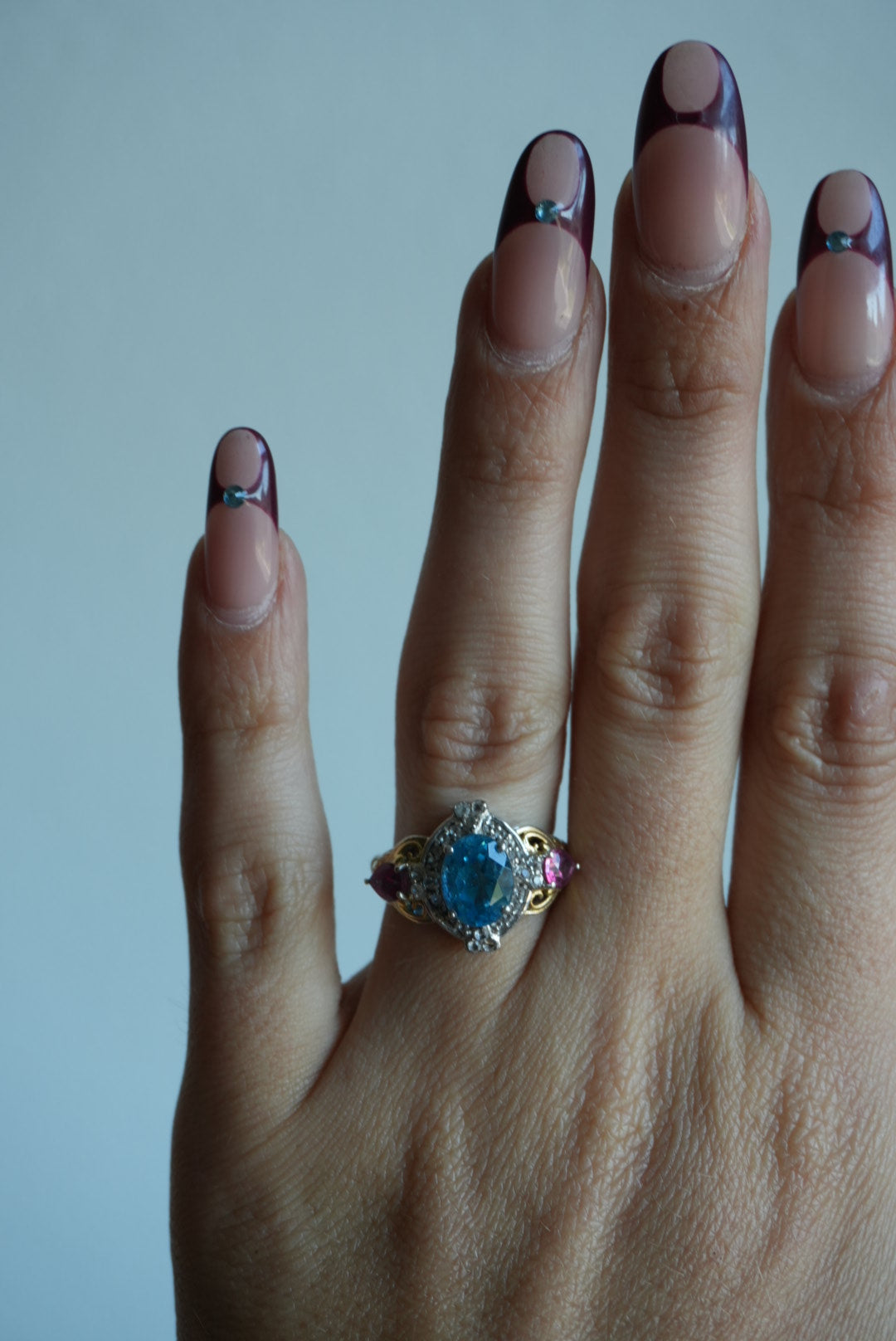 Sterling silver ring with a lab grown blue sapphire & lab grown side pink sapphires