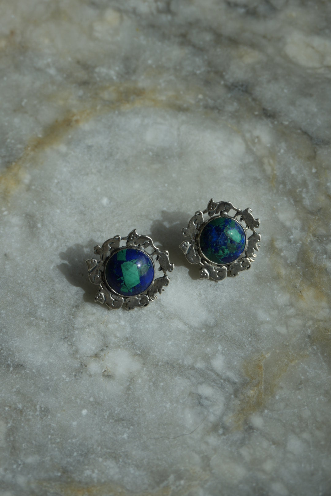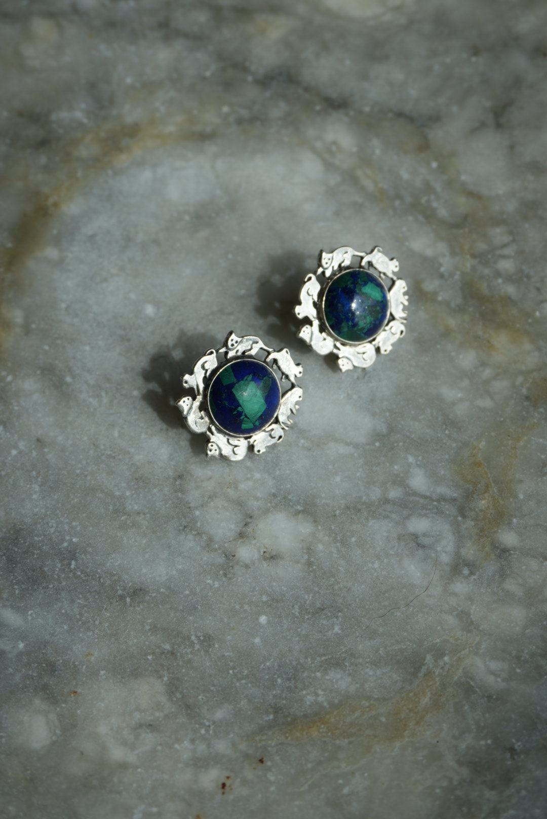 0.75 inch tall sterling silver kitties circling lapis with malachite segments