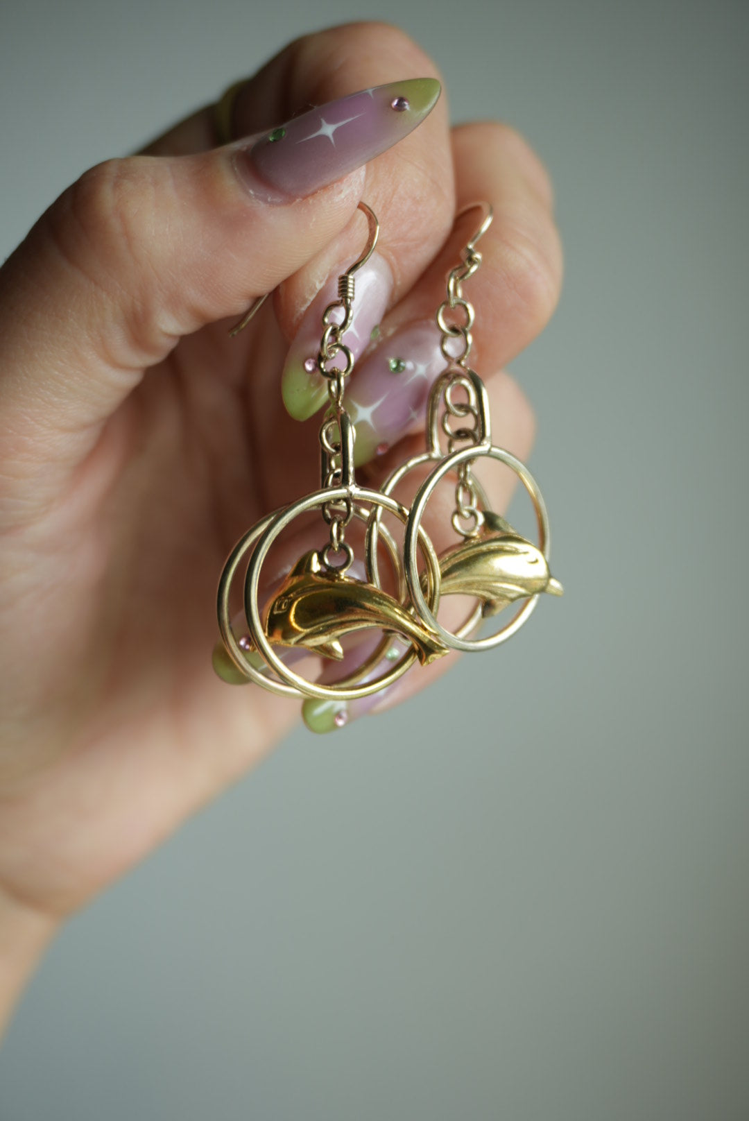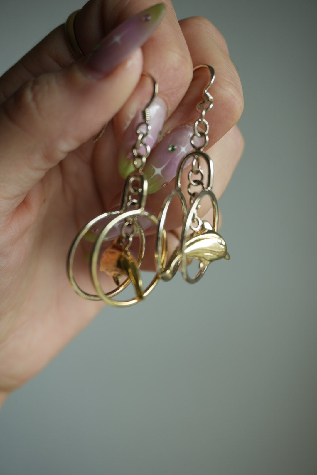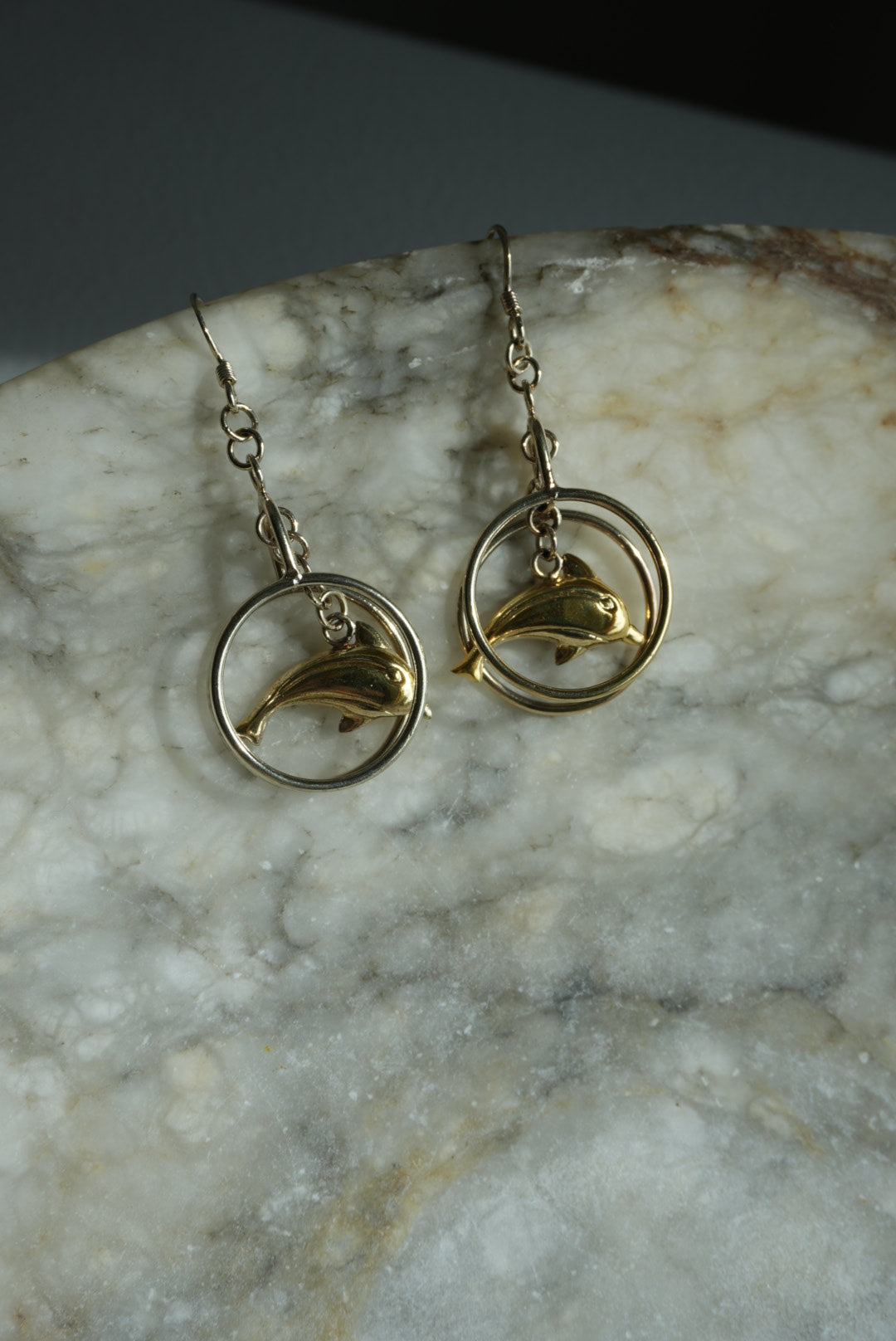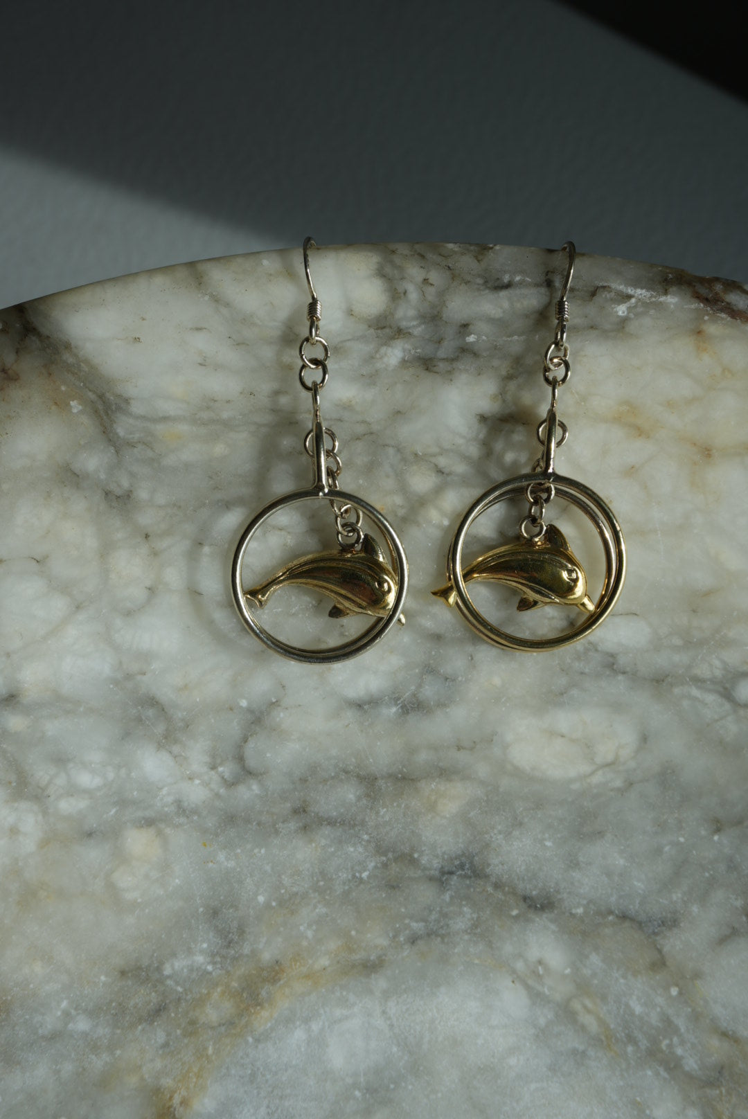 2” tall dolphin earrings jump in a hoop !! silver and gold vermeil